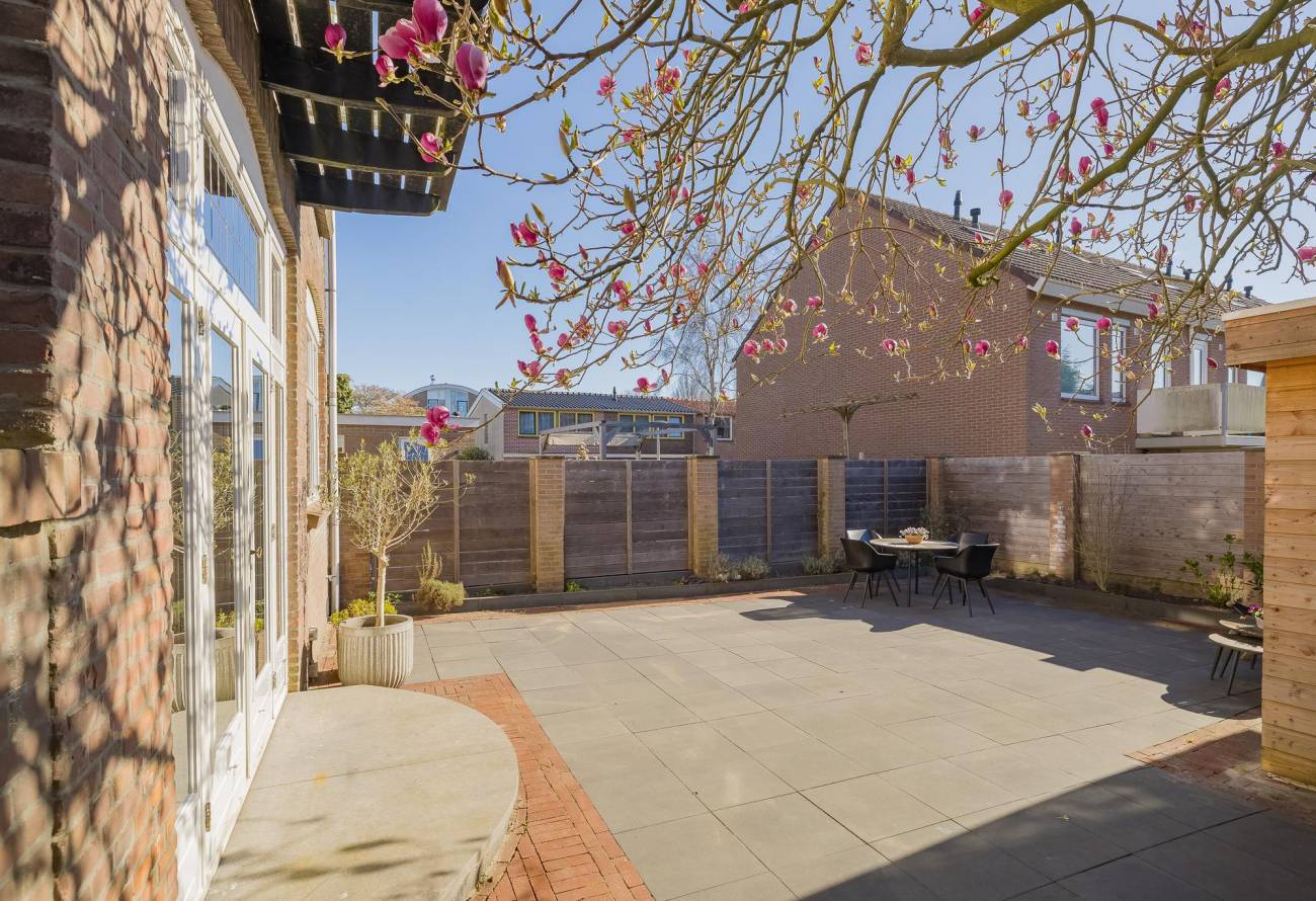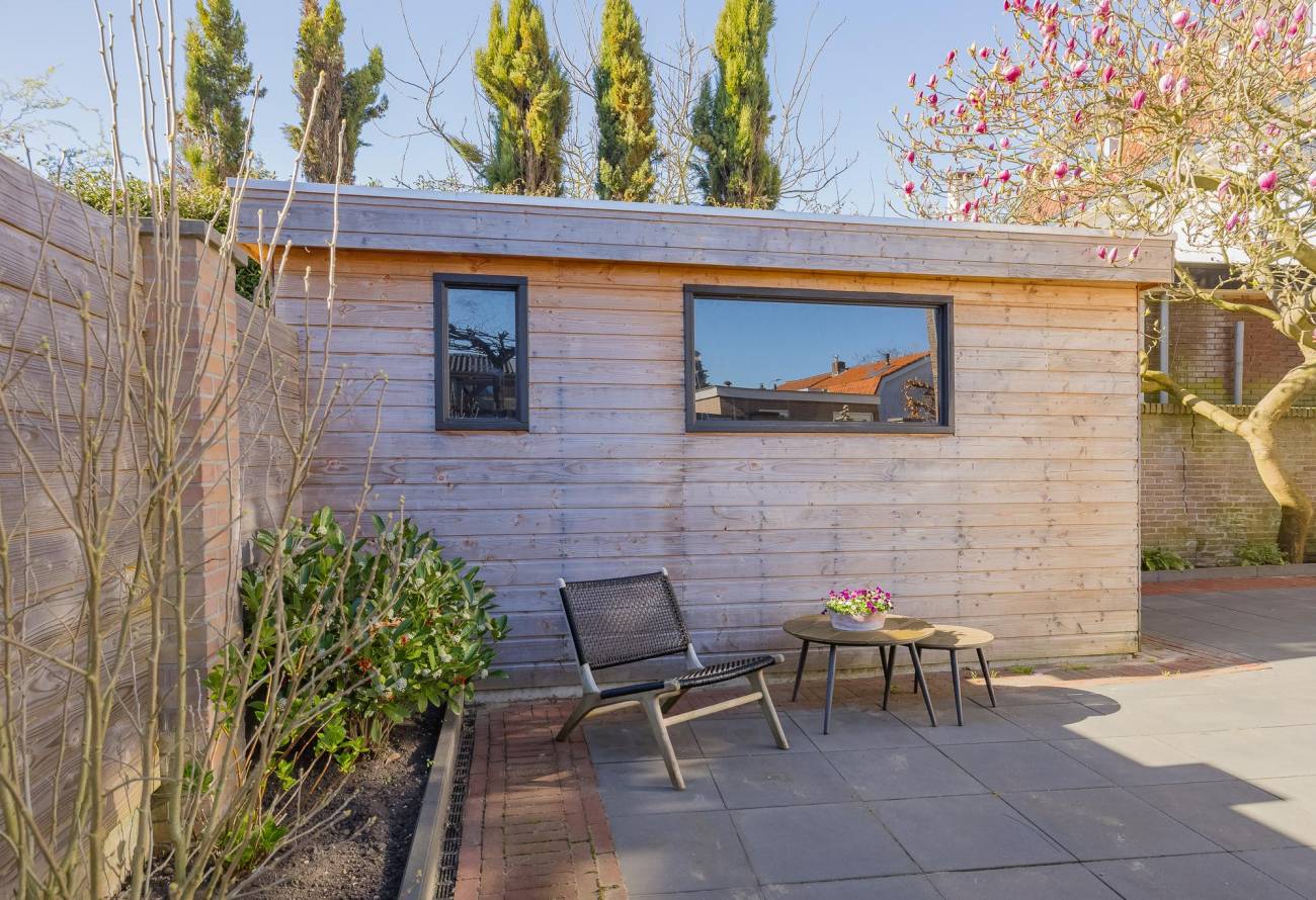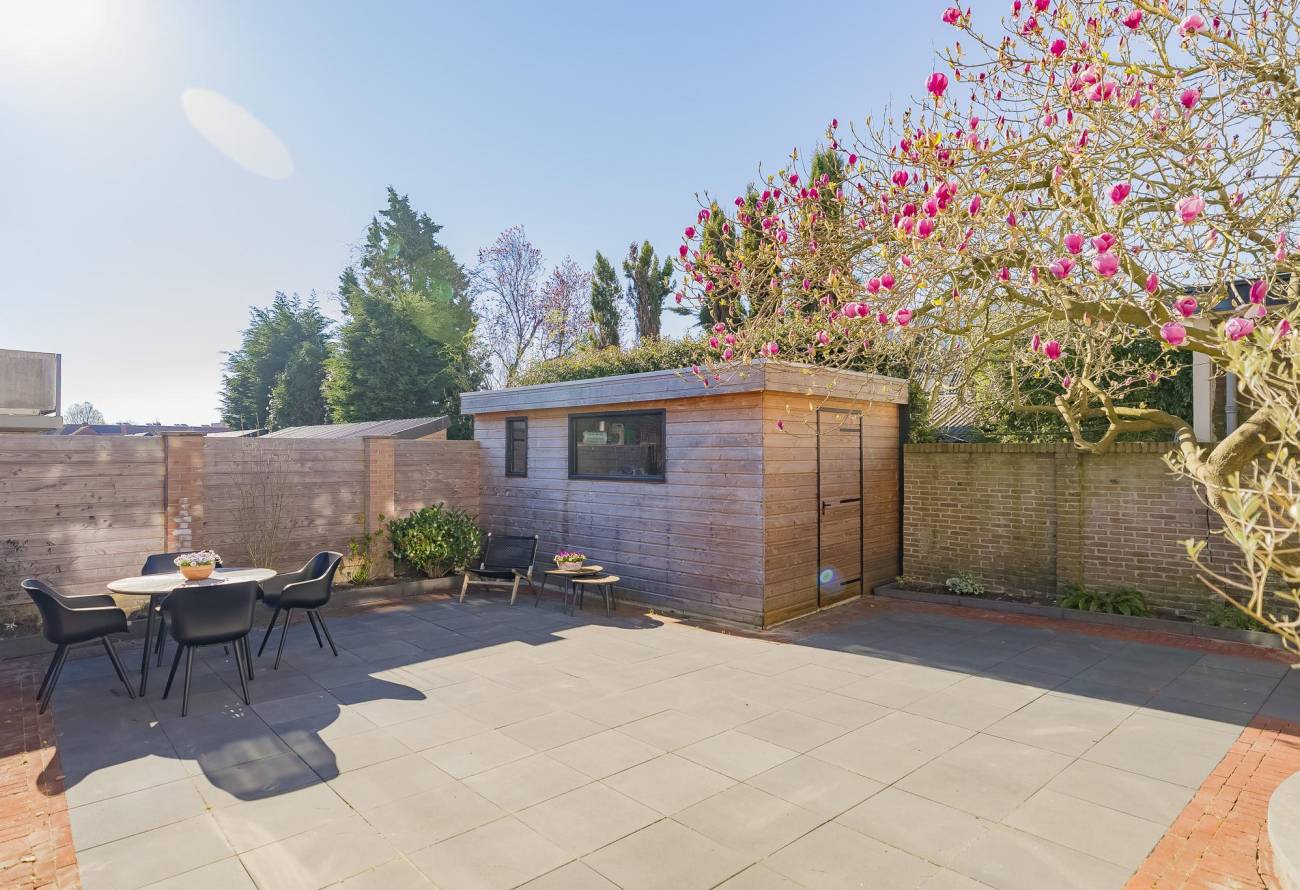 achtertuin is circa 8.35 meter diep en 8.85 breed en ligt op het Zuidoosten. Er is een achterom via de oprit langs de woning en er is een grote nieuwe houten berging.