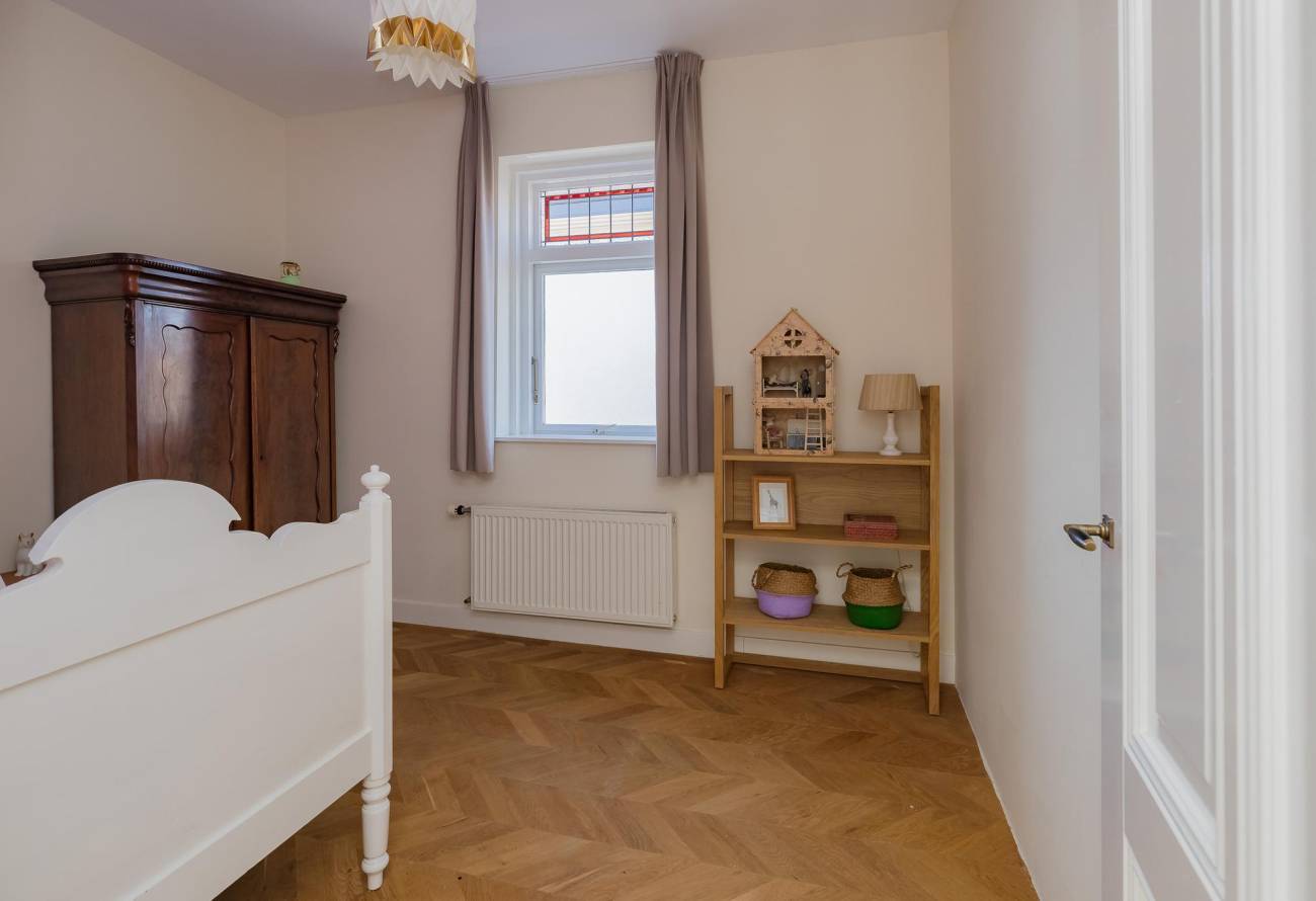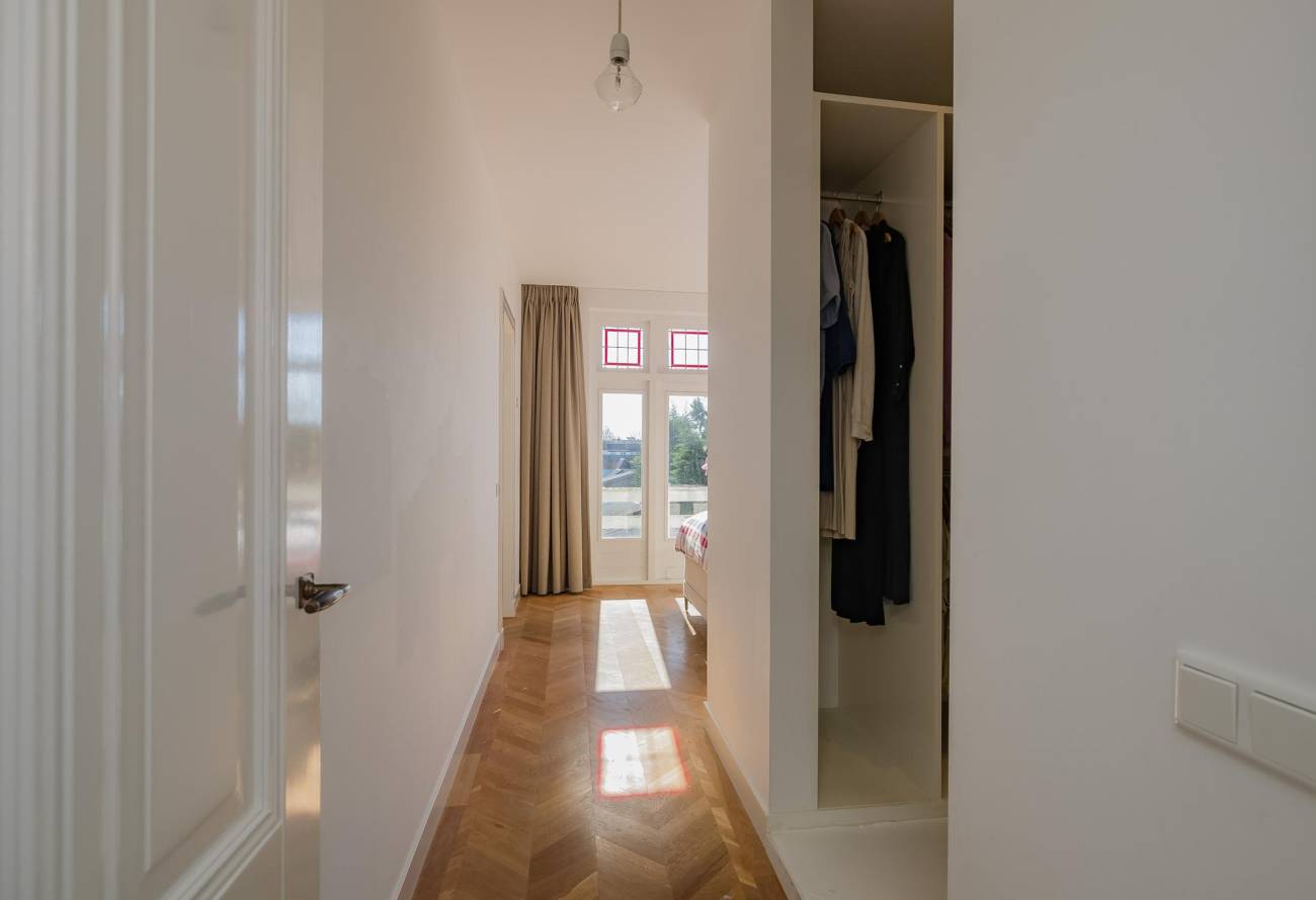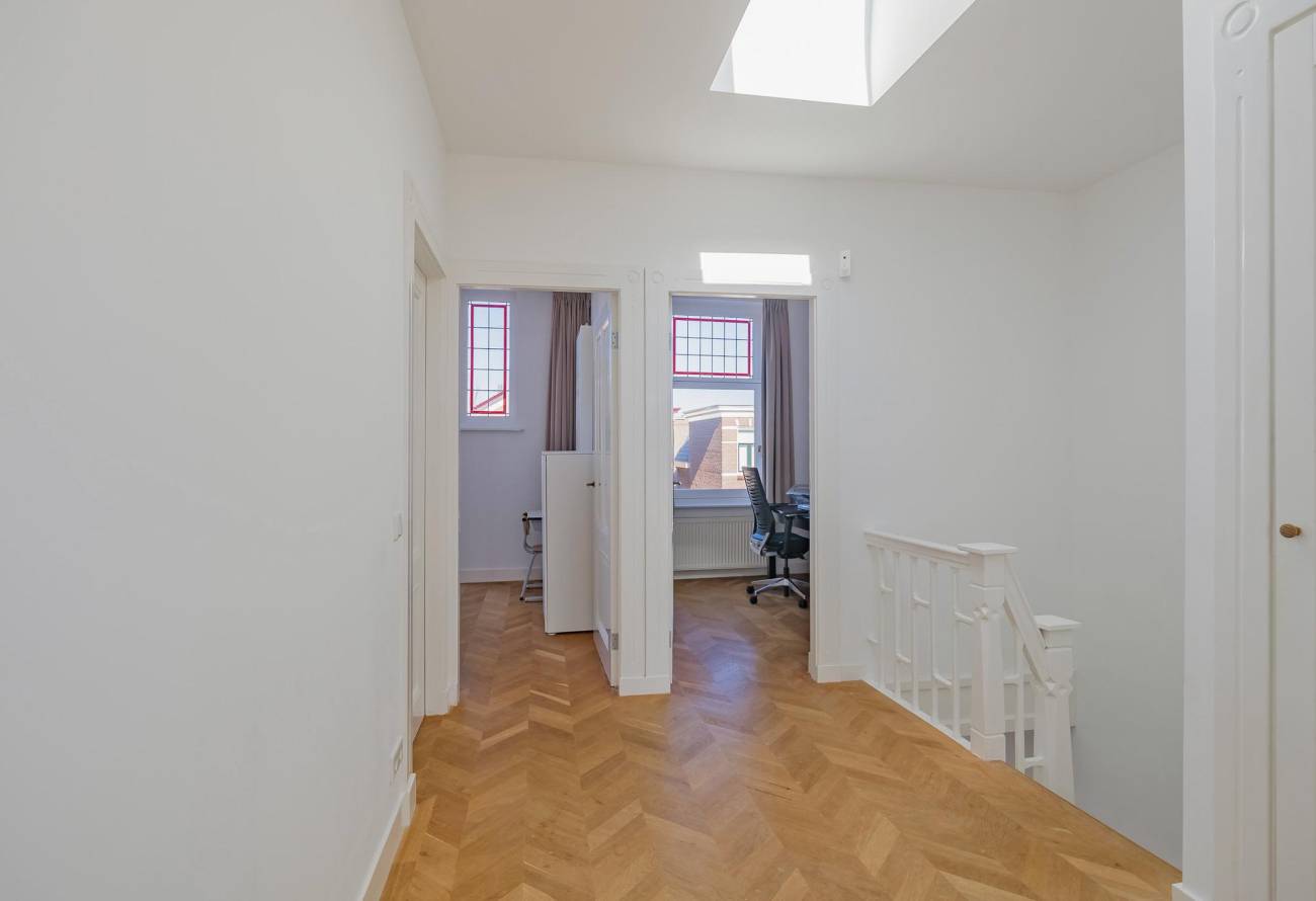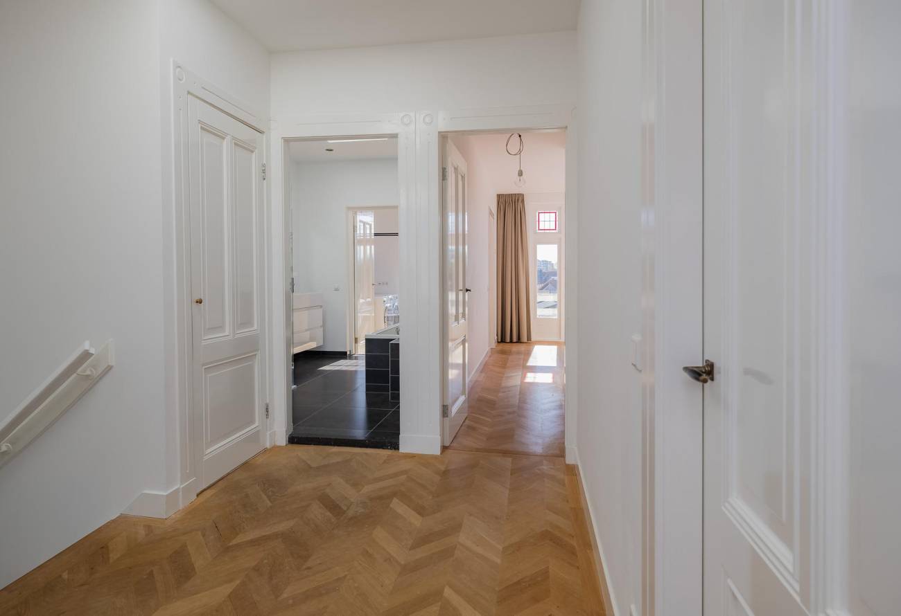 Overloop met groot daklicht, modern toilet, 1 ruime slaapkamer met dubbele deuren naar balkon en 1 kleinere slaap(werk)kamer aan voorzijde. Verder is er een 3e slaapkamer, 4e hoofdslaapkamer met riante inloopgarderobe en waskamer. De moderne badkamer is aan twee zijden bereikbaar en voorzien van een ligbad, grote douchecabine met hardglazen deur en brede wastafel met twee kranen in meubel. Ook in de badkamer is een groot daklicht. In alle kamers ligt een eikenhouten vloer in Hongaarse punt met uitzondering van de badkamer welke is betegeld met een antracietkleurige vloertegel.