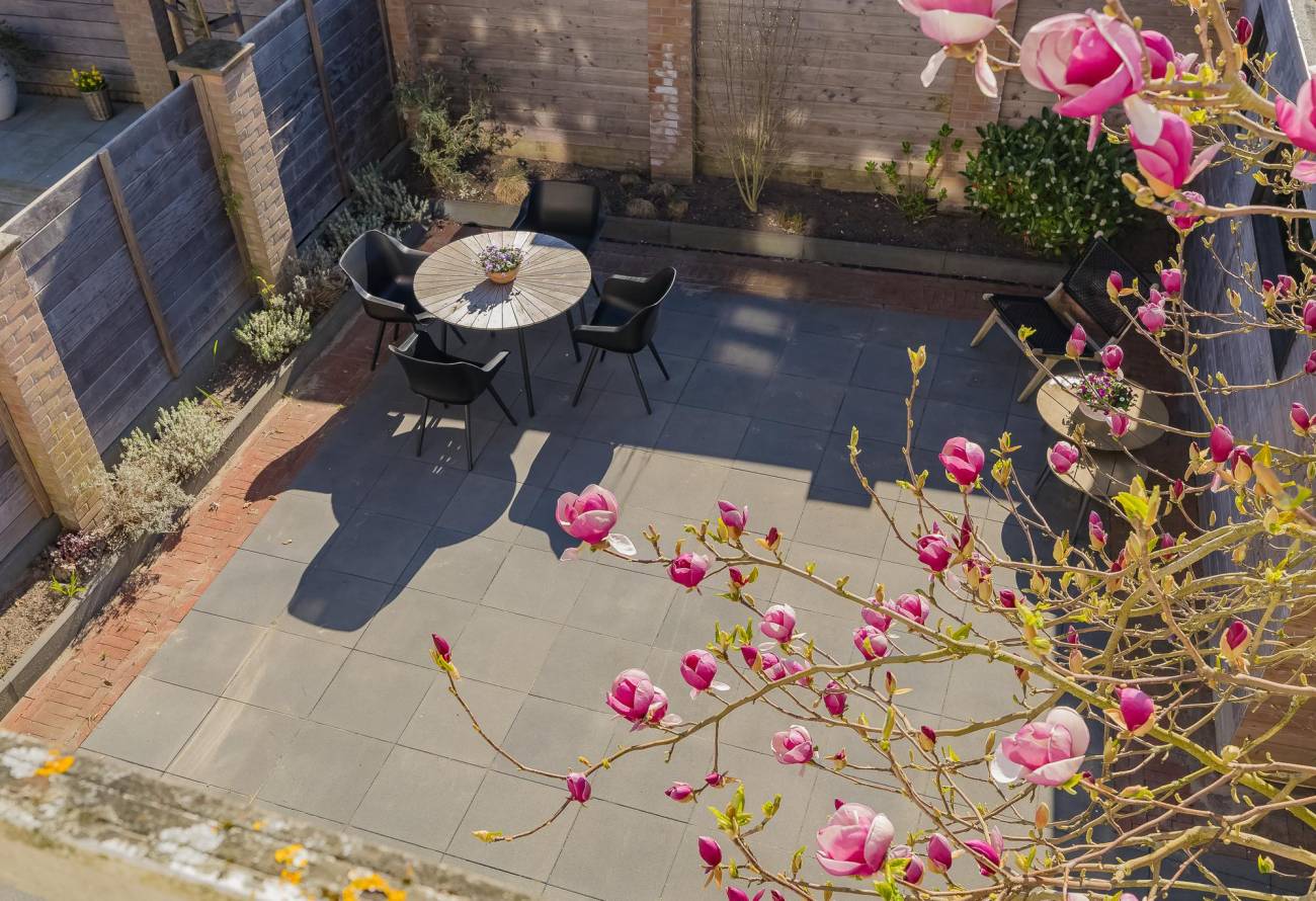De goed aangelegde, grotendeels onderhoudsvrije tuin is betegeld en met borders omzoomd. De