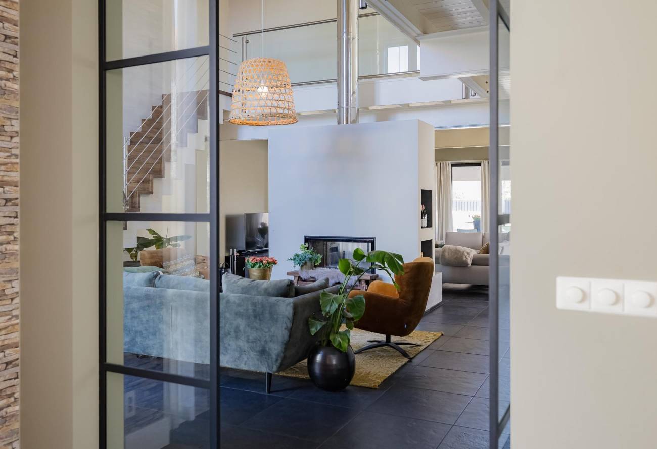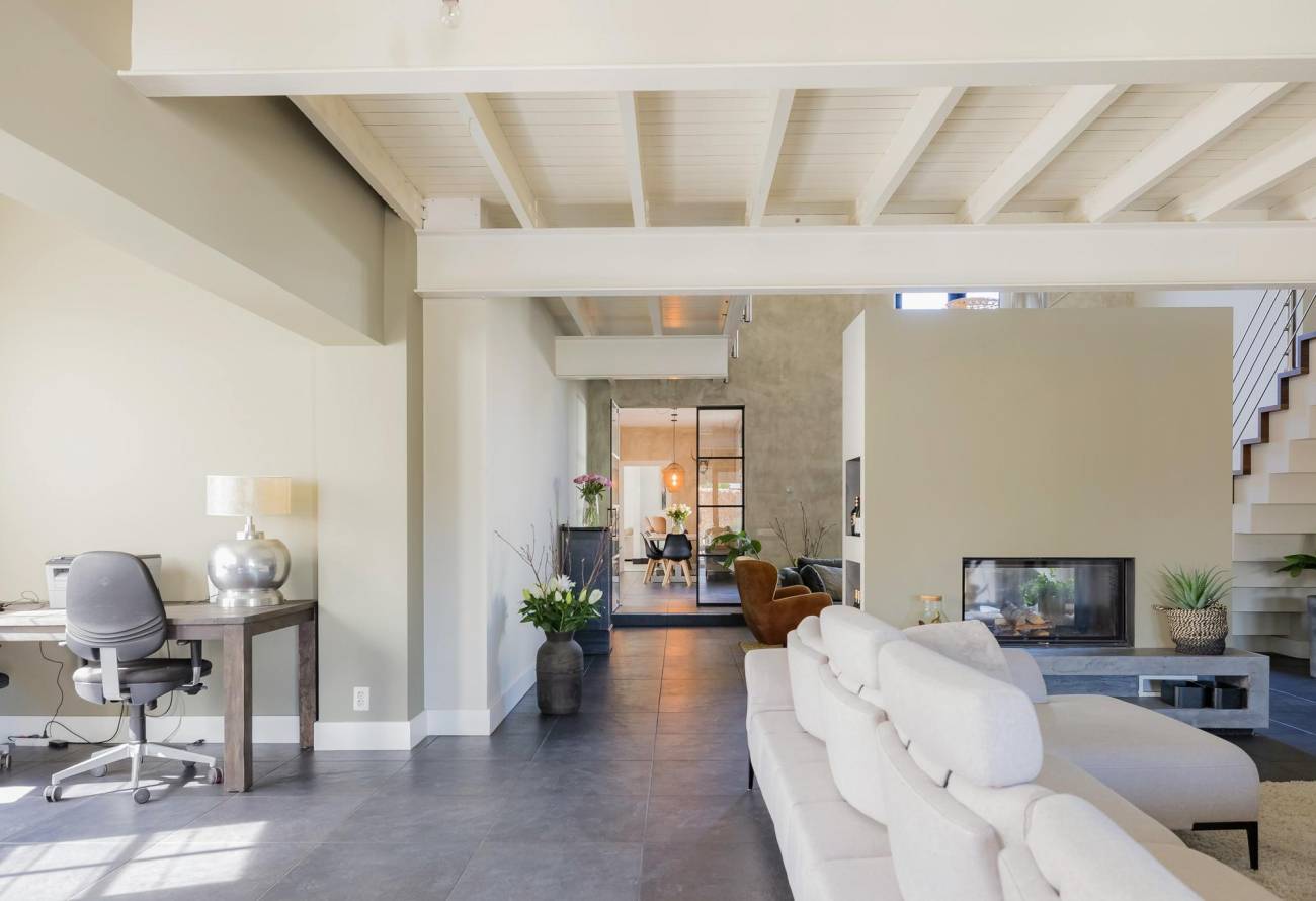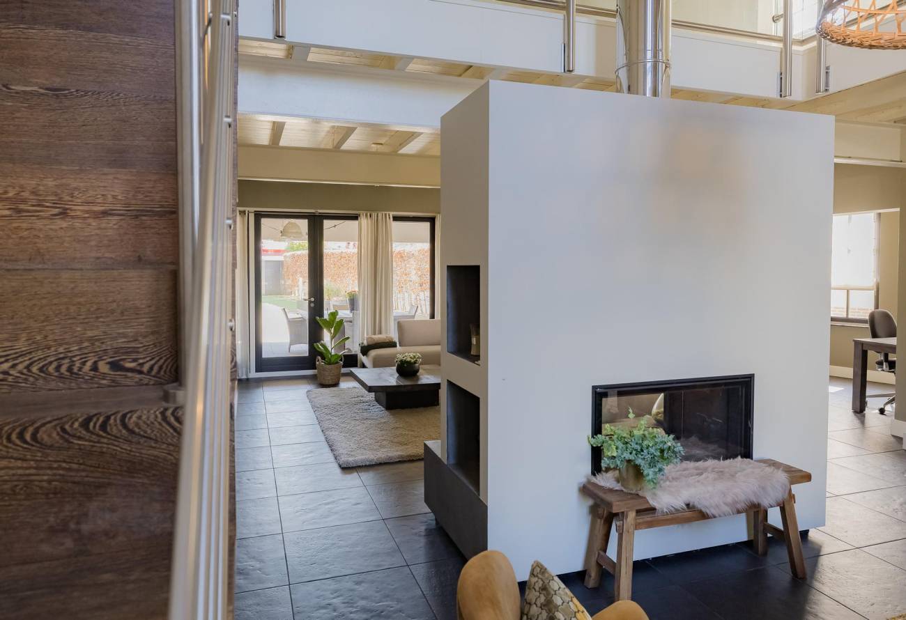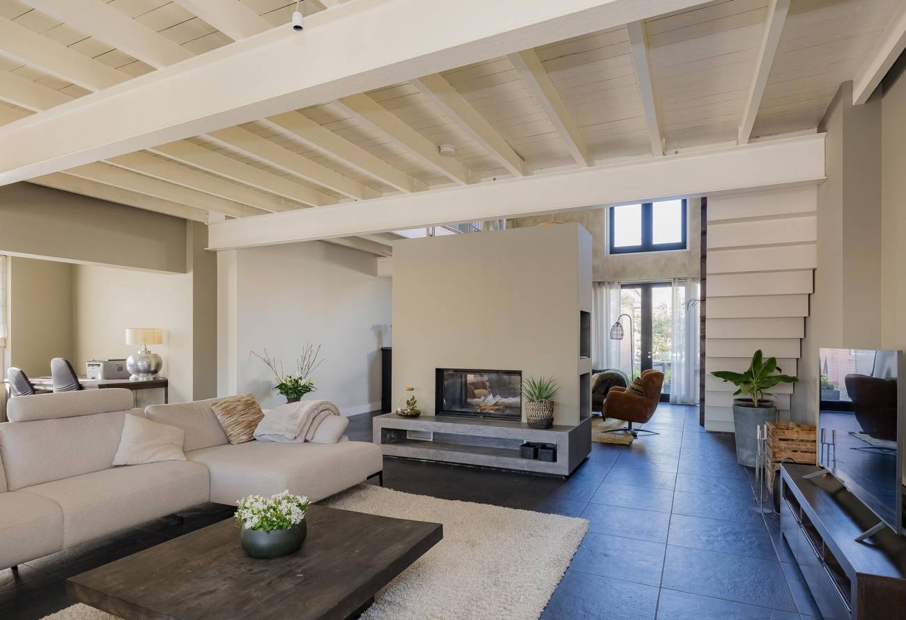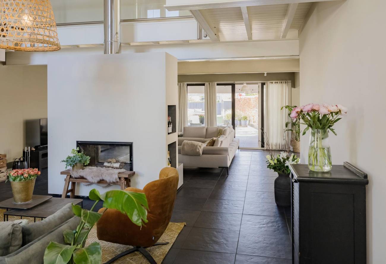 De oude bollenschuur is rondom geïsoleerd en verbouwd tot living. De riante woonkamer met vide en open haard is aan de ene zijde met een hoge stalen deur afgesloten van de keuken en aan de andere zijden geven openslaande deuren toegang tot de veranda en de zonnige tuin. Een roomdevider deelt de grote ruimte in 2 gezellige zitgedeeltes. Genoeg ruimte voor het hele gezin.