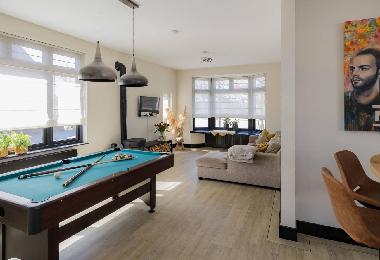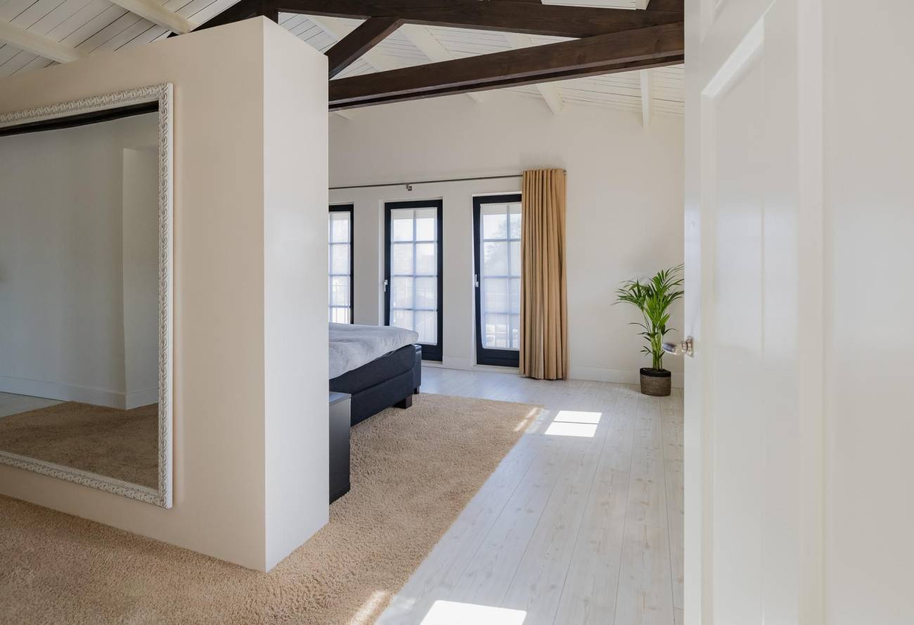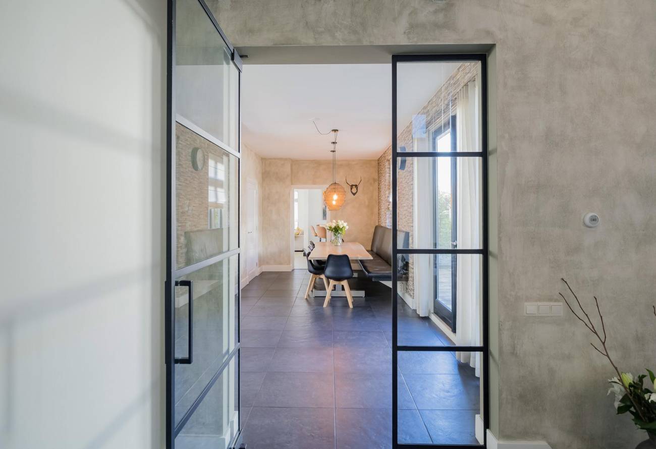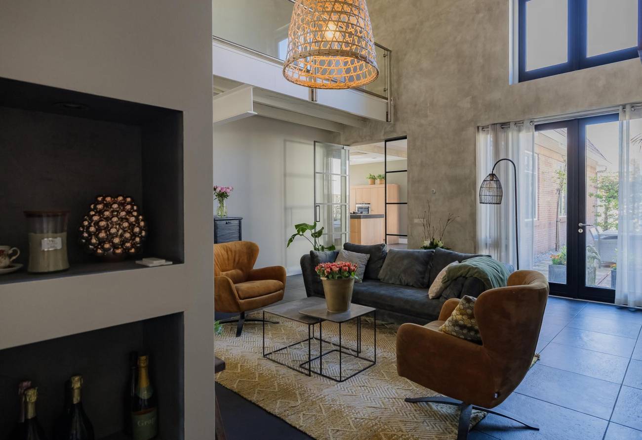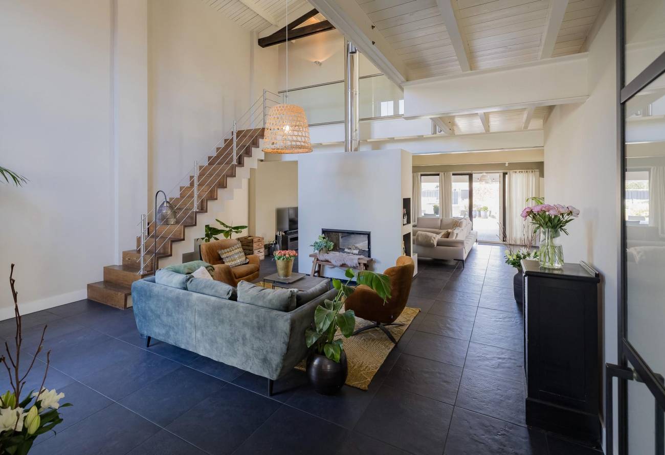 De oude bollenschuur is rondom geïsoleerd en verbouwd tot living. De riante woonkamer met vide en open haard is aan de ene zijde met een hoge stalen deur afgesloten van de keuken en aan de andere zijden geven openslaande deuren toegang tot de veranda en de zonnige tuin. Een roomdevider deelt de grote ruimte in 2 gezellige zitgedeeltes. Genoeg ruimte voor het hele gezin.