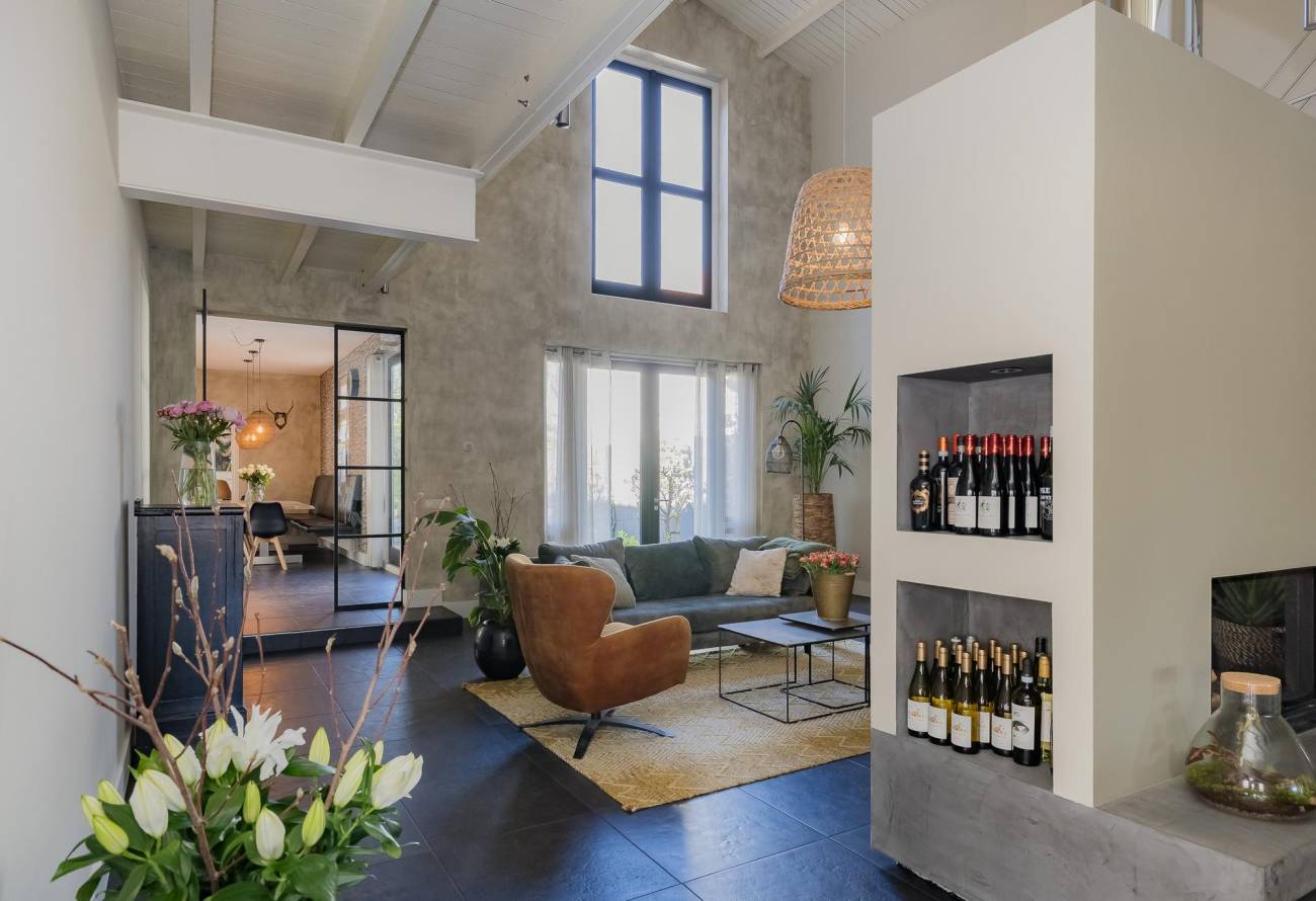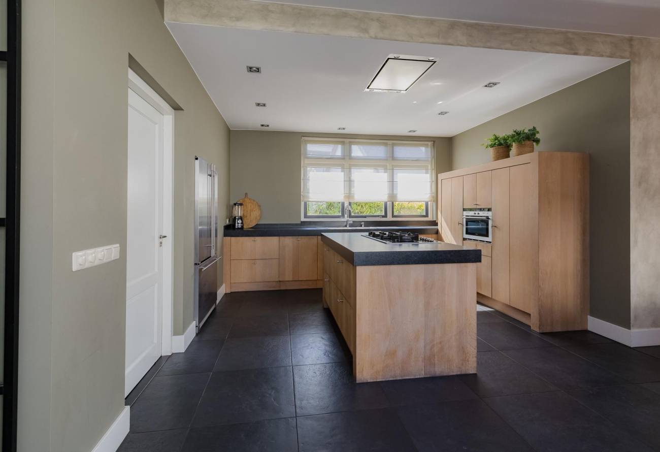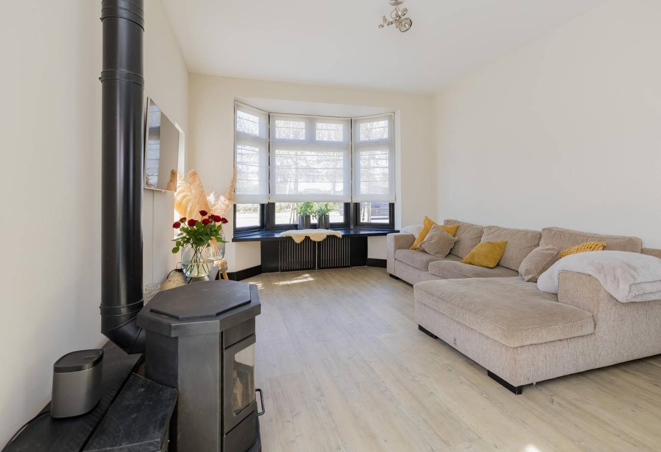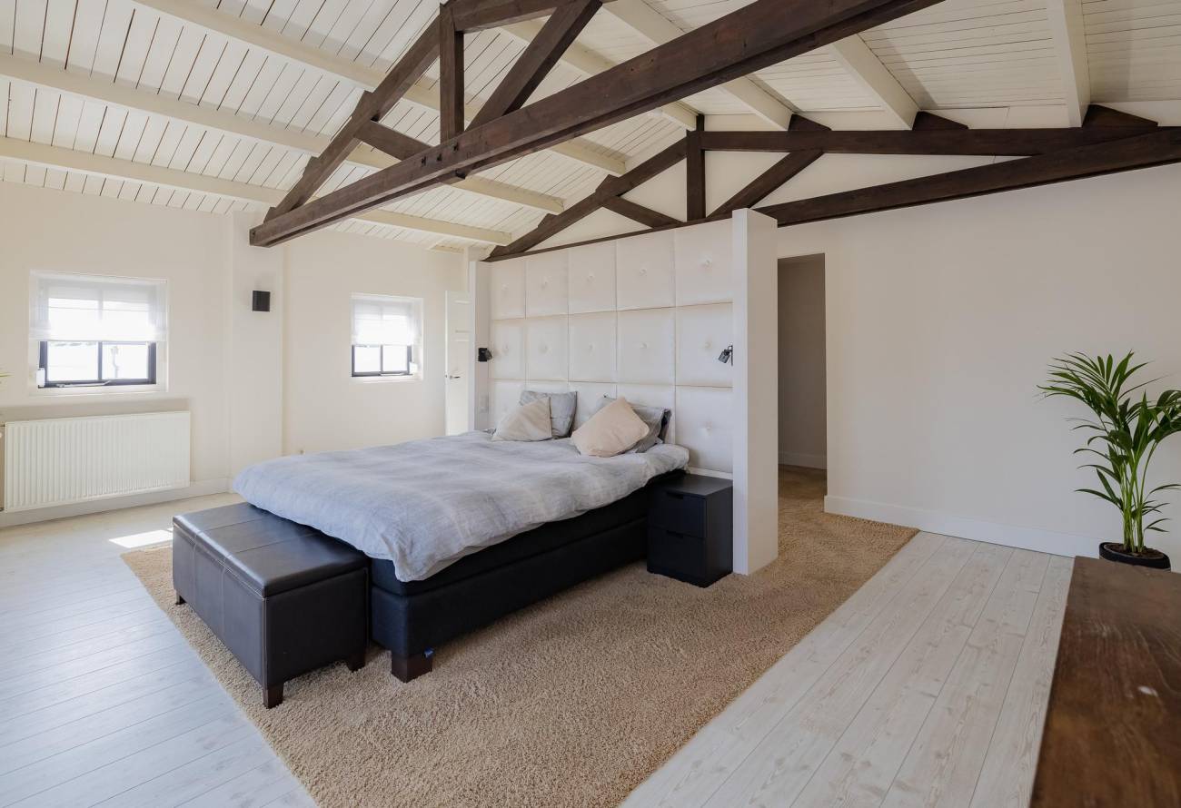 De oude bollenschuur is rondom geïsoleerd en verbouwd tot living. De riante woonkamer met vide en open haard is aan de ene zijde met een hoge stalen deur afgesloten van de keuken en aan de andere zijden geven openslaande deuren toegang tot de veranda en de zonnige tuin. Een roomdevider deelt de grote ruimte in 2 gezellige zitgedeeltes. Genoeg ruimte voor het hele gezin.
