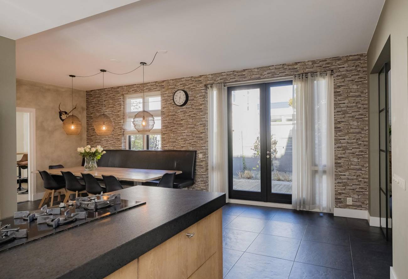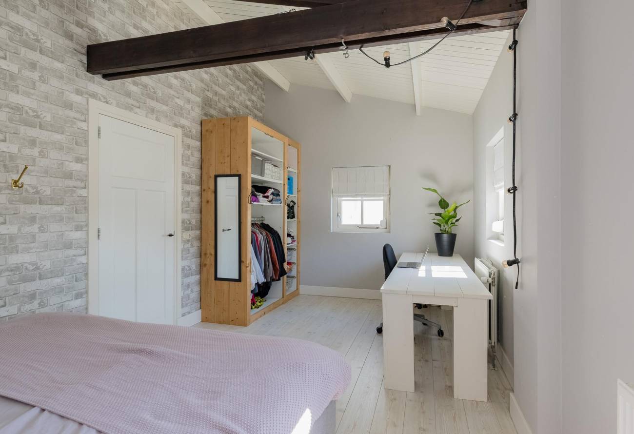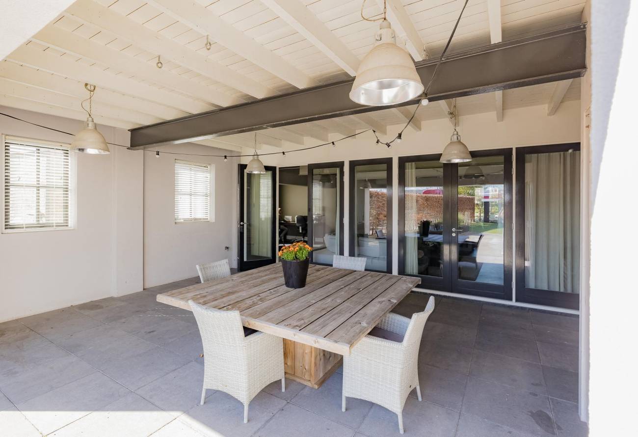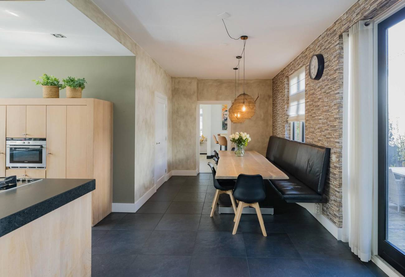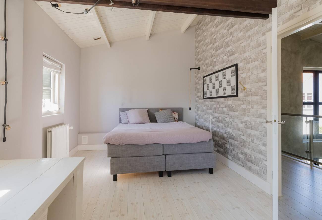 De oude bollenschuur is rondom geïsoleerd en verbouwd tot living. De riante woonkamer met vide en open haard is aan de ene zijde met een hoge stalen deur afgesloten van de keuken en aan de andere zijden geven openslaande deuren toegang tot de veranda en de zonnige tuin. Een roomdevider deelt de grote ruimte in 2 gezellige zitgedeeltes. Genoeg ruimte voor het hele gezin.