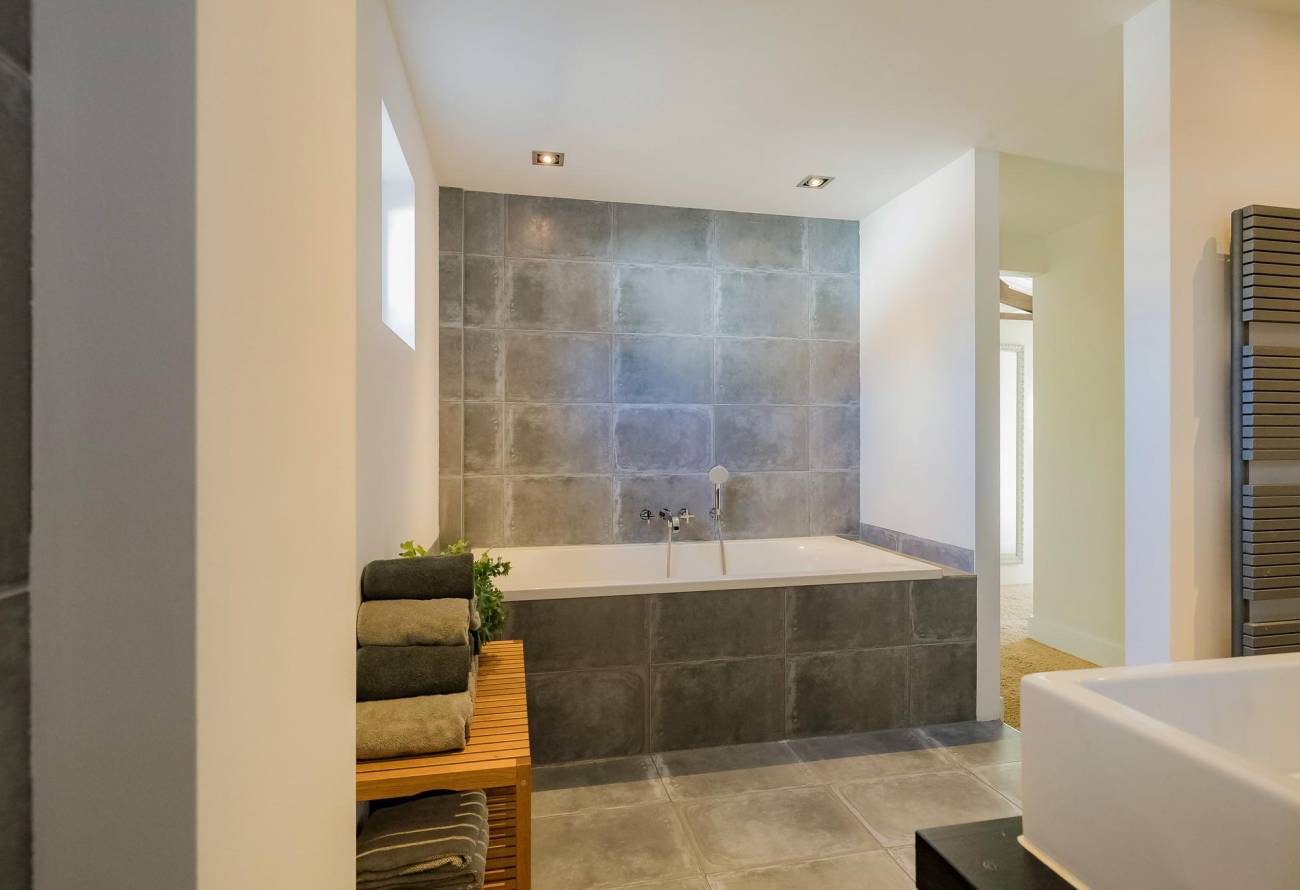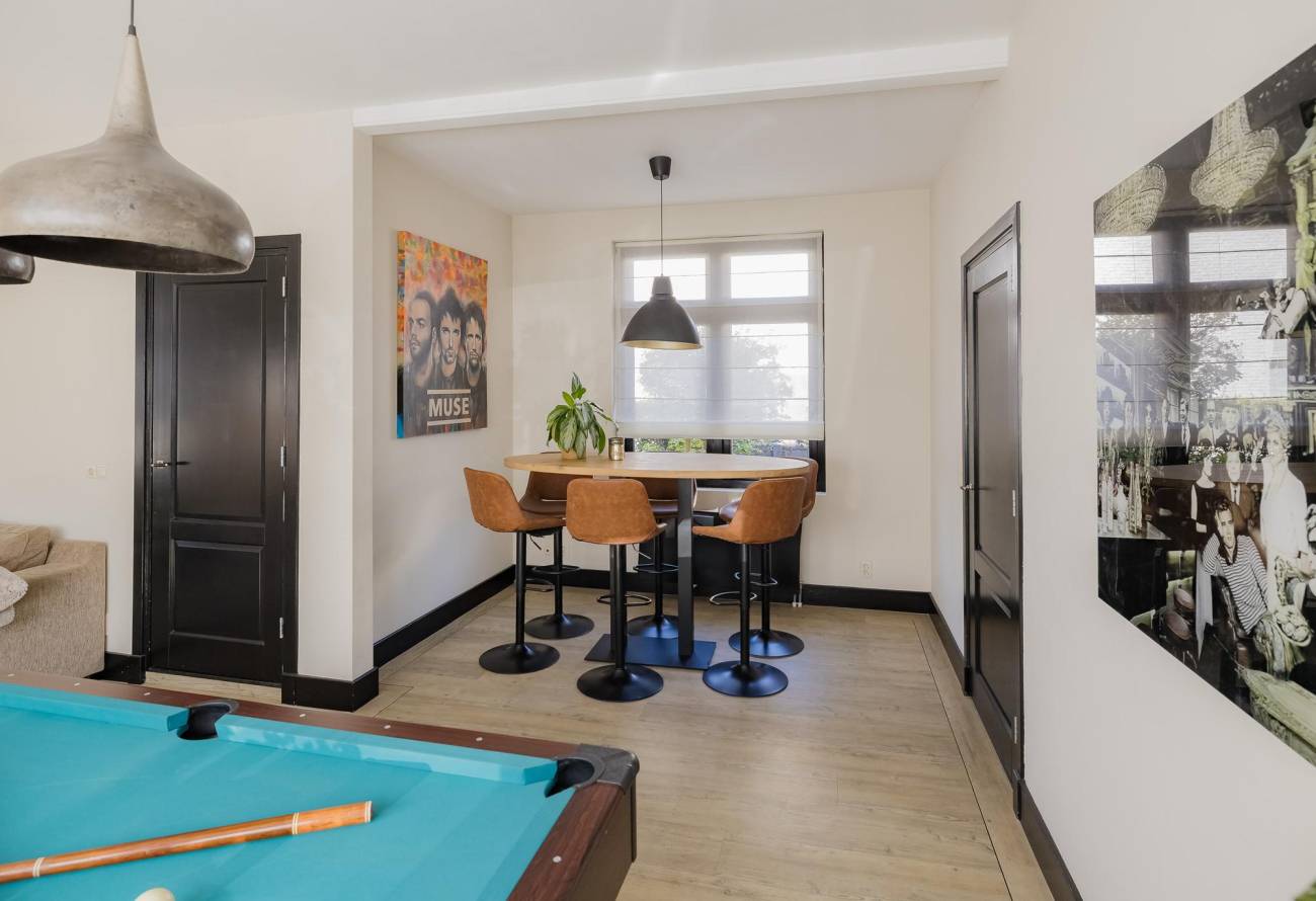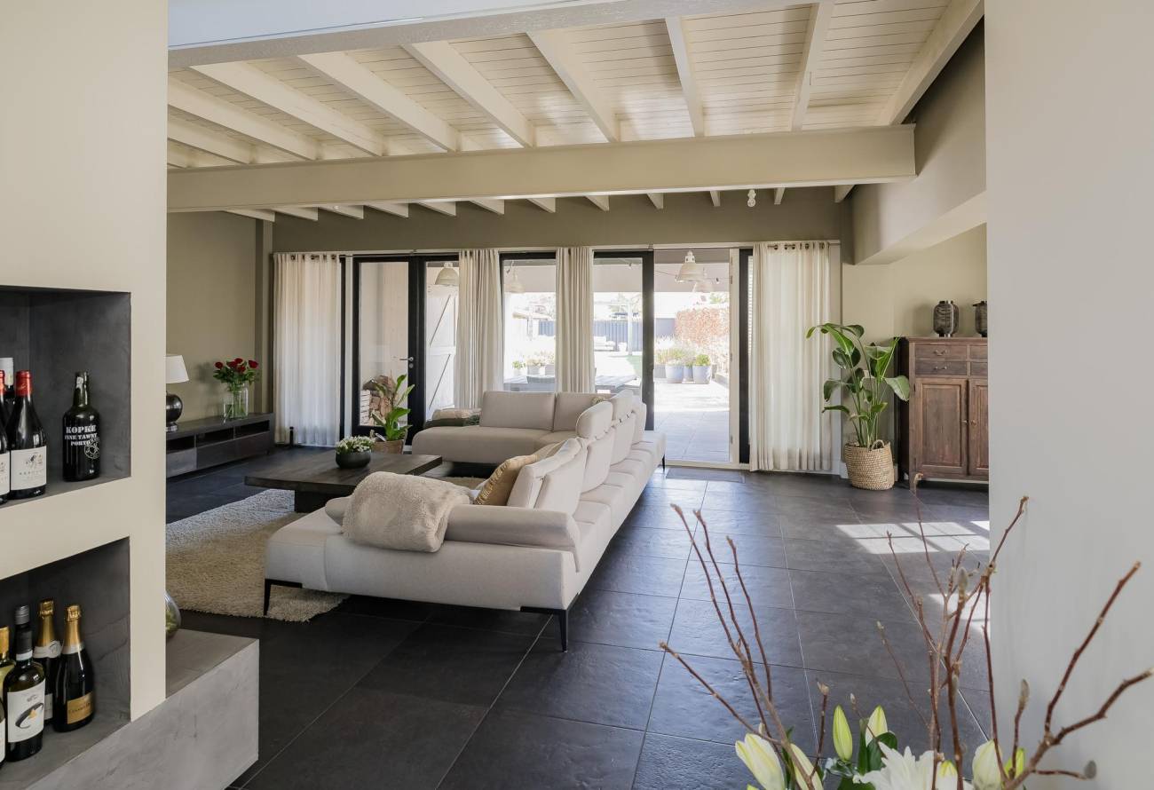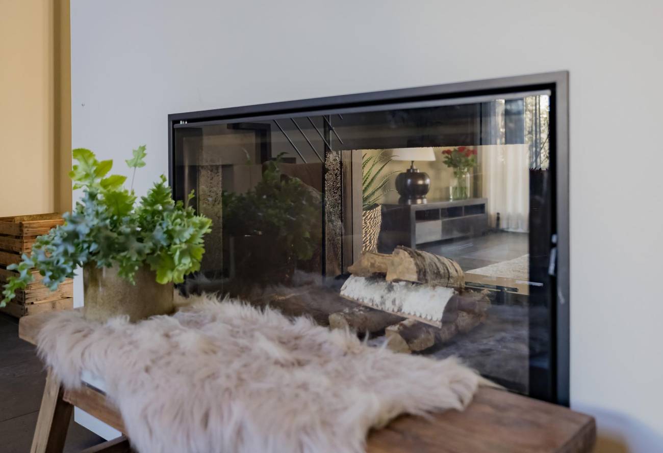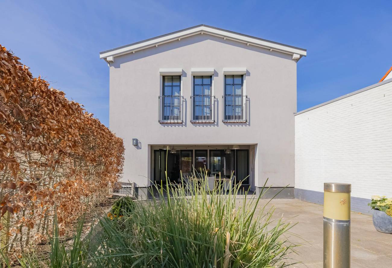De oude bollenschuur is rondom geïsoleerd en verbouwd tot living. De riante woonkamer met vide en open haard is aan de ene zijde met een hoge stalen deur afgesloten van de keuken en aan de andere zijden geven openslaande deuren toegang tot de veranda en de zonnige tuin. Een roomdevider deelt de grote ruimte in 2 gezellige zitgedeeltes. Genoeg ruimte voor het hele gezin.