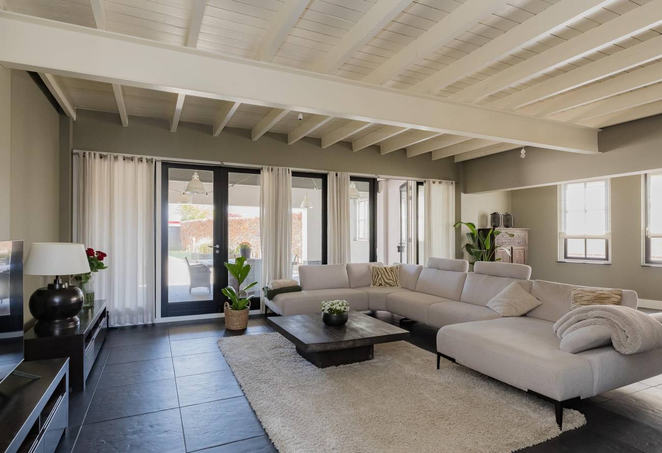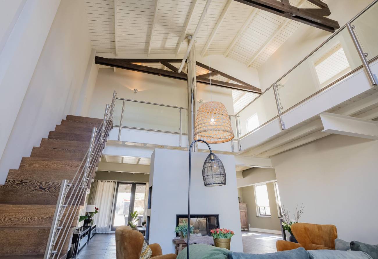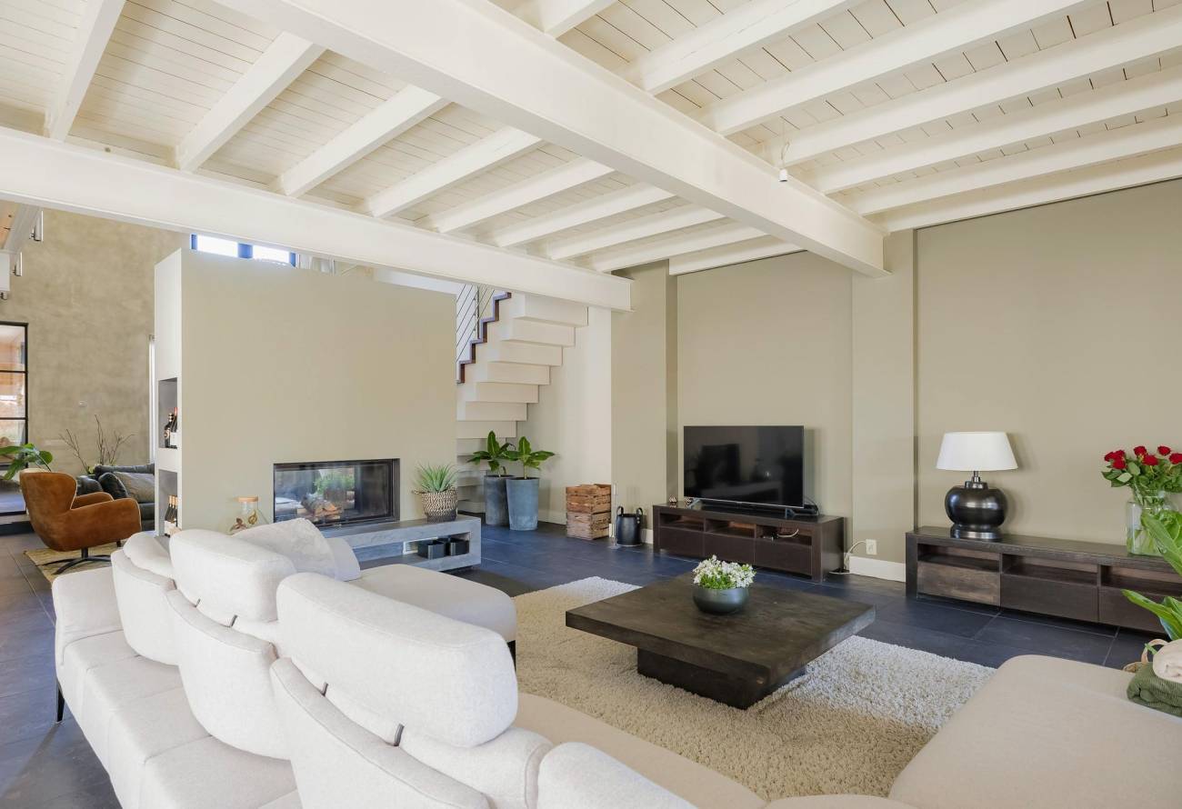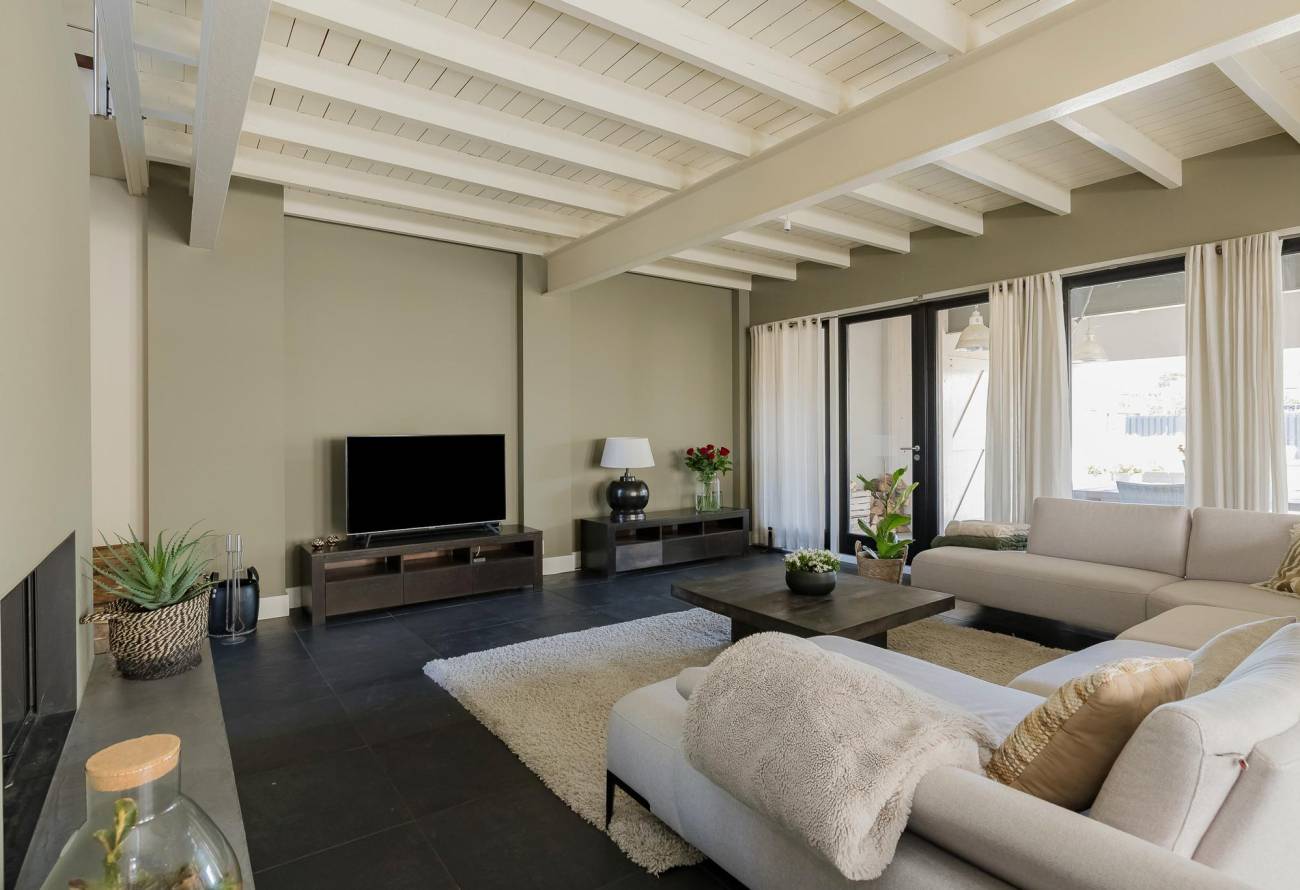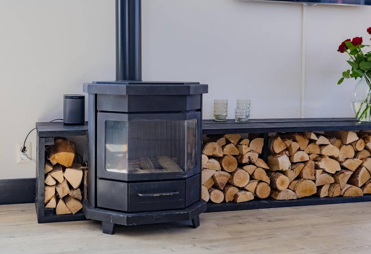 De oude bollenschuur is rondom geïsoleerd en verbouwd tot living. De riante woonkamer met vide en open haard is aan de ene zijde met een hoge stalen deur afgesloten van de keuken en aan de andere zijden geven openslaande deuren toegang tot de veranda en de zonnige tuin. Een roomdevider deelt de grote ruimte in 2 gezellige zitgedeeltes. Genoeg ruimte voor het hele gezin.