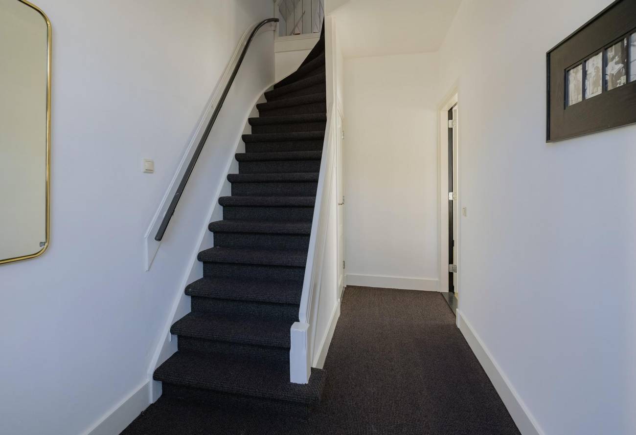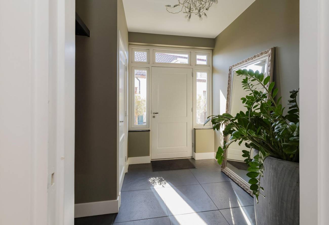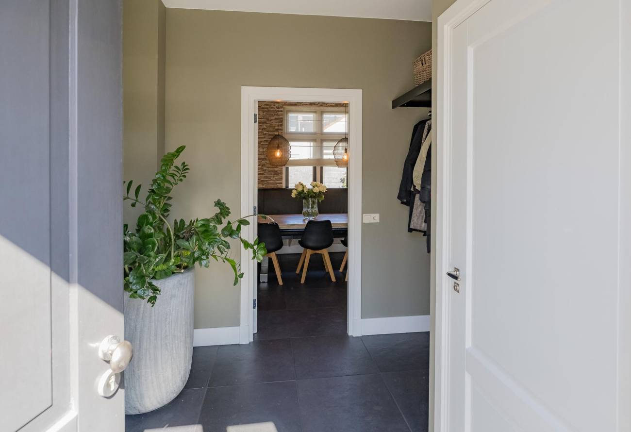 Aan twee zijden van de woning bevindt zich een entree; één aan de voorzijde en één aan de zijkant van de woning. De kamer aan de voorzijde is in gebruik als chill-kamer. De voormalige achterkamer is verbouwd tot een grote moderne woonkeuken die van alle gemakken is voorzien en toegang heeft tot de ruime bijkeuken.