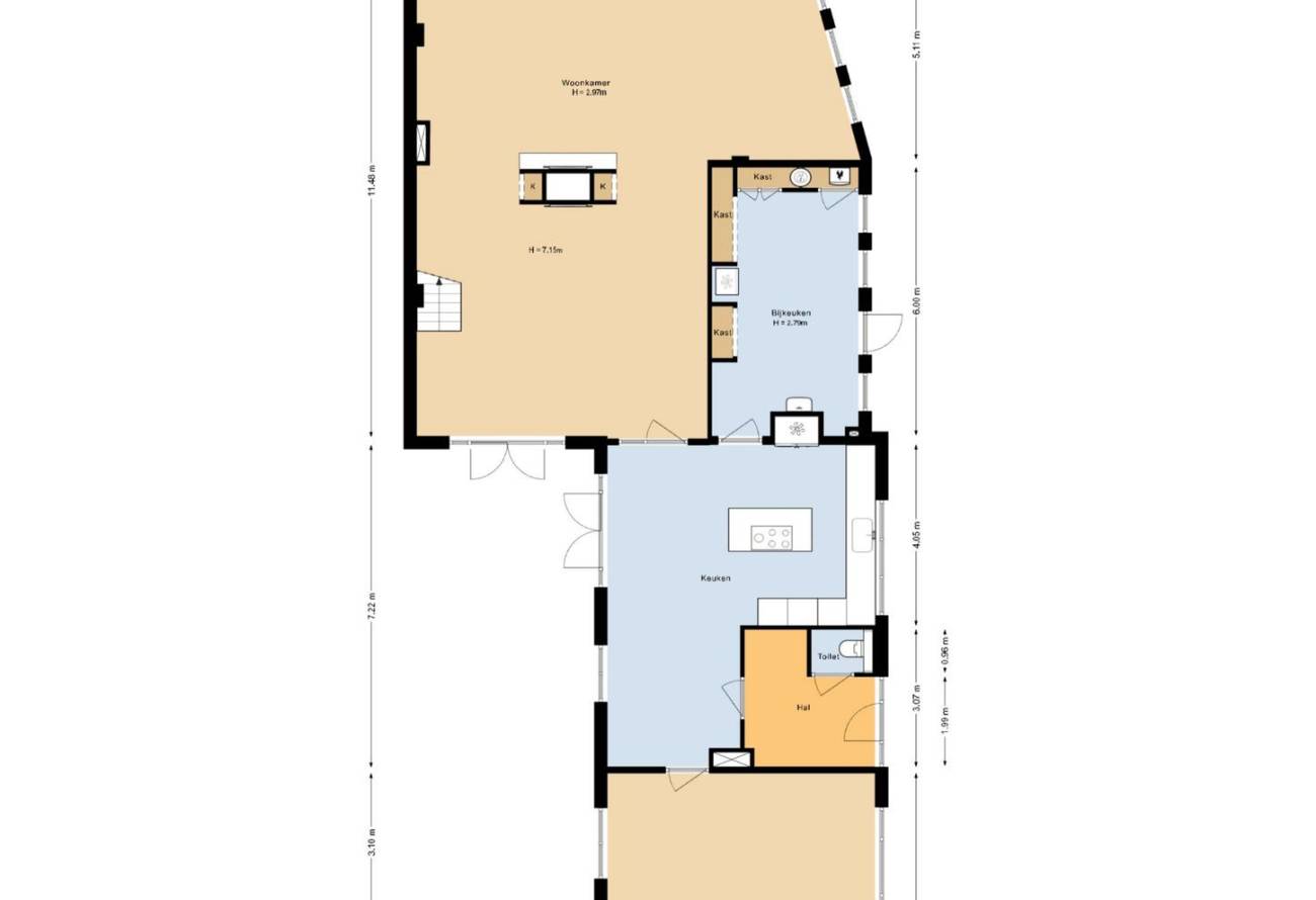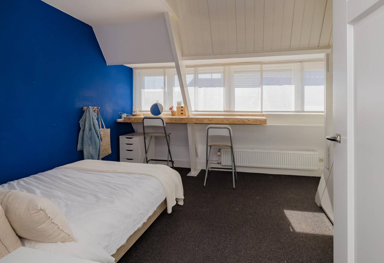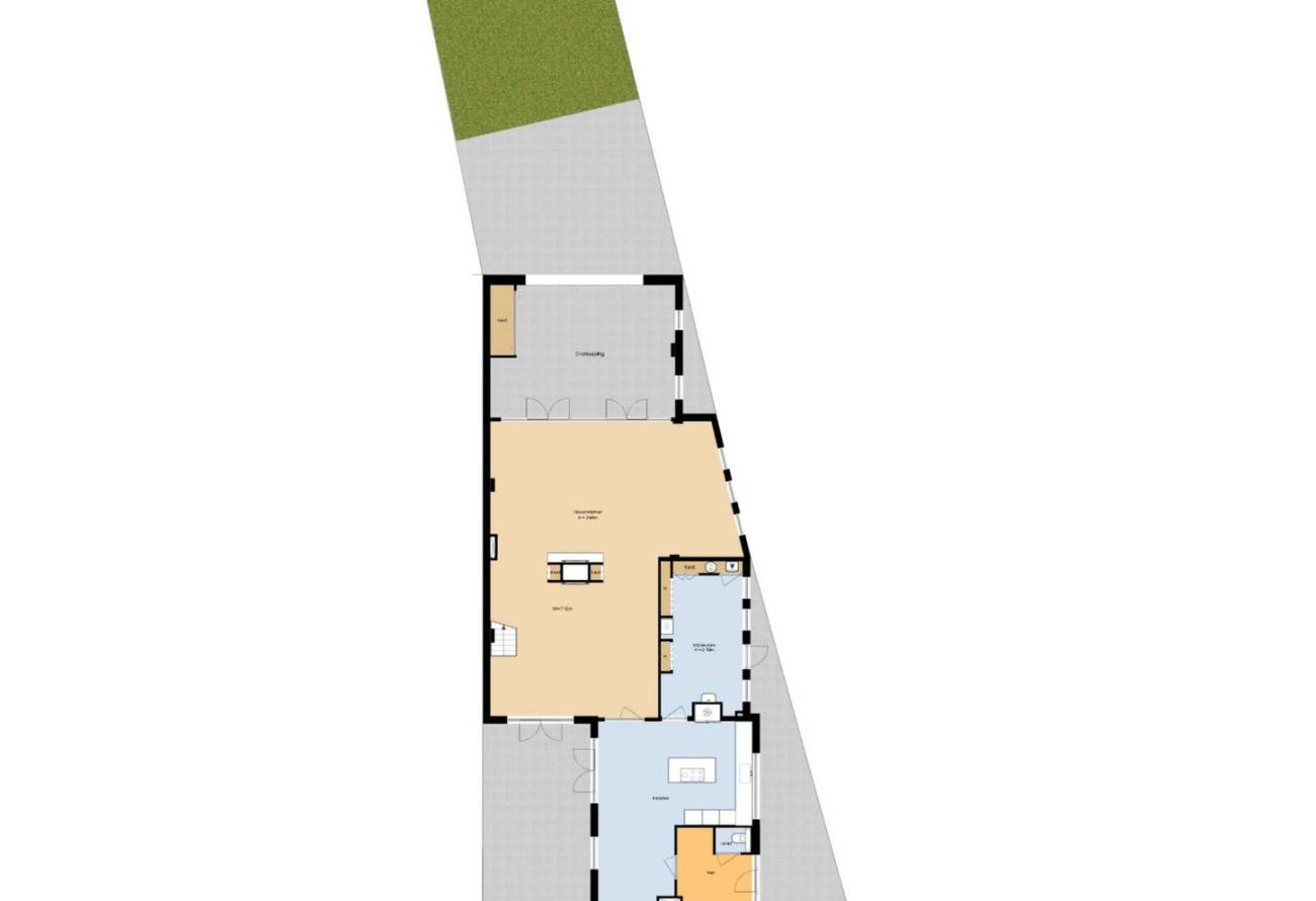 Aan twee zijden van de woning bevindt zich een entree; één aan de voorzijde en één aan de zijkant van de woning. De kamer aan de voorzijde is in gebruik als chill-kamer. De voormalige achterkamer is verbouwd tot een grote moderne woonkeuken die van alle gemakken is voorzien en toegang heeft tot de ruime bijkeuken.