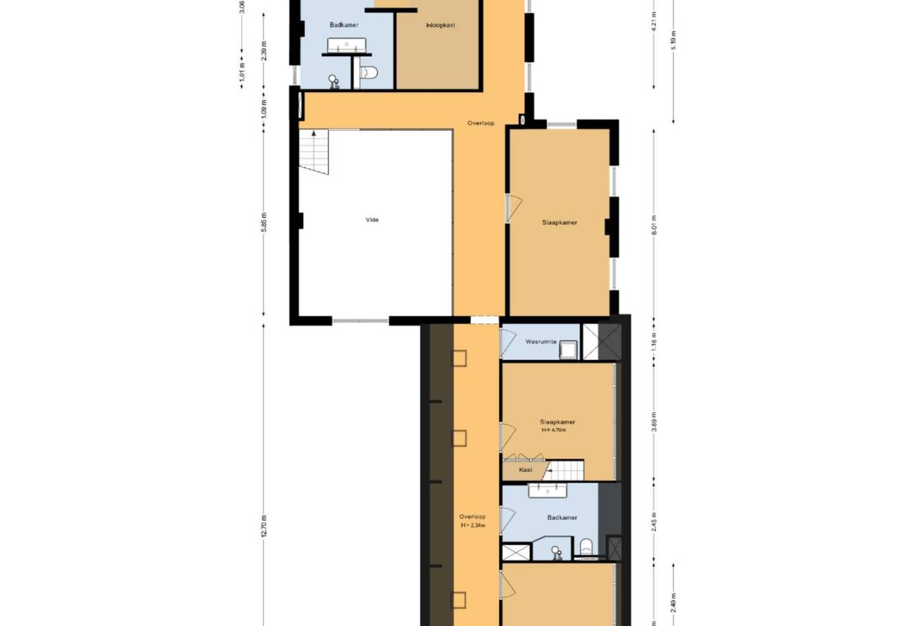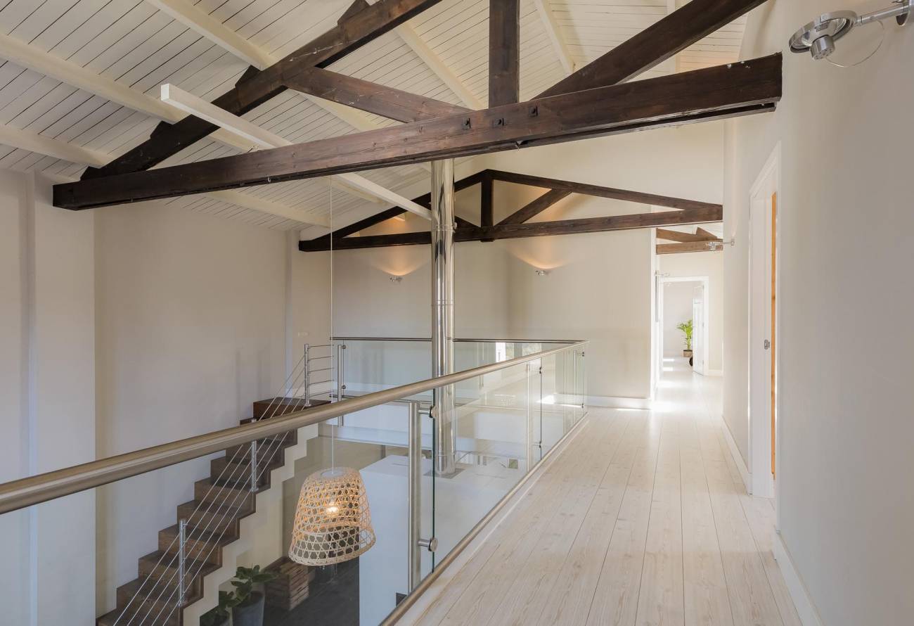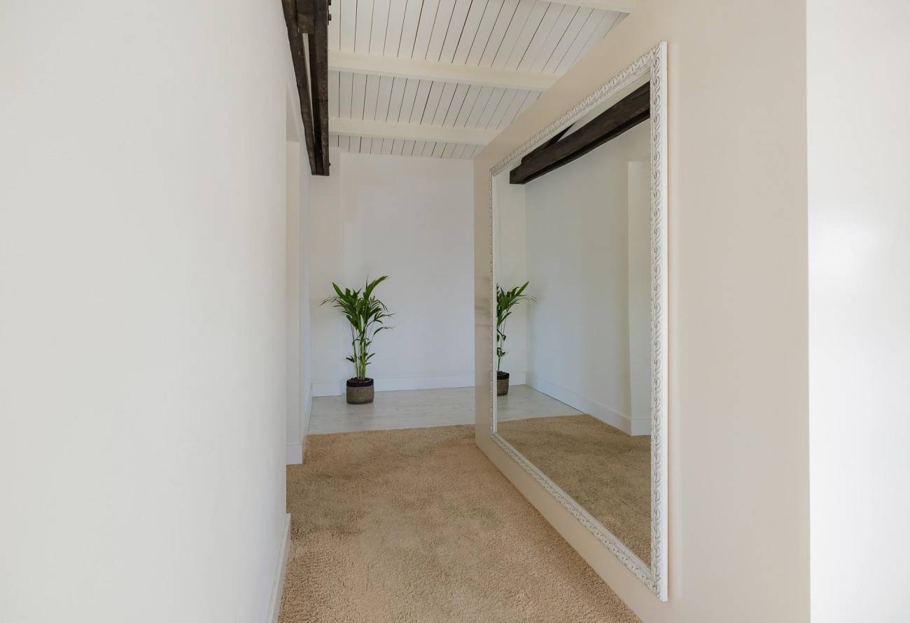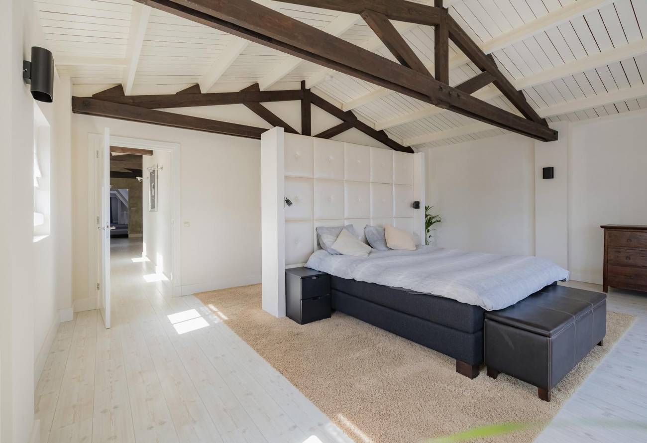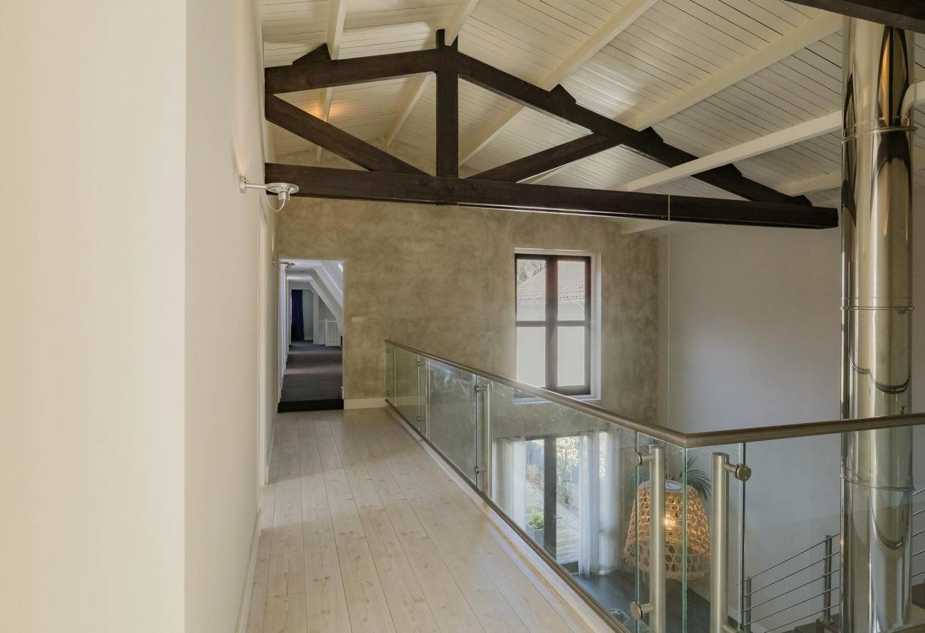 Een fraaie houten trap leidt naar de verdieping waar een overloop is met een wasruimte, 5 ruime slaapkamers en 2 badkamers waarvan de ouderslaapkamer zijn eigen badkamer heeft en een inloopkast. De balkenplafonds zorgen voor extra sfeer in deze ruime verdieping.