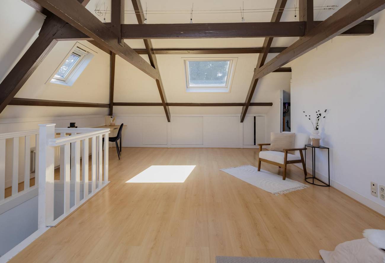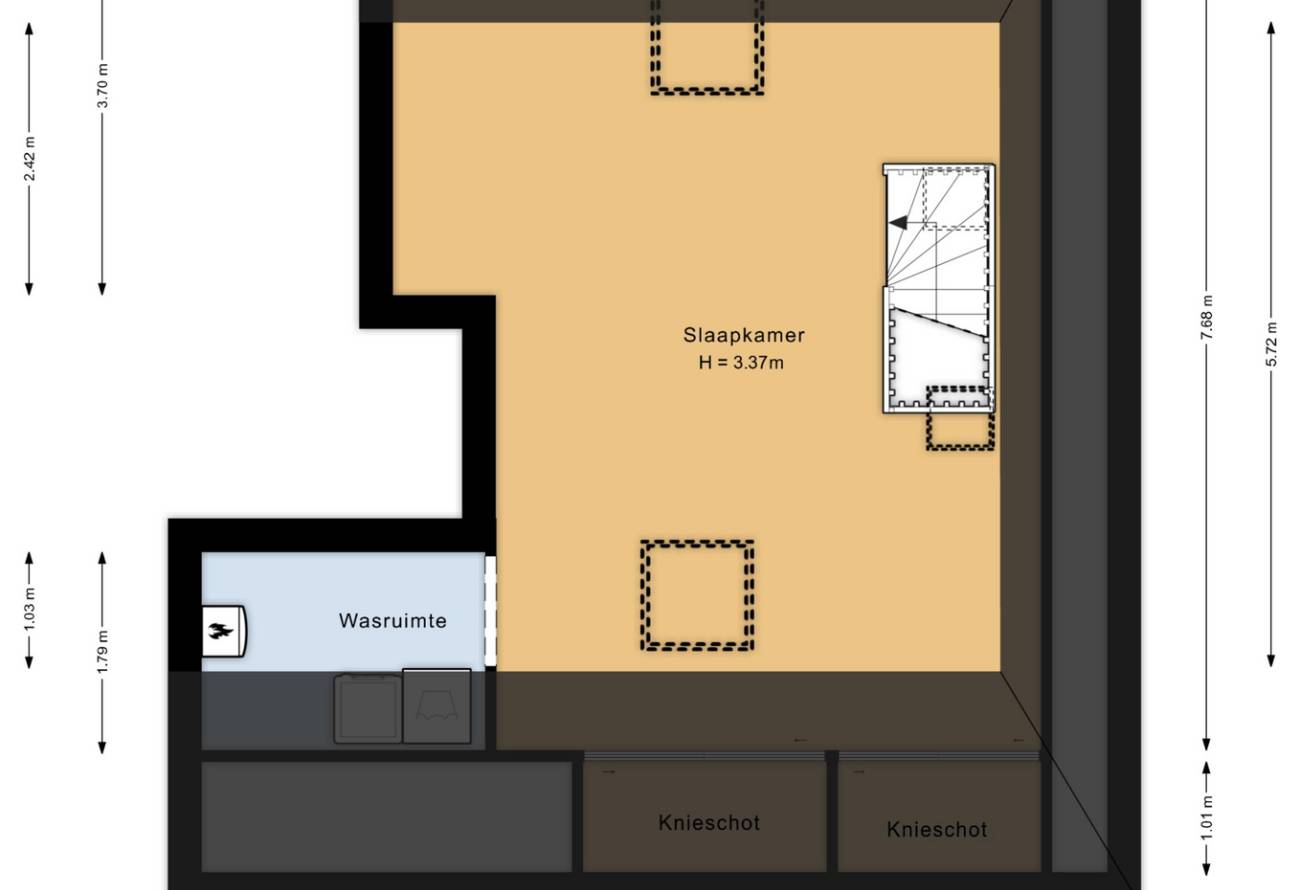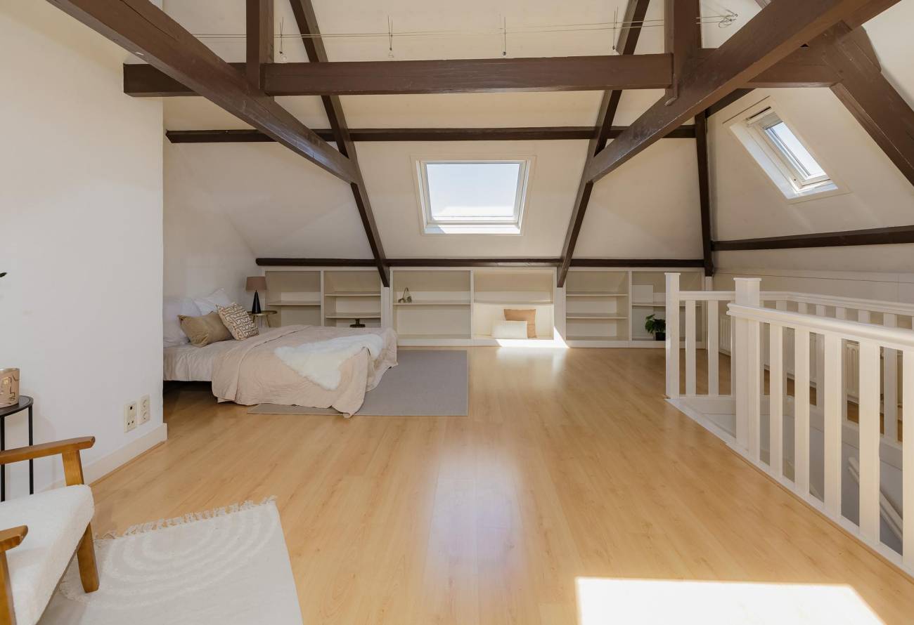 Vaste trap, grote zolder-/slaapkamer (eventueel 2 slaapkamers) met 4 dakvensters. Verder is er nog een betegelde wasruimte alwaar o.a. aansluiting wasapparatuur en opstelling cv combiketel.
