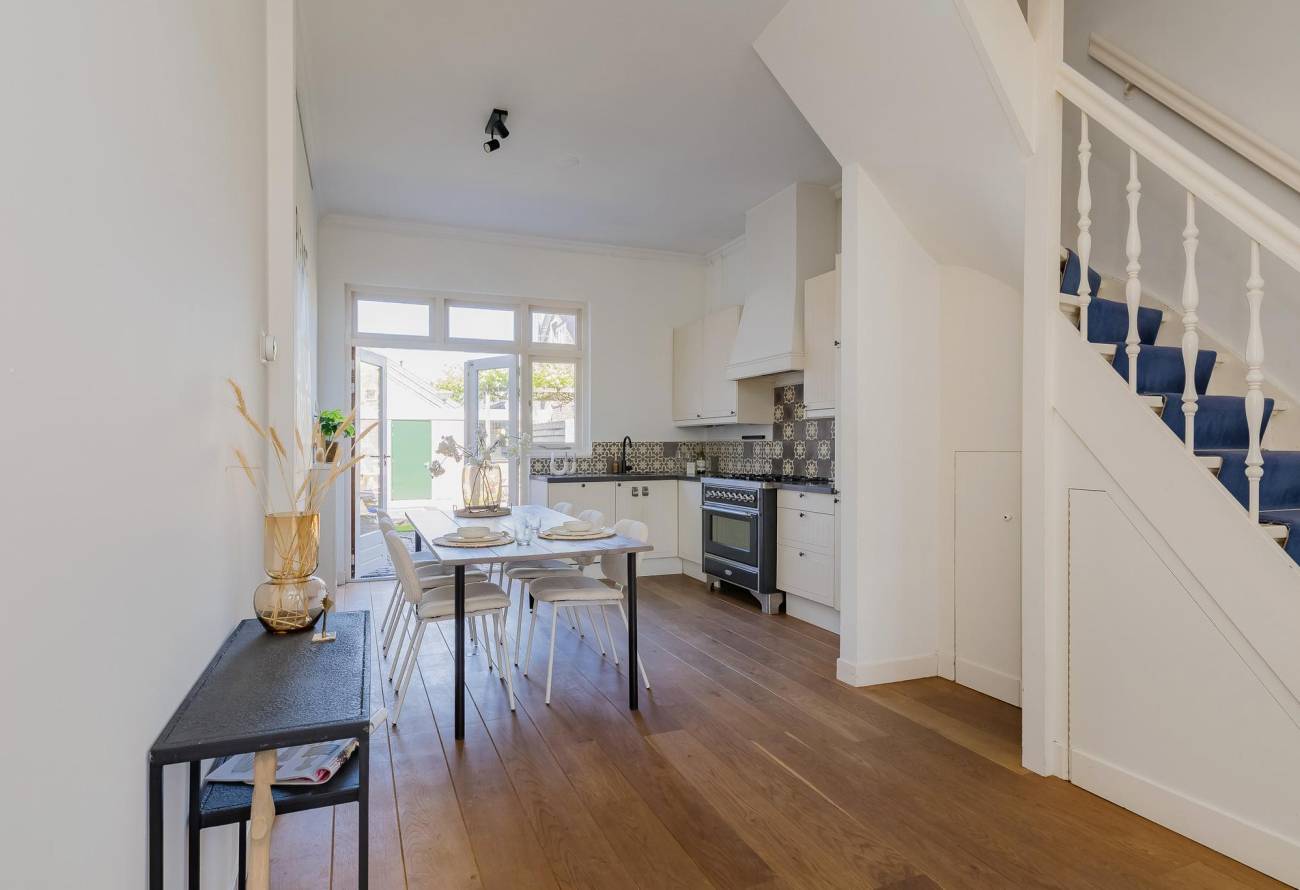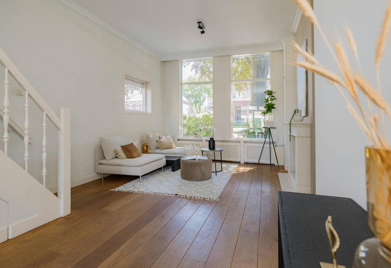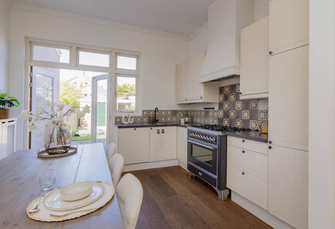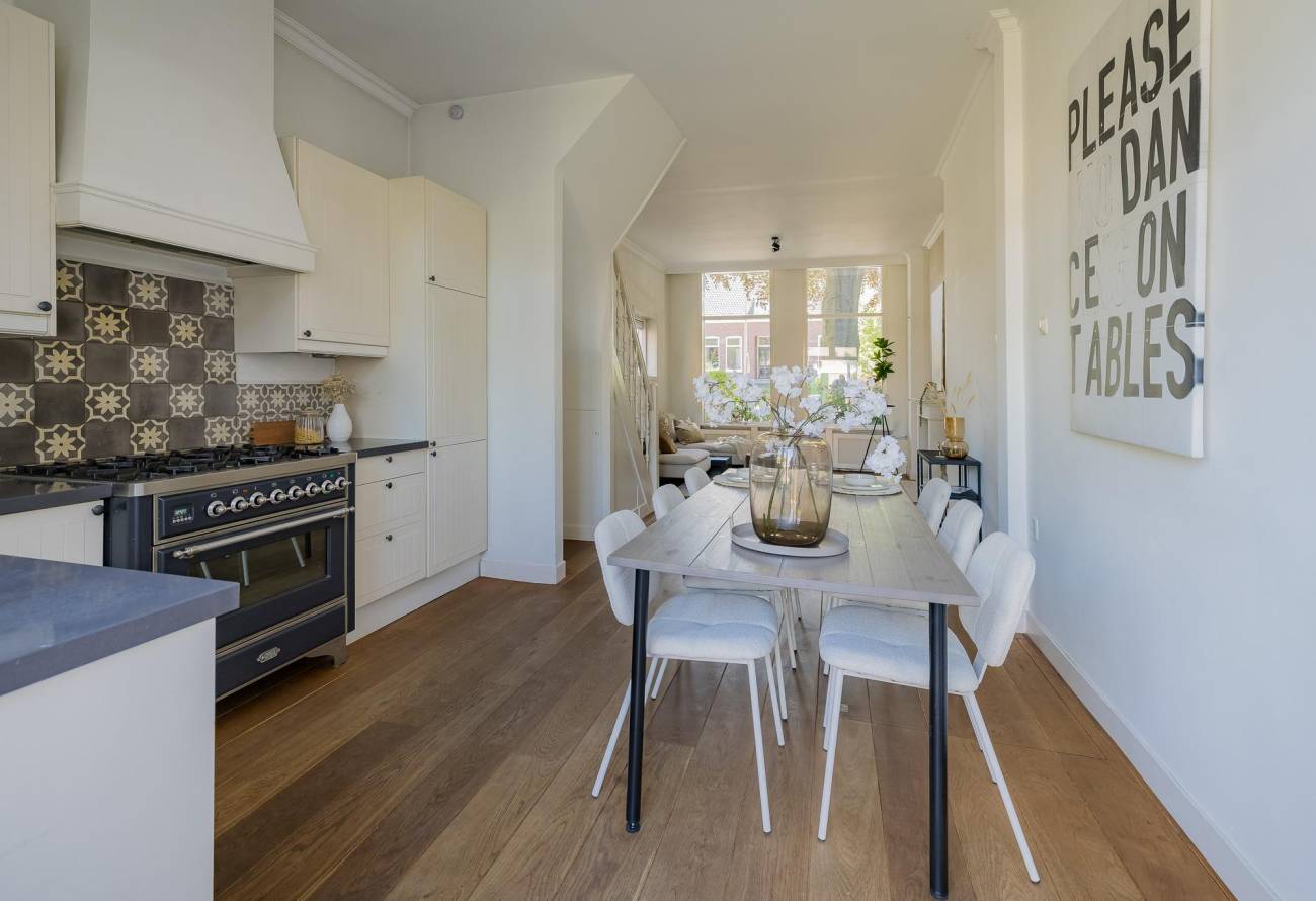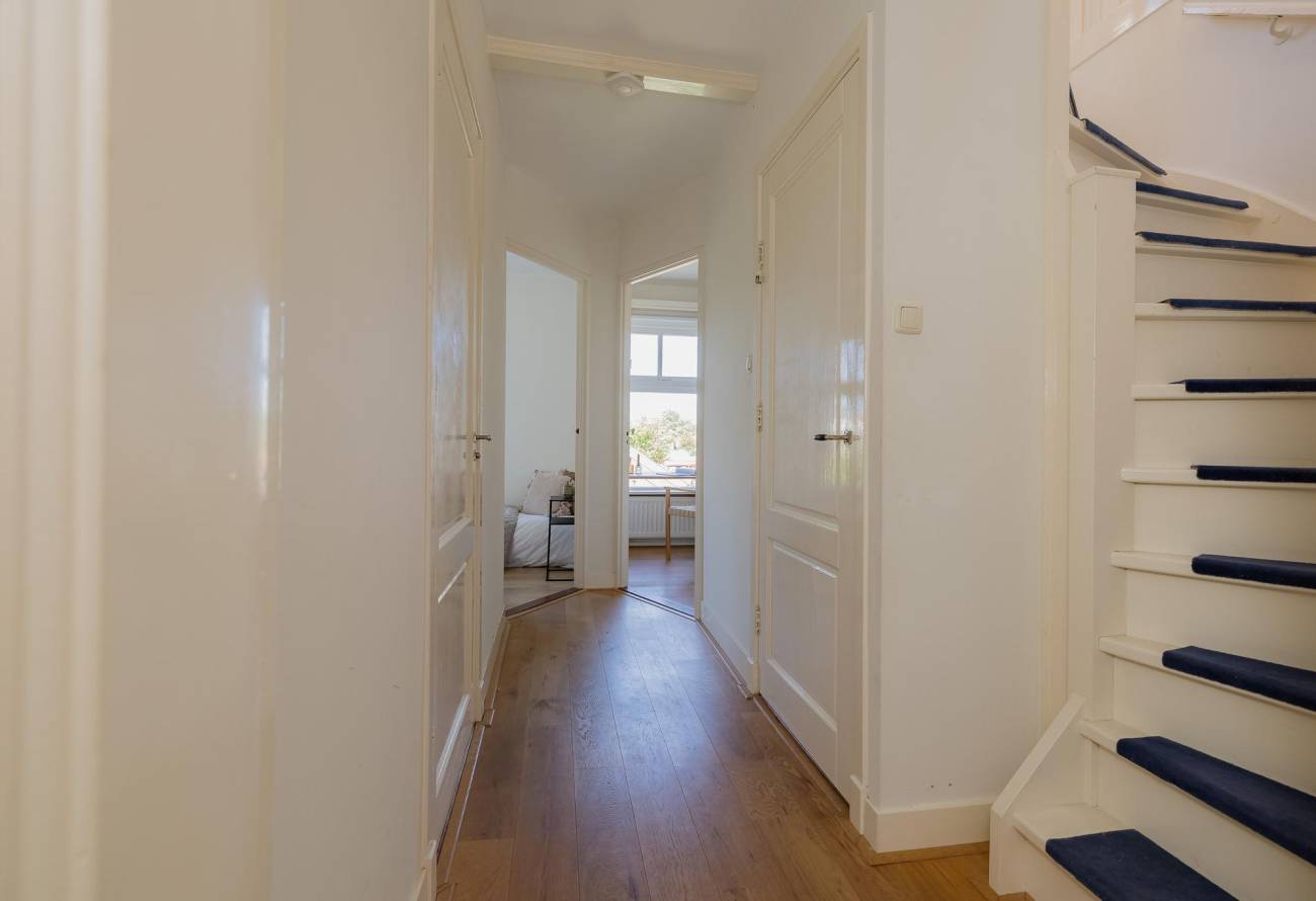 Charmante entree met een opvallend hoge voordeur, een gang met authentieke deurbel, garderobe en een nette toiletruimte. Zeer lichte woonkamer met hoge ramen, zijraam en eikenhouten vloerdelen, open keuken met lichte inrichting, Boretti gasfornuis en zwart composiet werkblad in L-vorm, openslaande deuren naar de tuin. De ruime kelder is toegankelijk middels een vloerluik.