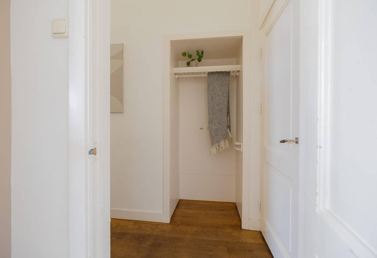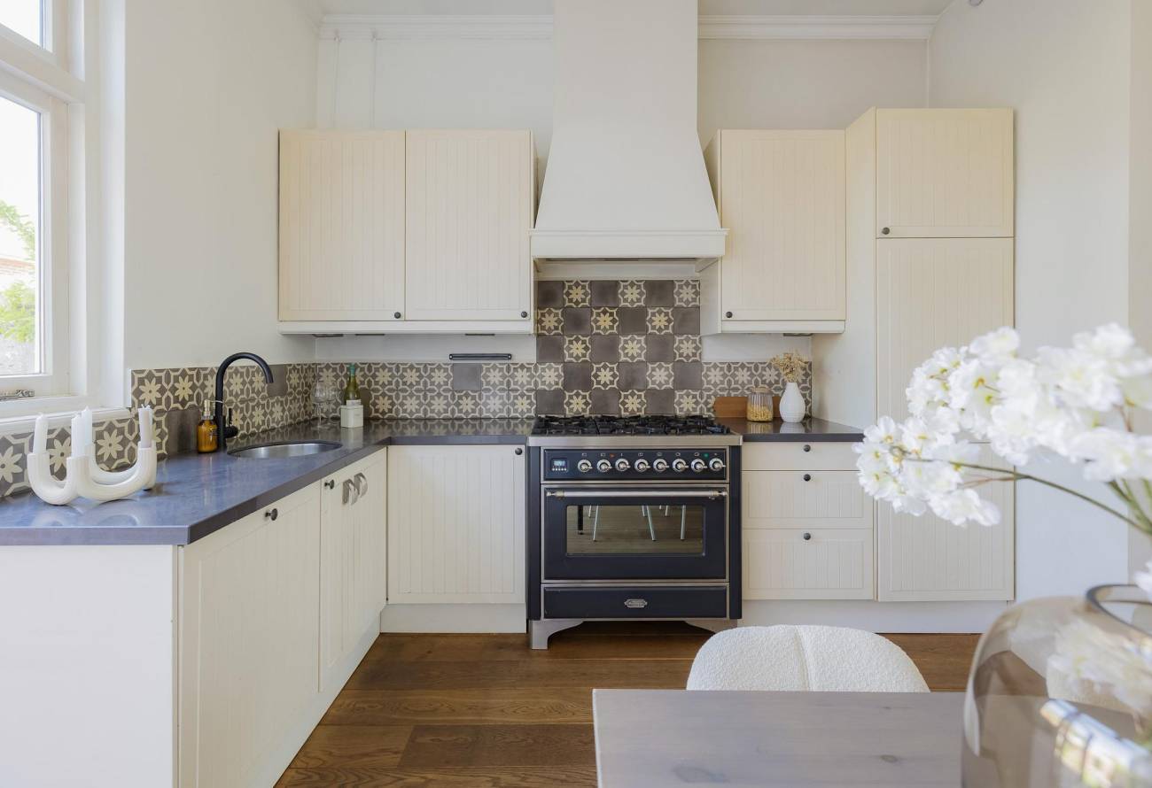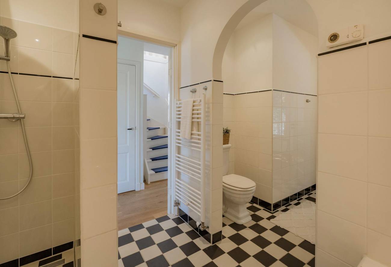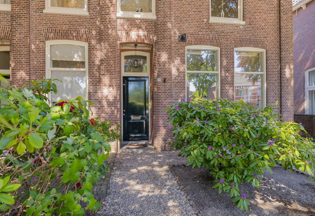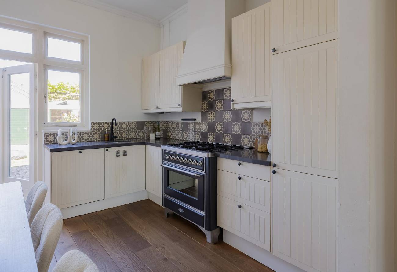 Charmante entree met een opvallend hoge voordeur, een gang met authentieke deurbel, garderobe en een nette toiletruimte. Zeer lichte woonkamer met hoge ramen, zijraam en eikenhouten vloerdelen, open keuken met lichte inrichting, Boretti gasfornuis en zwart composiet werkblad in L-vorm, openslaande deuren naar de tuin. De ruime kelder is toegankelijk middels een vloerluik.