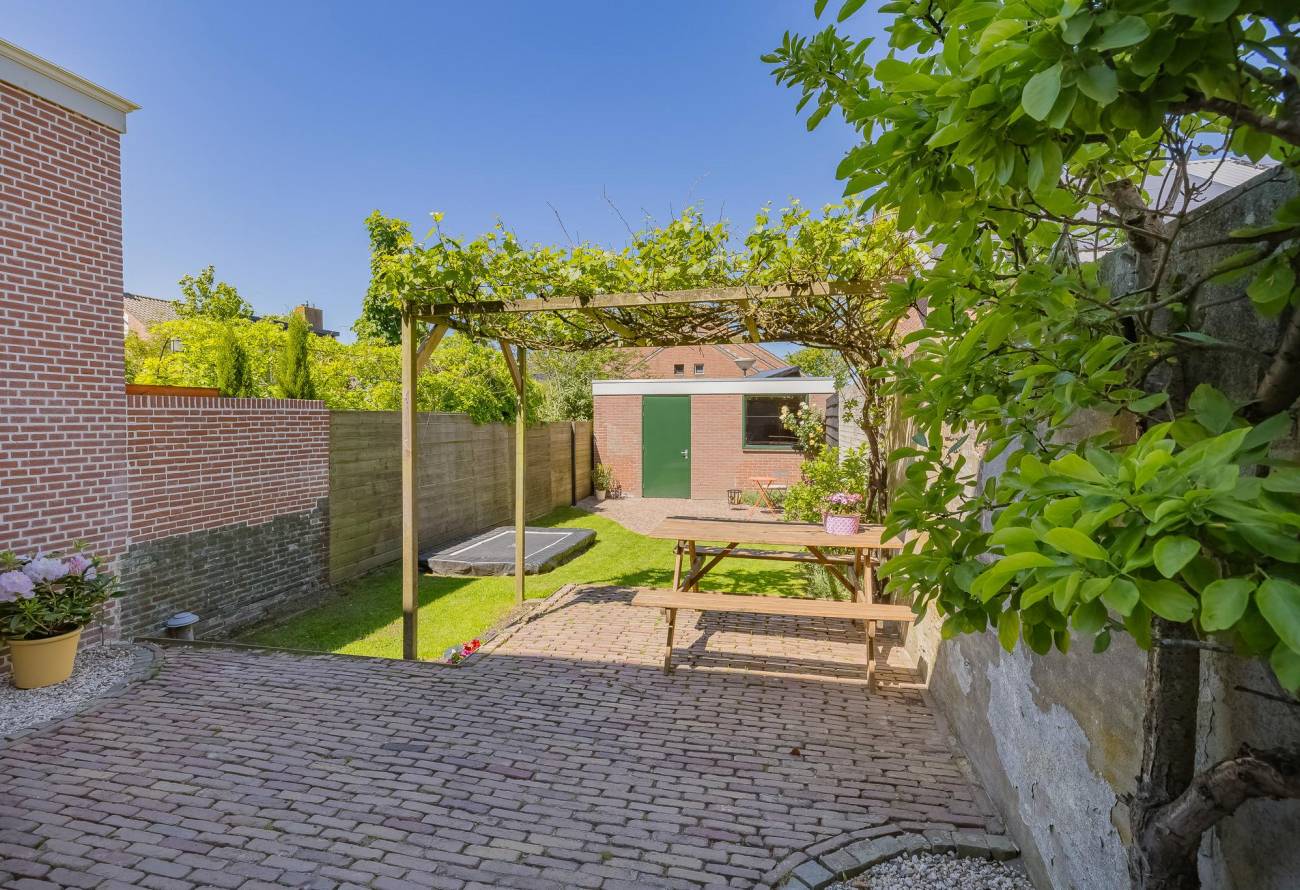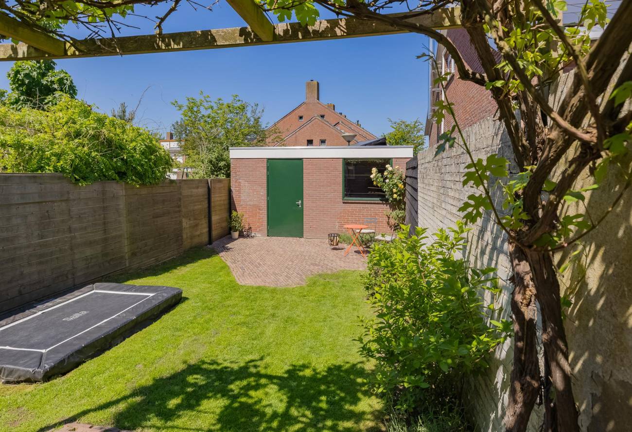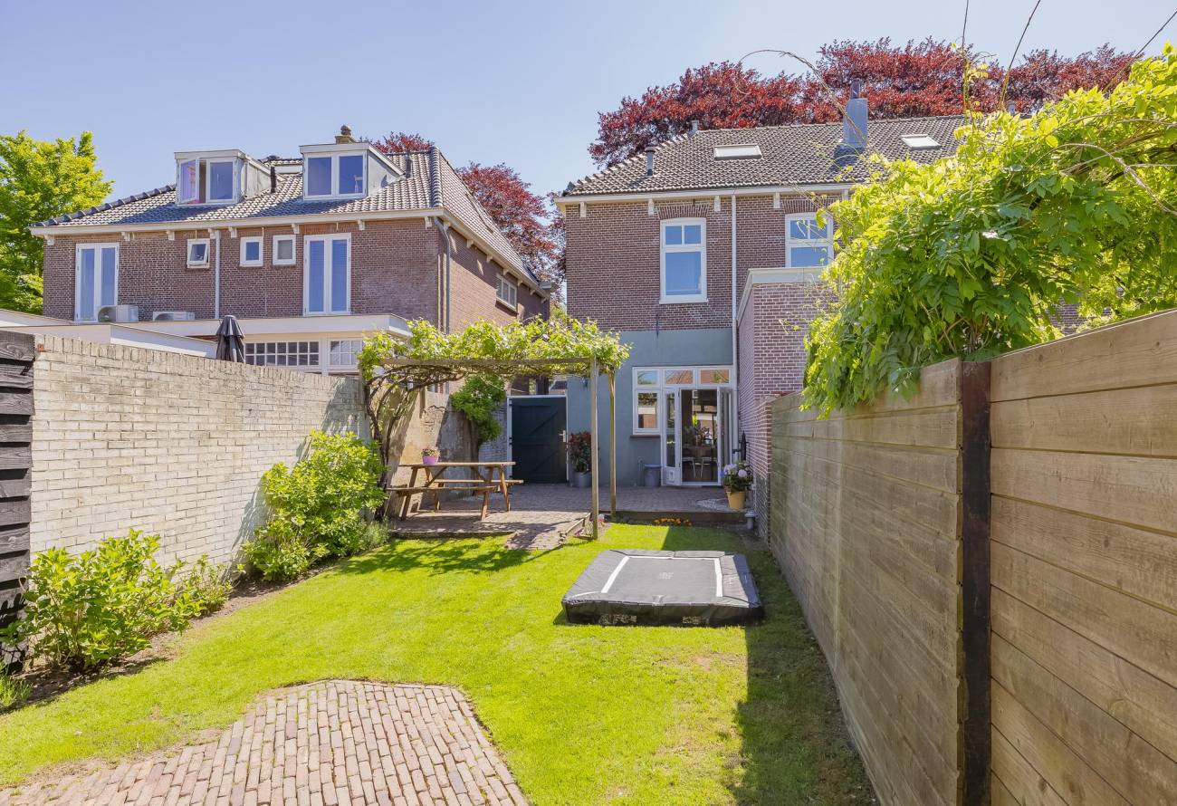 De 16 meter diepe achtertuin met veel privacy ligt op het Westen en heeft een mooie grote stenen berging van 16m². In de voortuin staat een prachtige monumentale beukenboom .