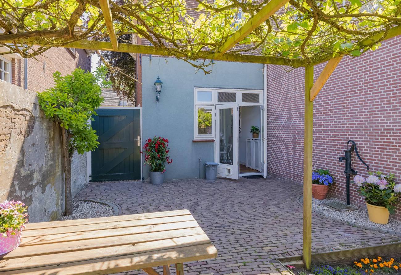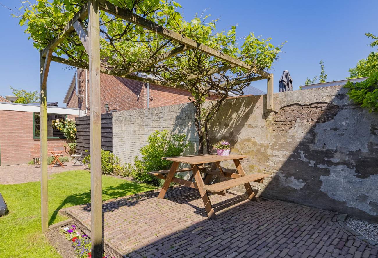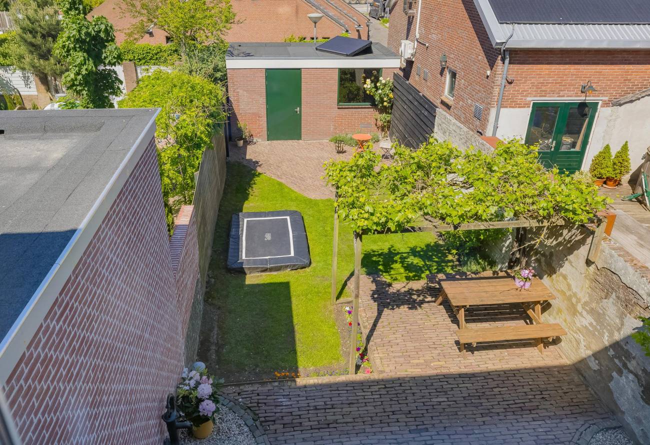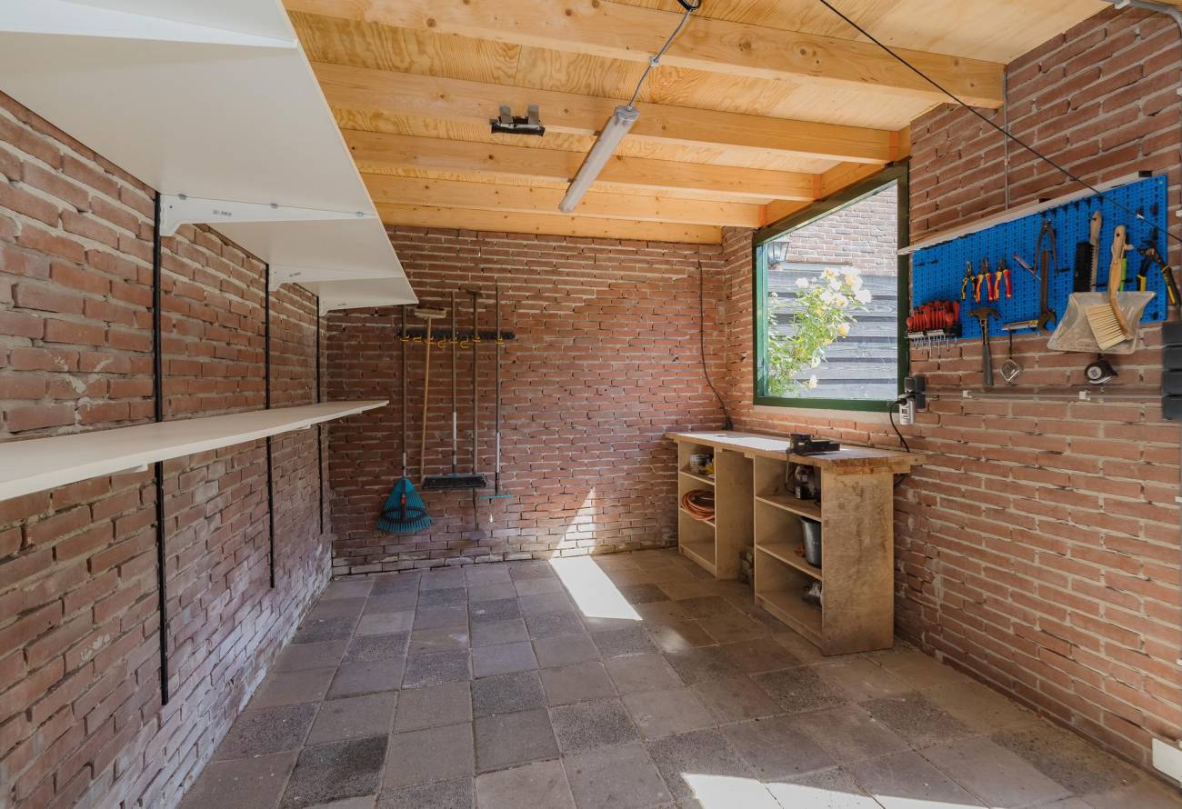 De 16 meter diepe achtertuin met veel privacy ligt op het Westen en heeft een mooie grote stenen berging van 16m². In de voortuin staat een prachtige monumentale beukenboom .