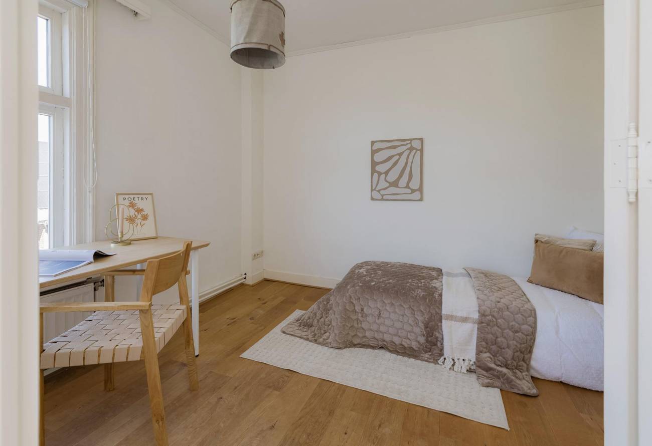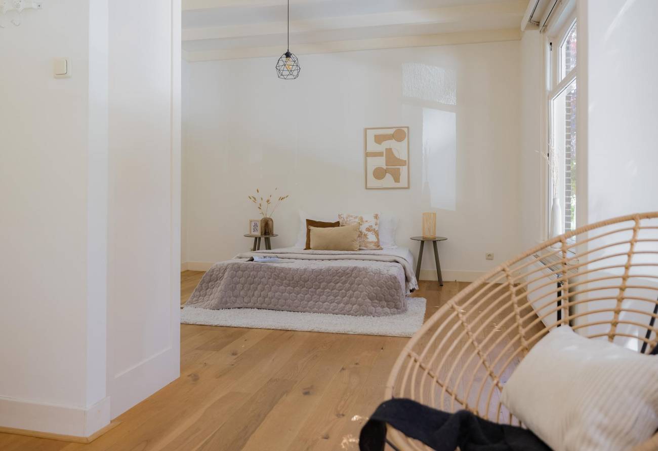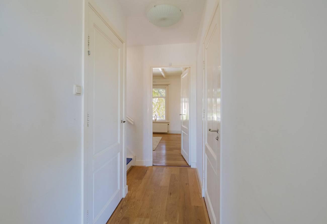 Overloop, grote hoofdslaapkamer aan voorzijde met 3 grote (schuif)ramen, 2 mooie slaapkamers aan achterzijde en een royale badkamer tussen de kamers in met een ligbad, doucheruimte, toilet, 2 wastafels op zuil en elektrische vloerverwarming. De etage is grotendeels voorzien van een eikenhouten lamellen parketvloer.