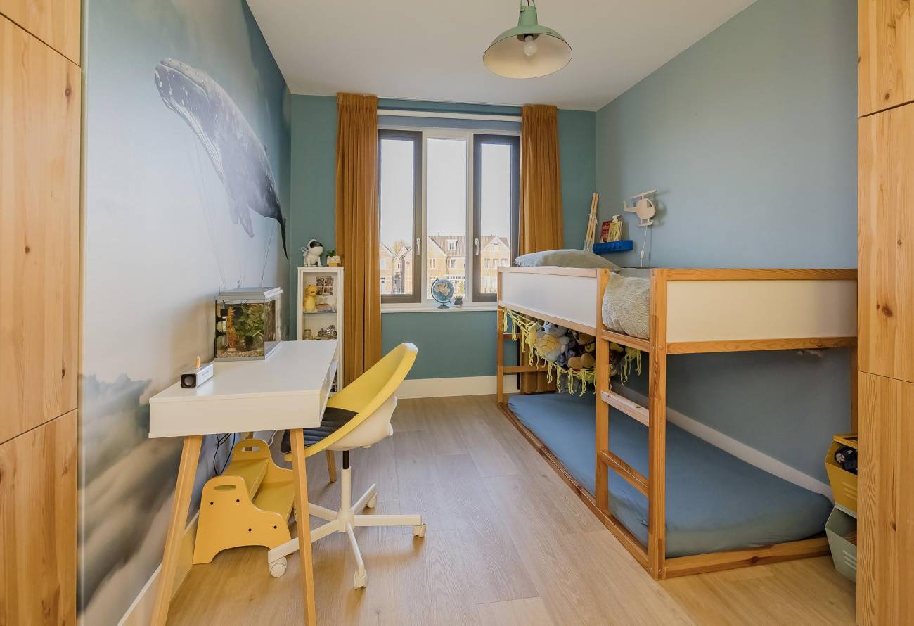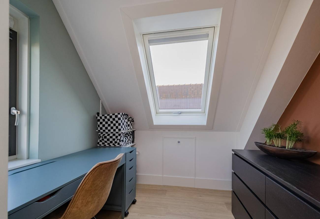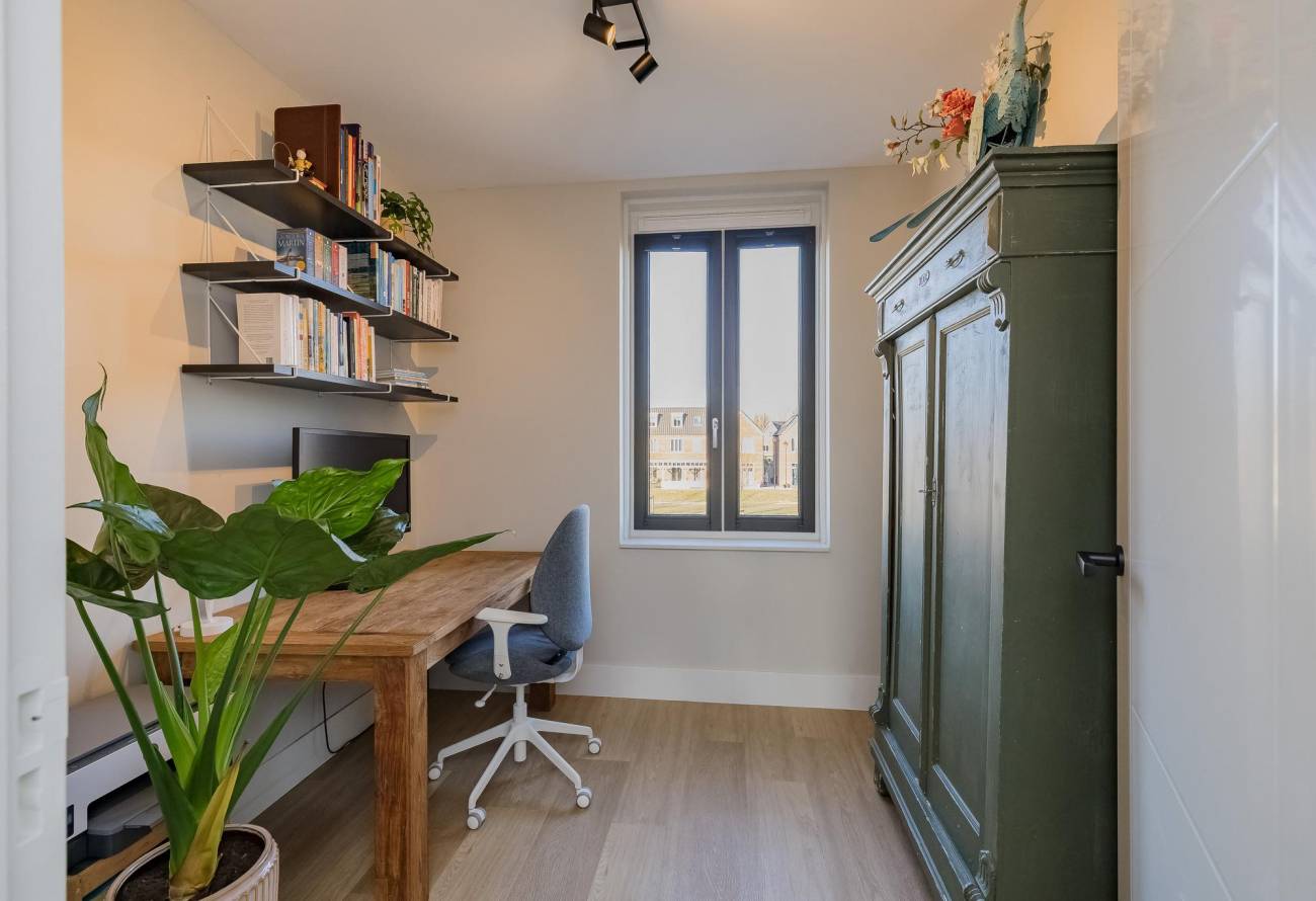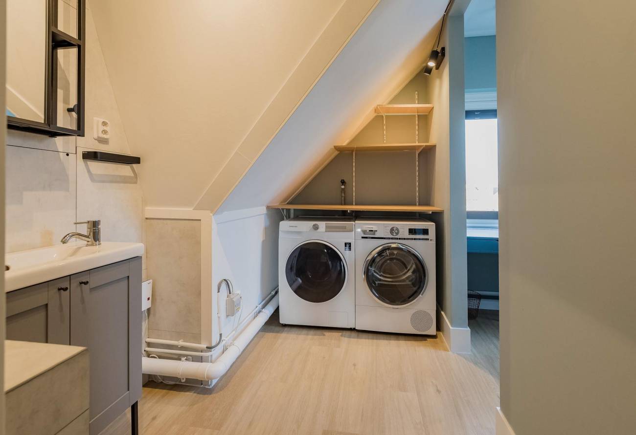 2e verdieping: nog twee slaapkamers, een handige ruimte voor de wasmachine/droger met waterpunt én nog een fijne werkplek.