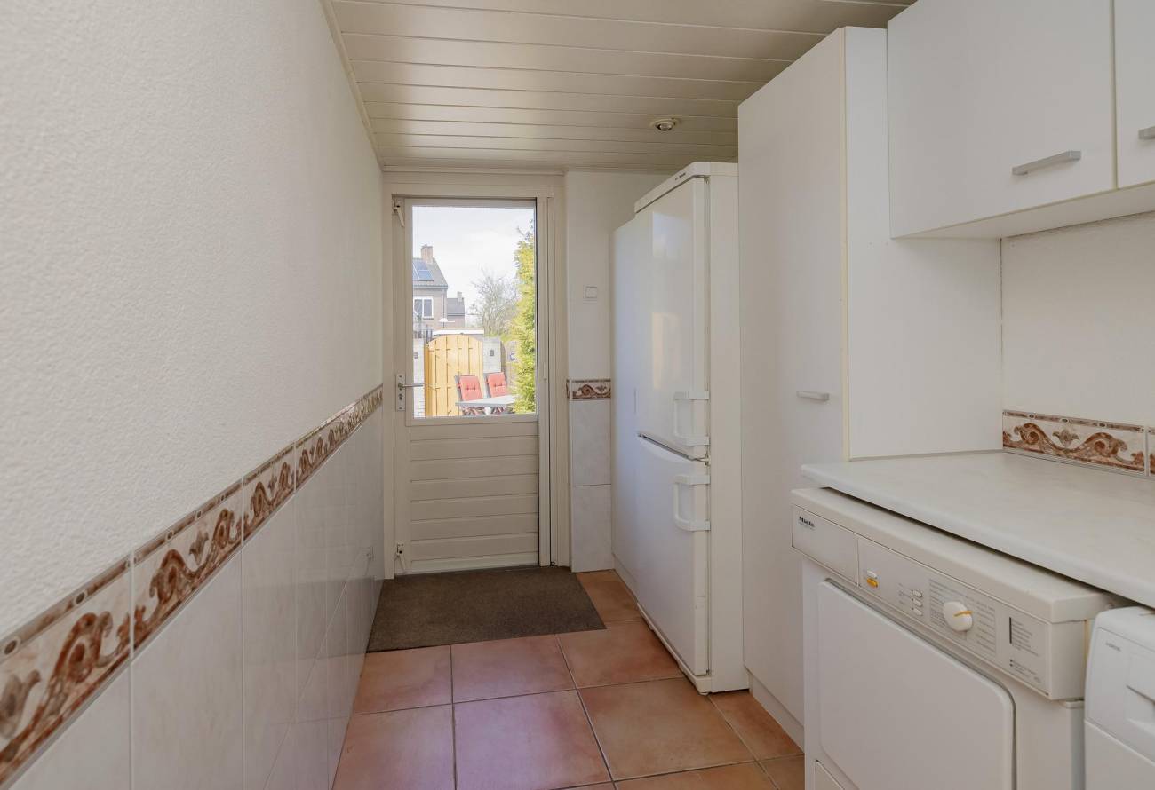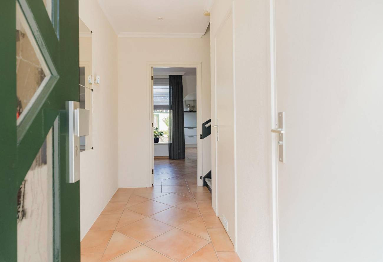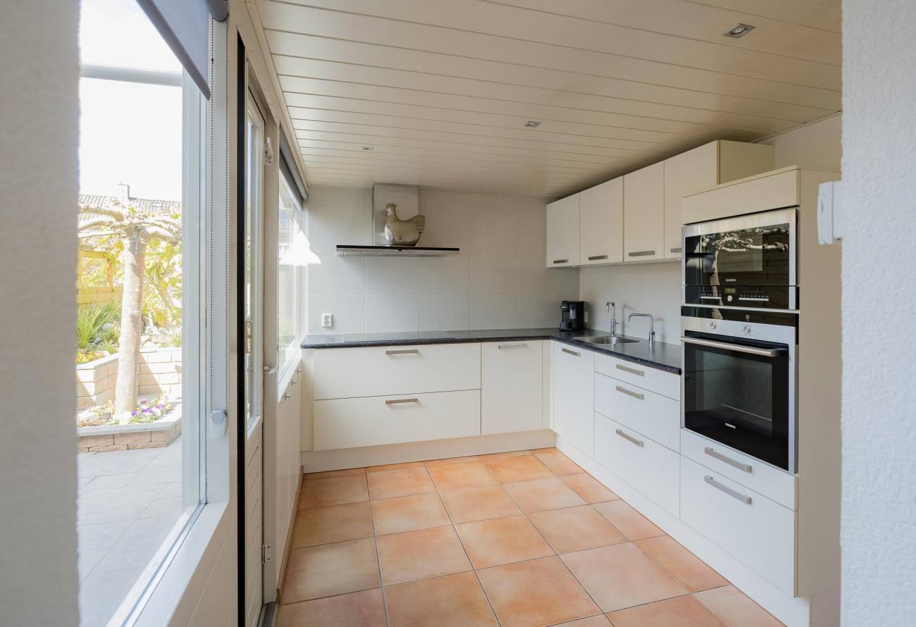 Entree, gang met meterkast, moderne toiletruimte en trapkast, L-vormige lichte woonkamer met terra tegelvloer met vloerverwarming en spachtelputz wanden, uitgebouwde moderne keuken in L-opstelling, witte kasten, donkergrijs MDF werkblad en diverse inbouwapparatuur, RvS strakke afzuigschouw en Quooker. Bijkeuken met aansluiting wasapparatuur, diverse kasten en werkblad. Zowel de keuken als de bijkeuken zijn voorzien van een deur naar de tuin.