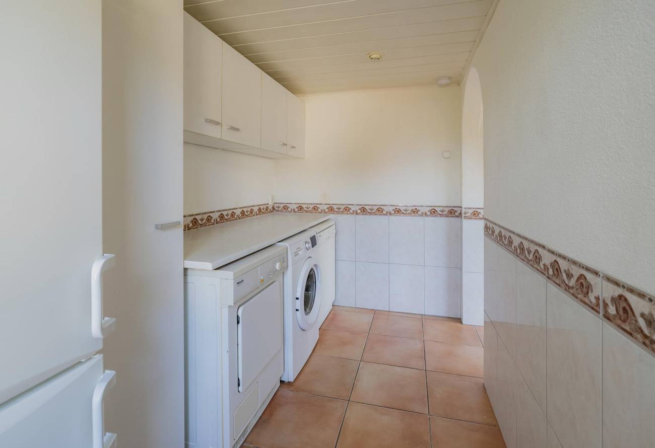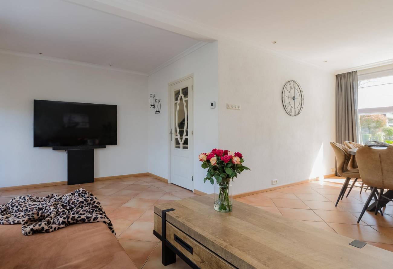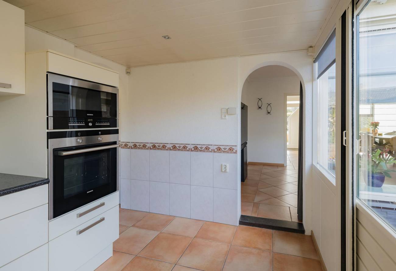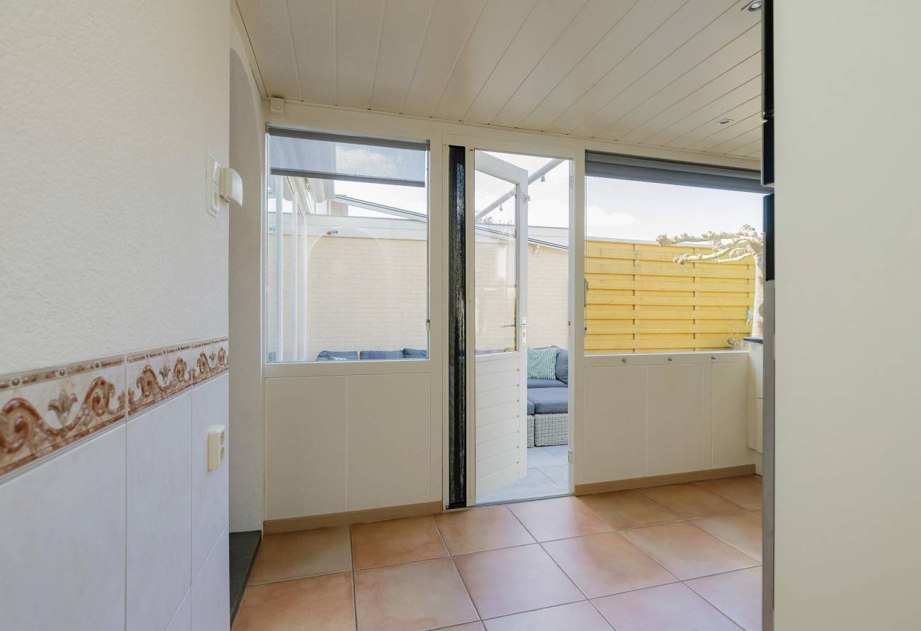 Entree, gang met meterkast, moderne toiletruimte en trapkast, L-vormige lichte woonkamer met terra tegelvloer met vloerverwarming en spachtelputz wanden, uitgebouwde moderne keuken in L-opstelling, witte kasten, donkergrijs MDF werkblad en diverse inbouwapparatuur, RvS strakke afzuigschouw en Quooker. Bijkeuken met aansluiting wasapparatuur, diverse kasten en werkblad. Zowel de keuken als de bijkeuken zijn voorzien van een deur naar de tuin.