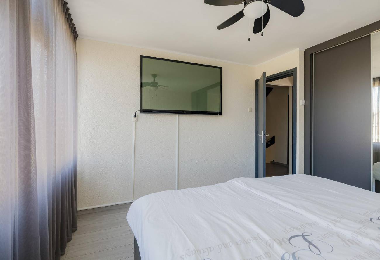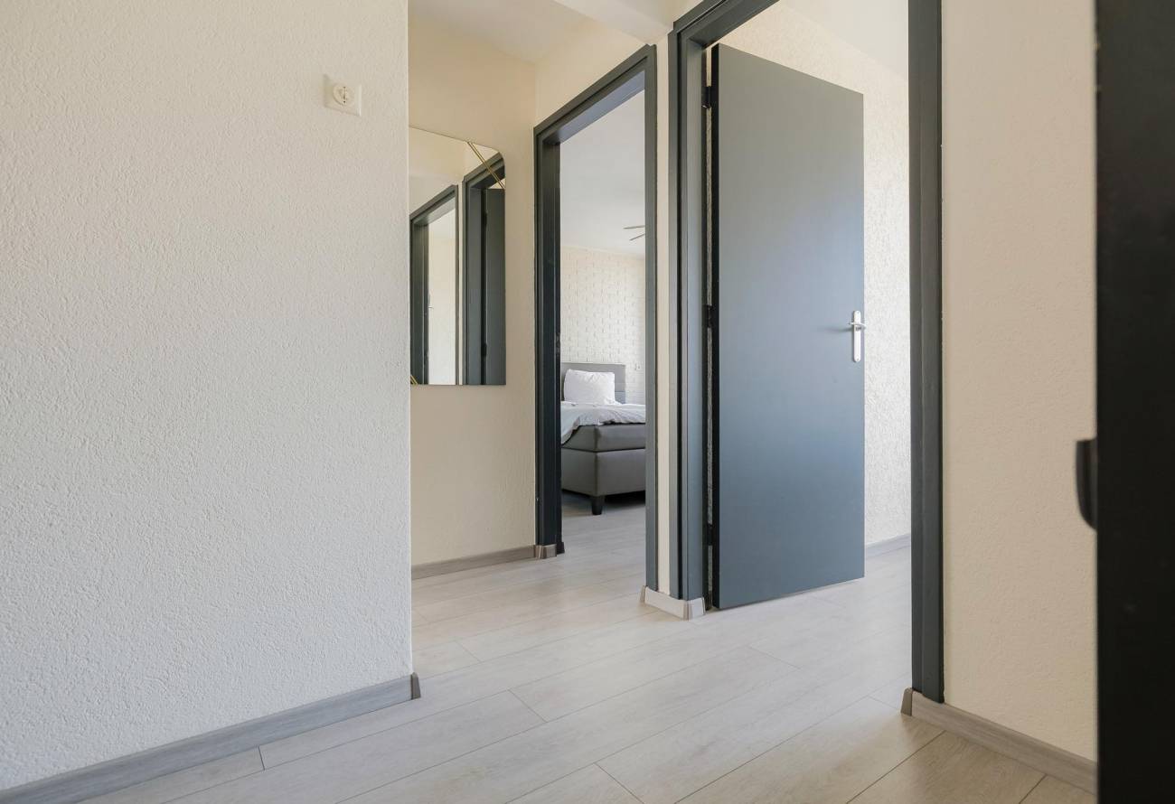 Overloop, hoofdslaapkamer aan achterzijde met vaste kastenwand, 2e grote slaapkamer aan voorzijde en 3e kleinere slaapkamer. Alle slaapkamers zijn voorzien van een fraaie laminaatvloer met grijs eiken look. Luxe badkamer met brede wastafel voorzien van twee kranen waaronder meubel, inloopdouche met hardglazen wanden en deur, wandcloset.