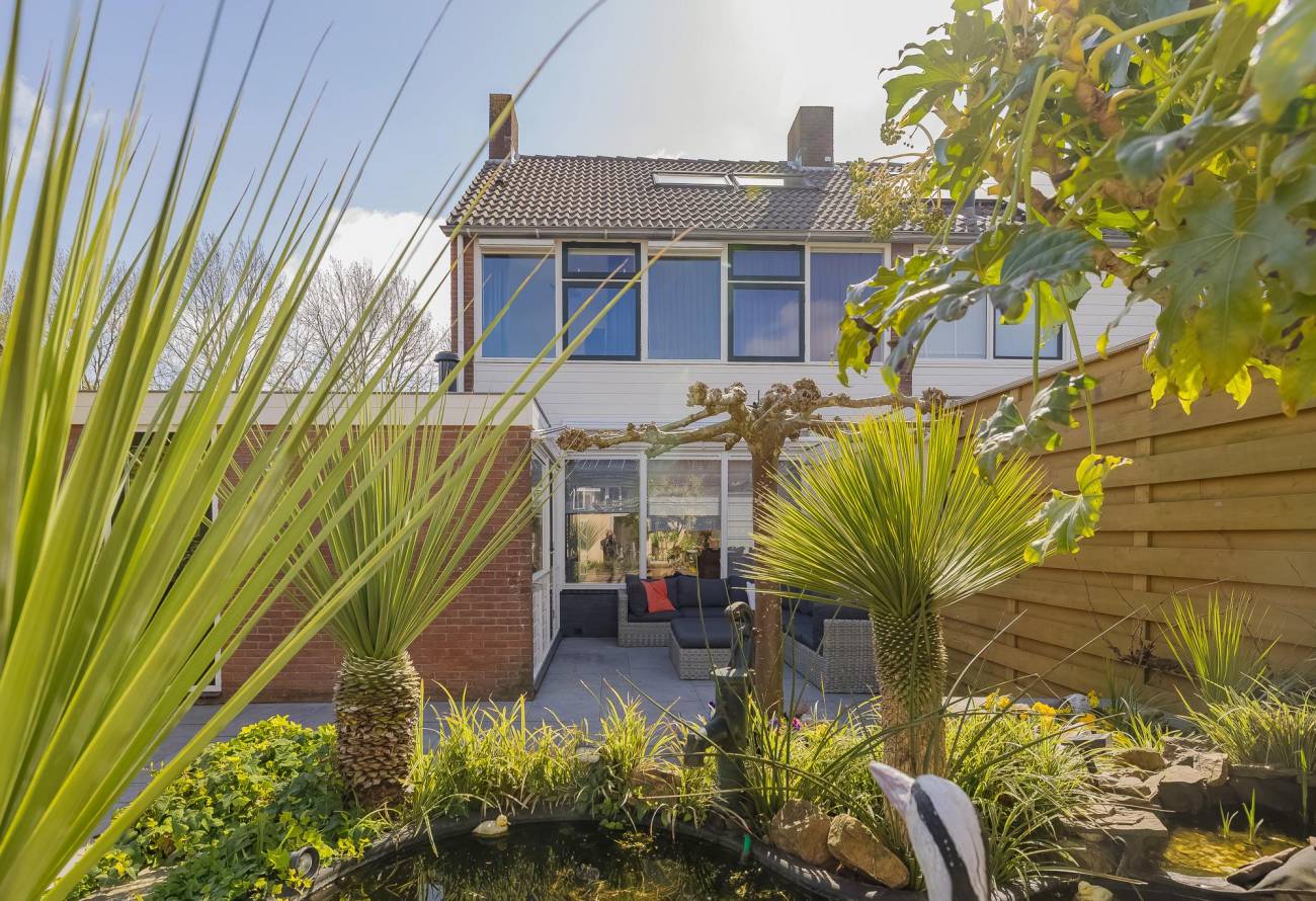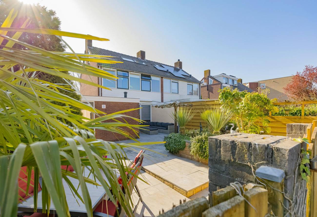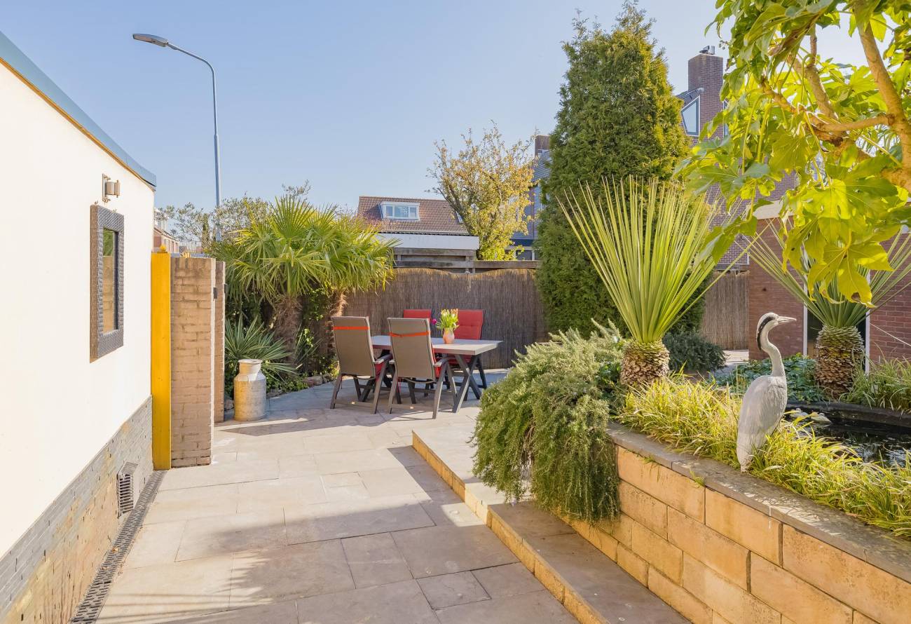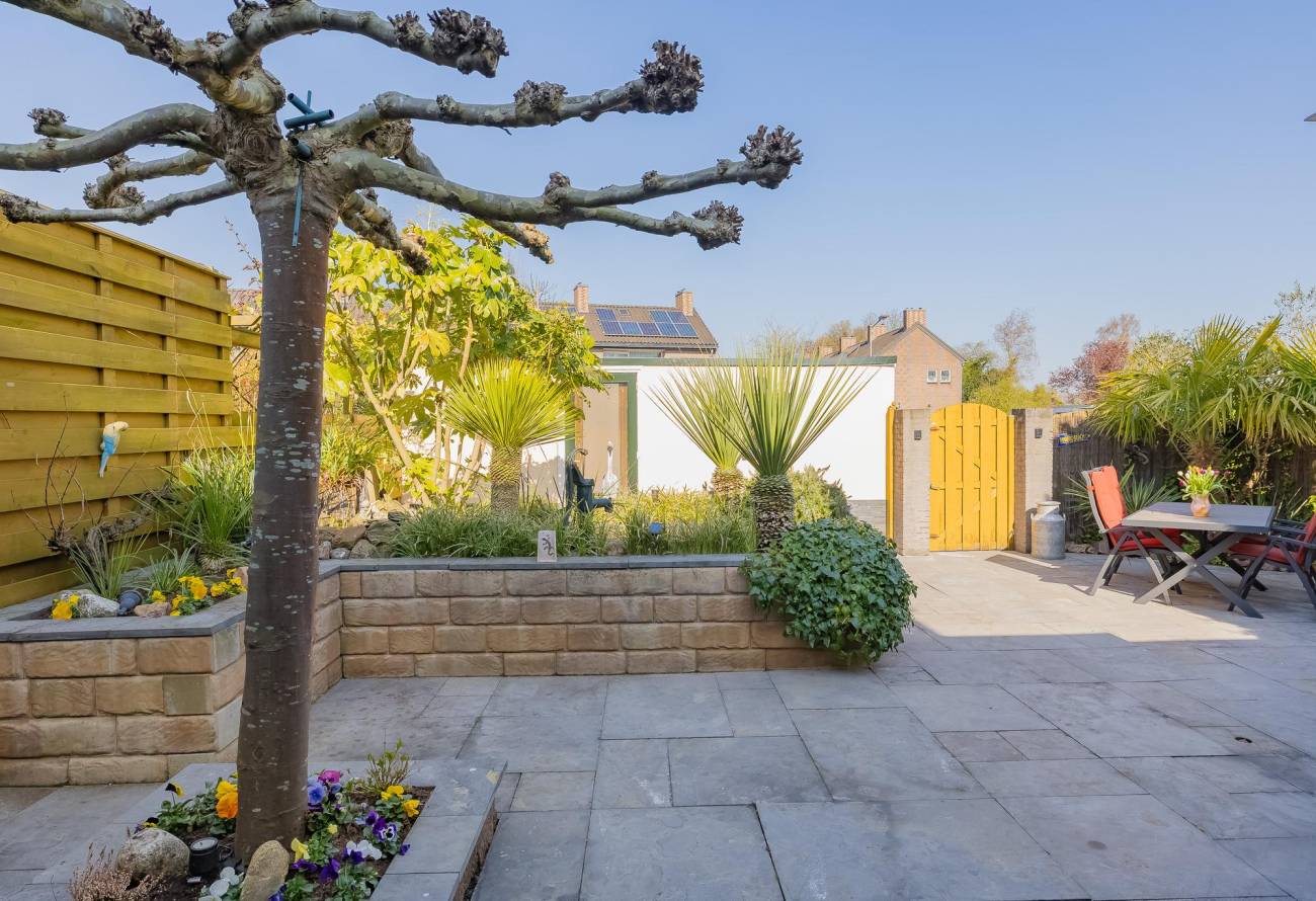 Zeer fraai aangelegde achtertuin van 10 meter breed en 10 meter diep in een moderne Tropische stijl met veel privacy. Diverse terrassen, palmbomen en een zeer fraai verhoogde vijverpartij met o.a. een beekstroom en lopende waterpomp. Ook is er een groot elektrisch zonnescherm zodat het zelfs in de warme tropische dagen heerlijk toeven is in deze tuin.