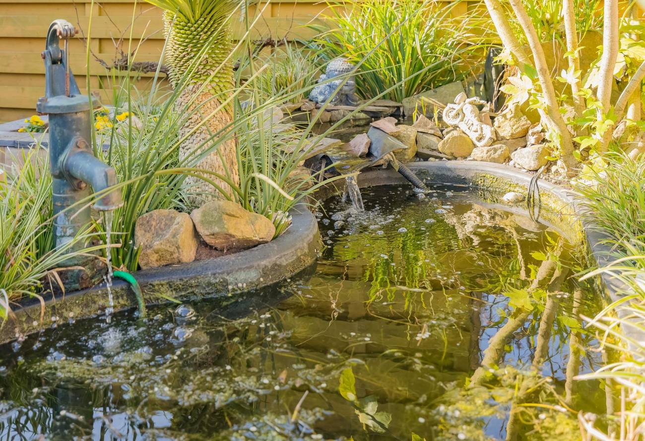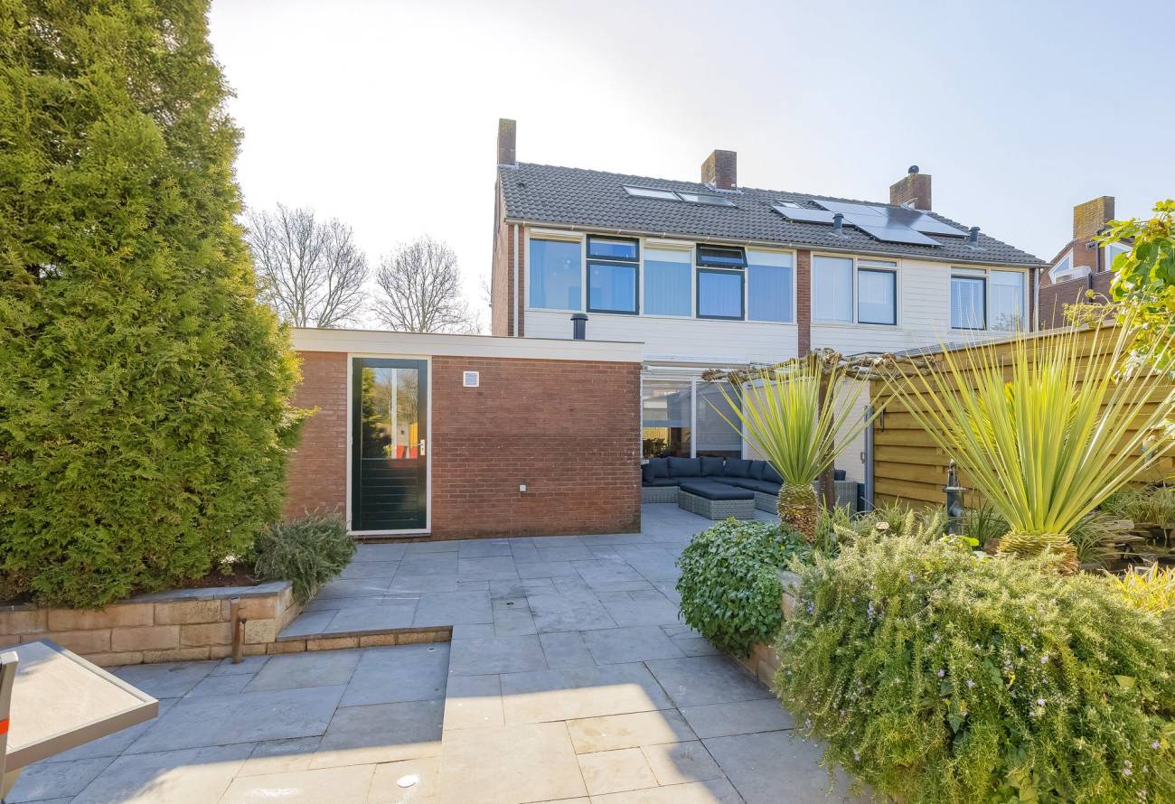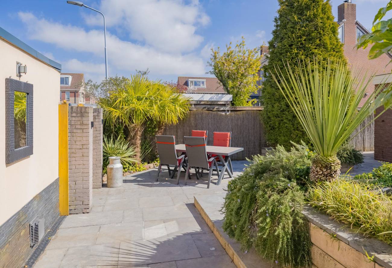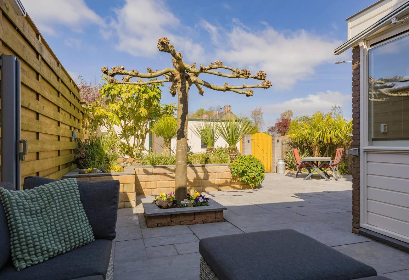 Zeer fraai aangelegde achtertuin van 10 meter breed en 10 meter diep in een moderne Tropische stijl met veel privacy. Diverse terrassen, palmbomen en een zeer fraai verhoogde vijverpartij met o.a. een beekstroom en lopende waterpomp. Ook is er een groot elektrisch zonnescherm zodat het zelfs in de warme tropische dagen heerlijk toeven is in deze tuin.