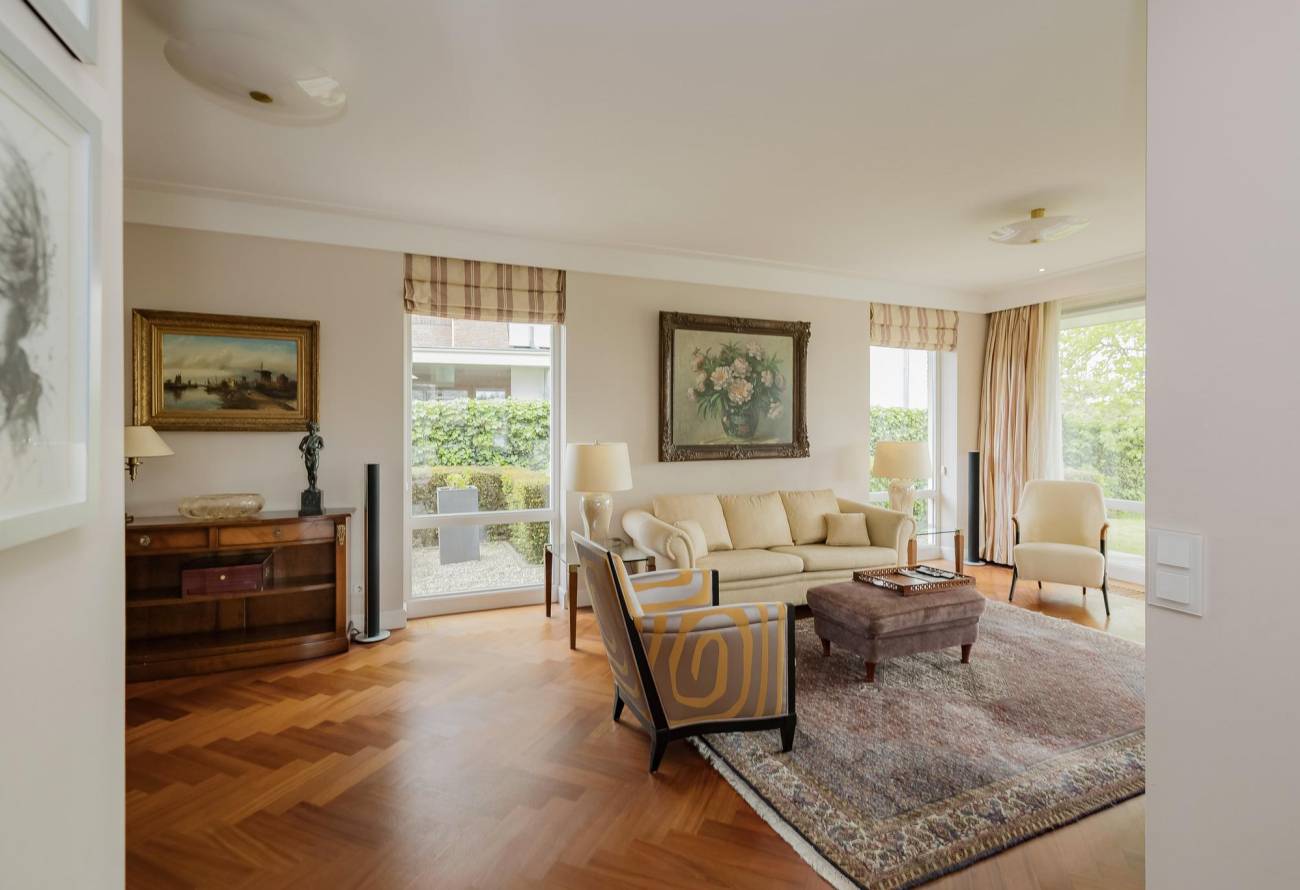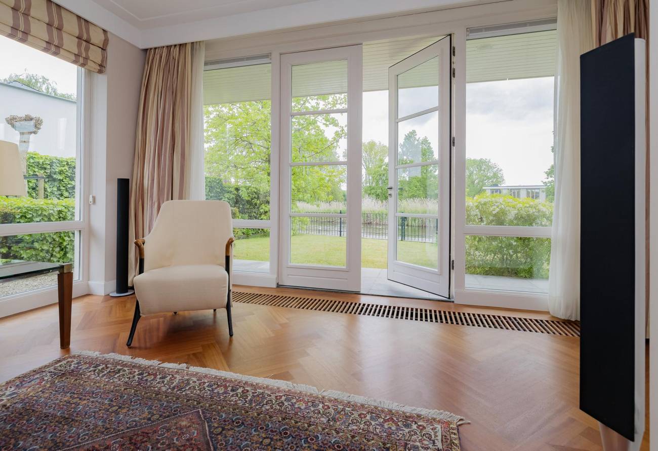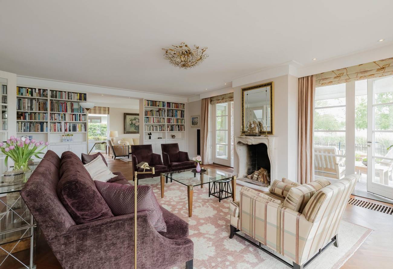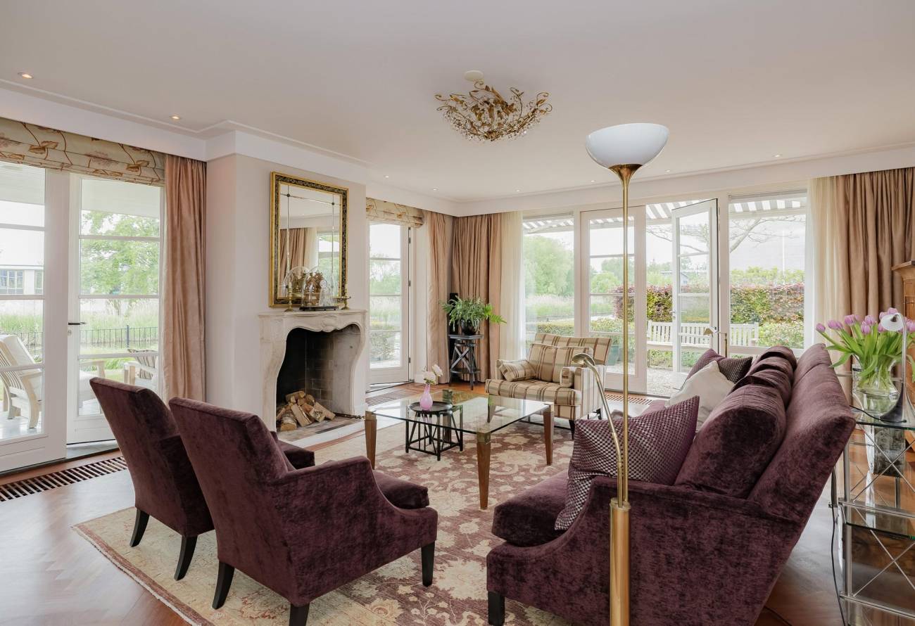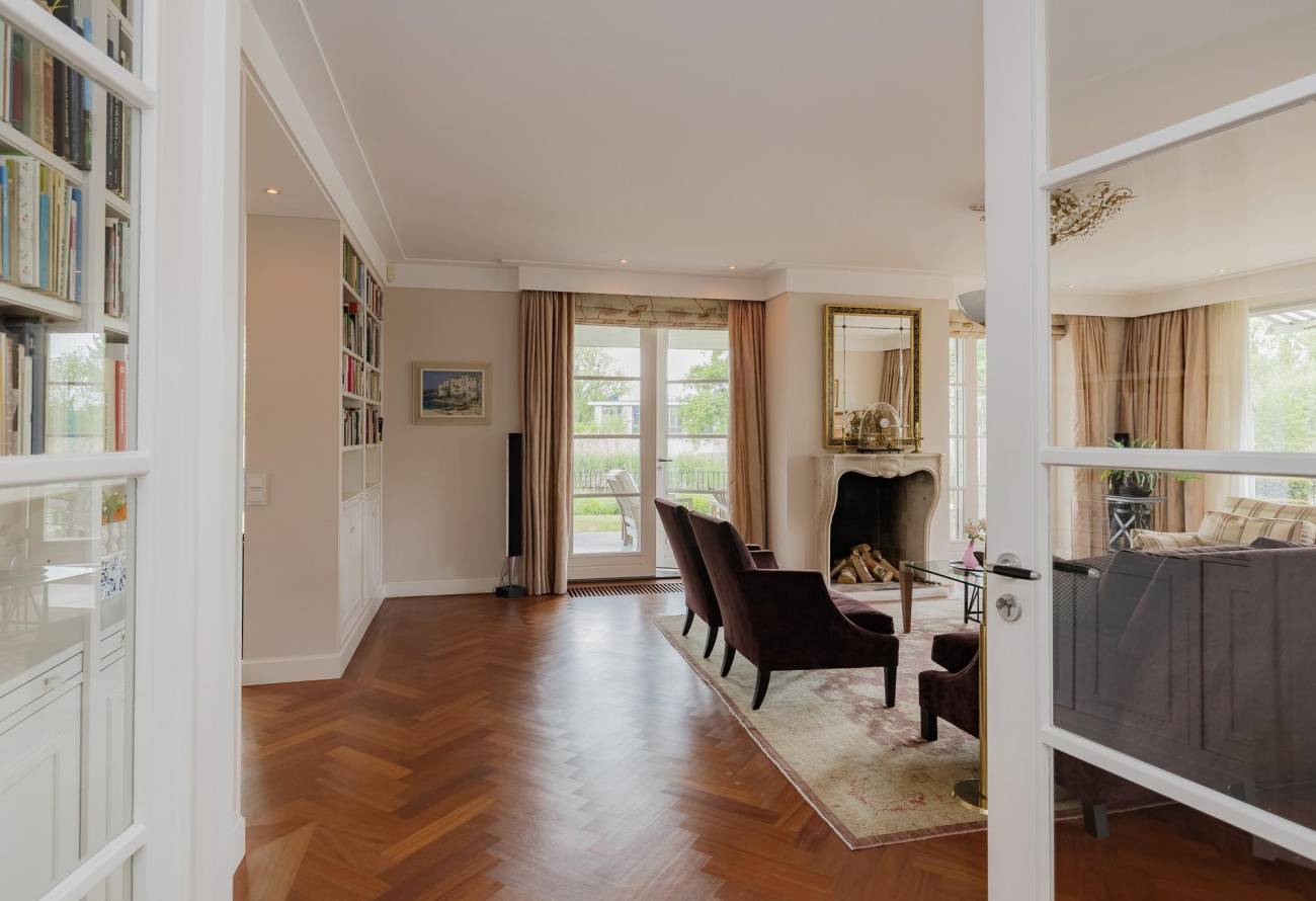 Bij binnenkomst valt direct de royale entree met het prachtige trappenhuis op. De living is ruim opgezet; woonkamer, eetkamer en tv-kamer staan in open verbinding met elkaar en dankzij de grote raampartijen geniet u van een prachtig uitzicht op de tuin en het water. Iedere kamer heeft openslaande deuren naar de terrassen en er is een veranda aan de woonkamer. De open haard zorgt voor een warme sfeer, terwijl de open indeling ideaal is voor zowel ontspanning als gastvrijheid.