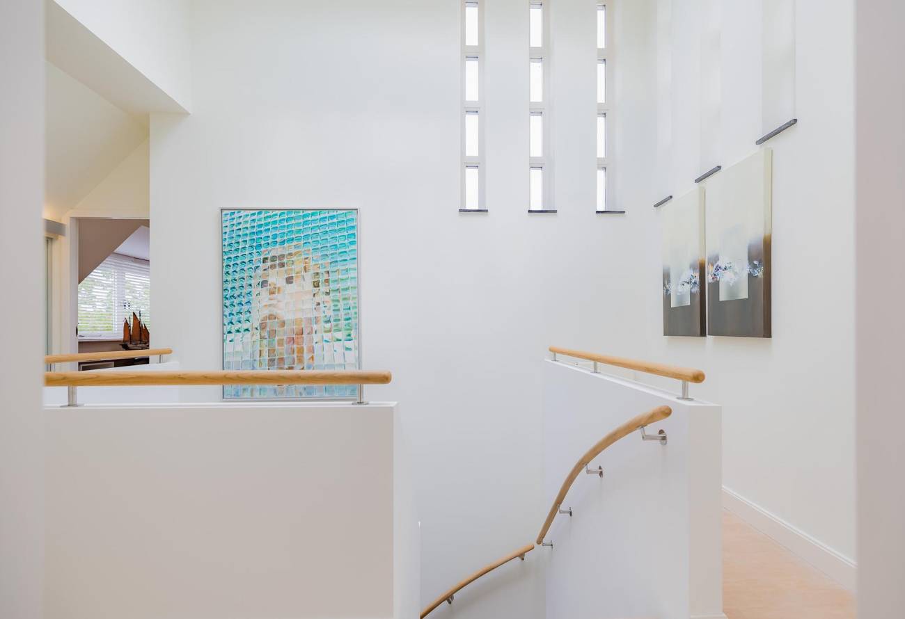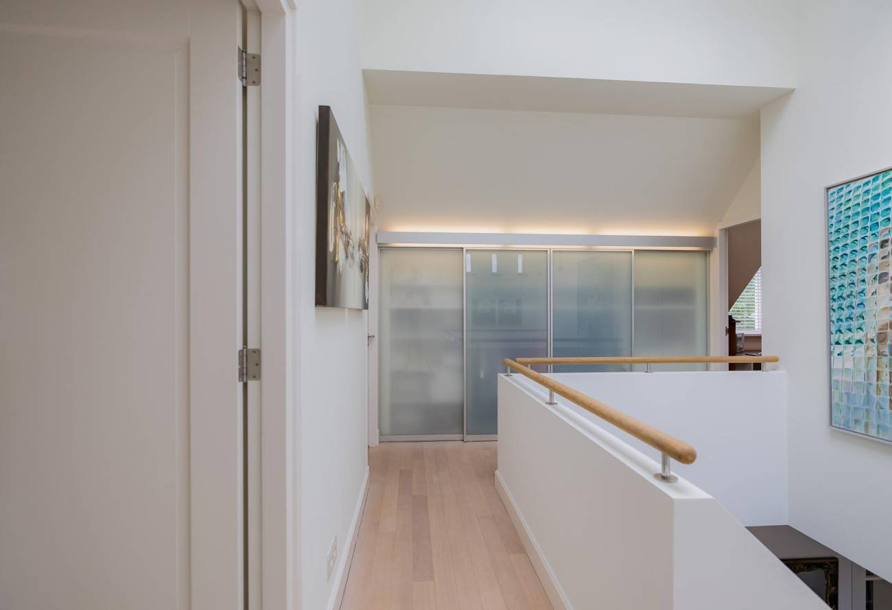 De overloop voorzien van een prachtige glazen schuifdeurkast.