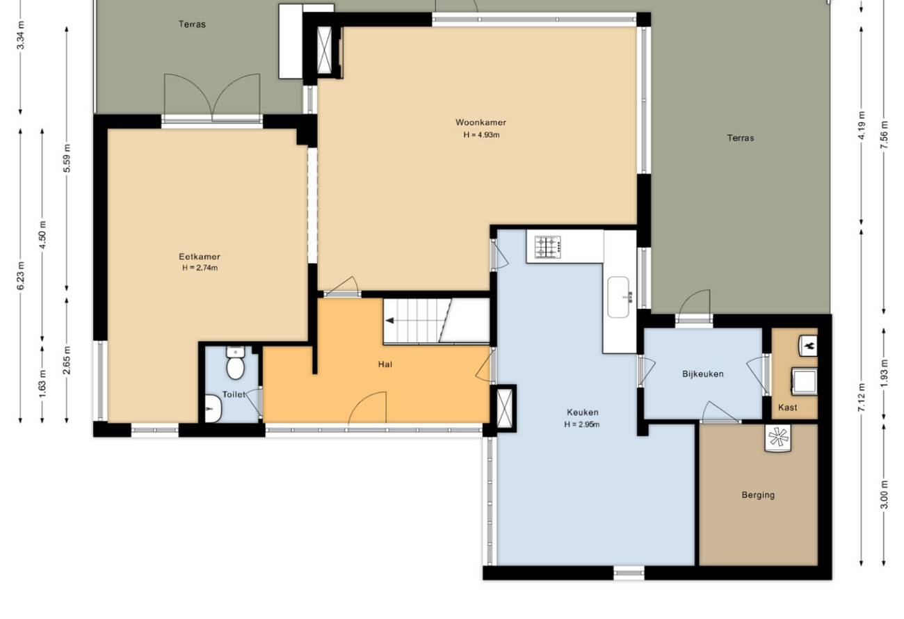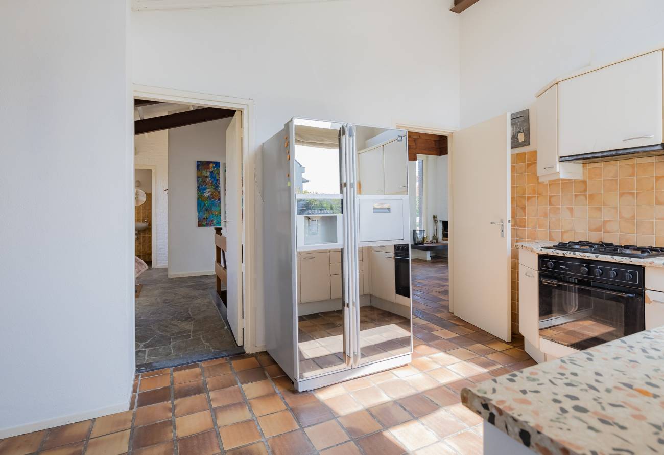 De villa biedt een royale living met grote raampartijen, waardoor het natuurlijke licht rijkelijk binnenvalt. Vanuit de woon- en eetkamer heeft u directe toegang tot een groot en zonnig terras, compleet met een sfeervolle buitenhaard – perfect voor lange zomeravonden of knusse wintermomenten buiten. In de ruime eetkeuken is plaats voor een royale eettafel voor gezellige diners. Achter de keuken is een bijkeuken met toegang tot een inpandige berging.