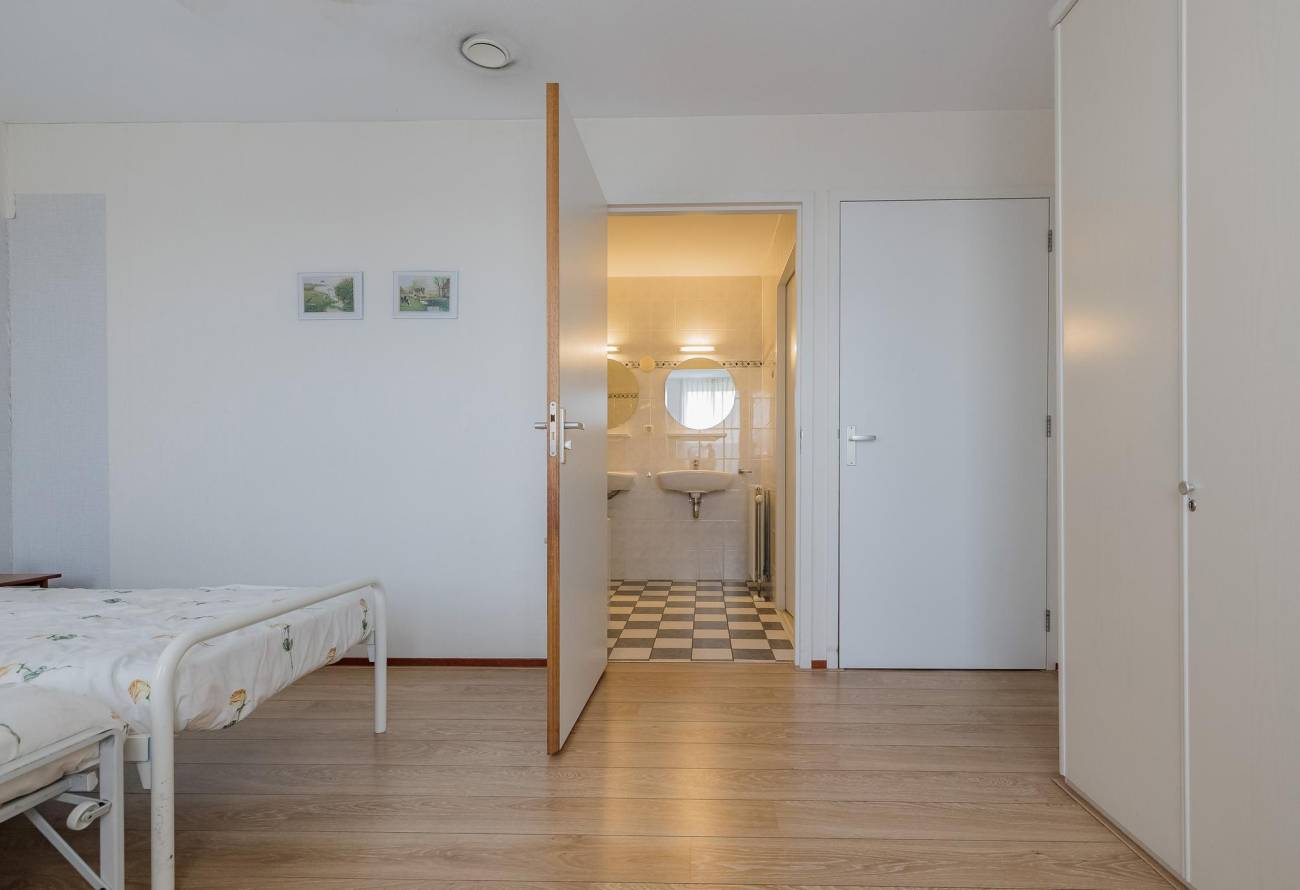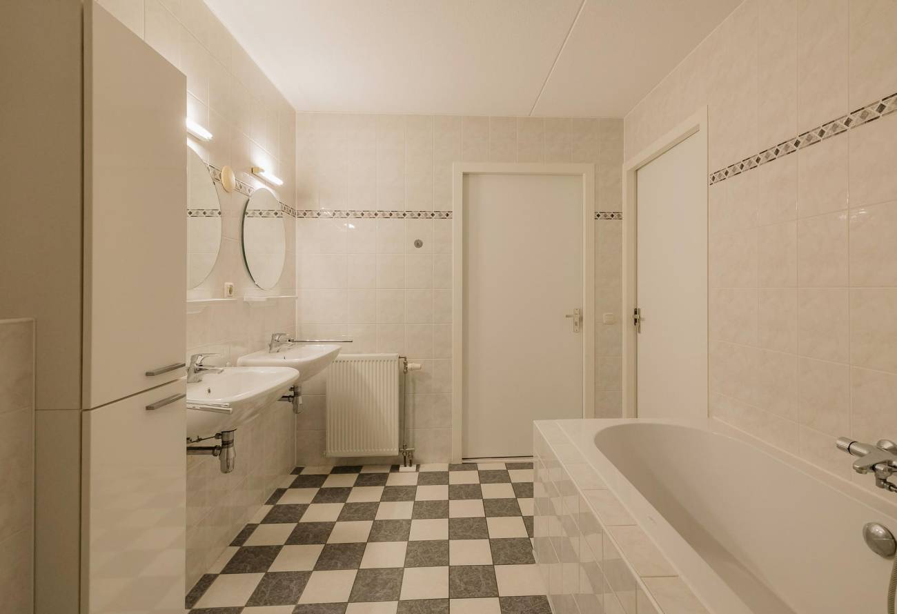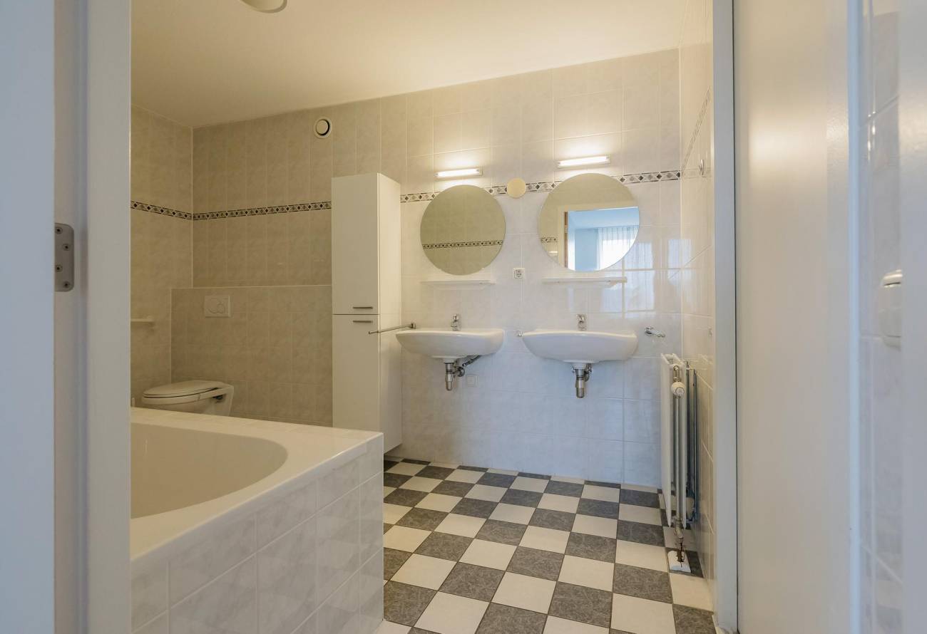 Royale hoofdslaapkamer met kastenwand, 2e ruime slaap-/werkkamer, grote badkamer met ligbad, doucheruimte, 2e toilet, 2 wastafels en vrijhangend meubel.