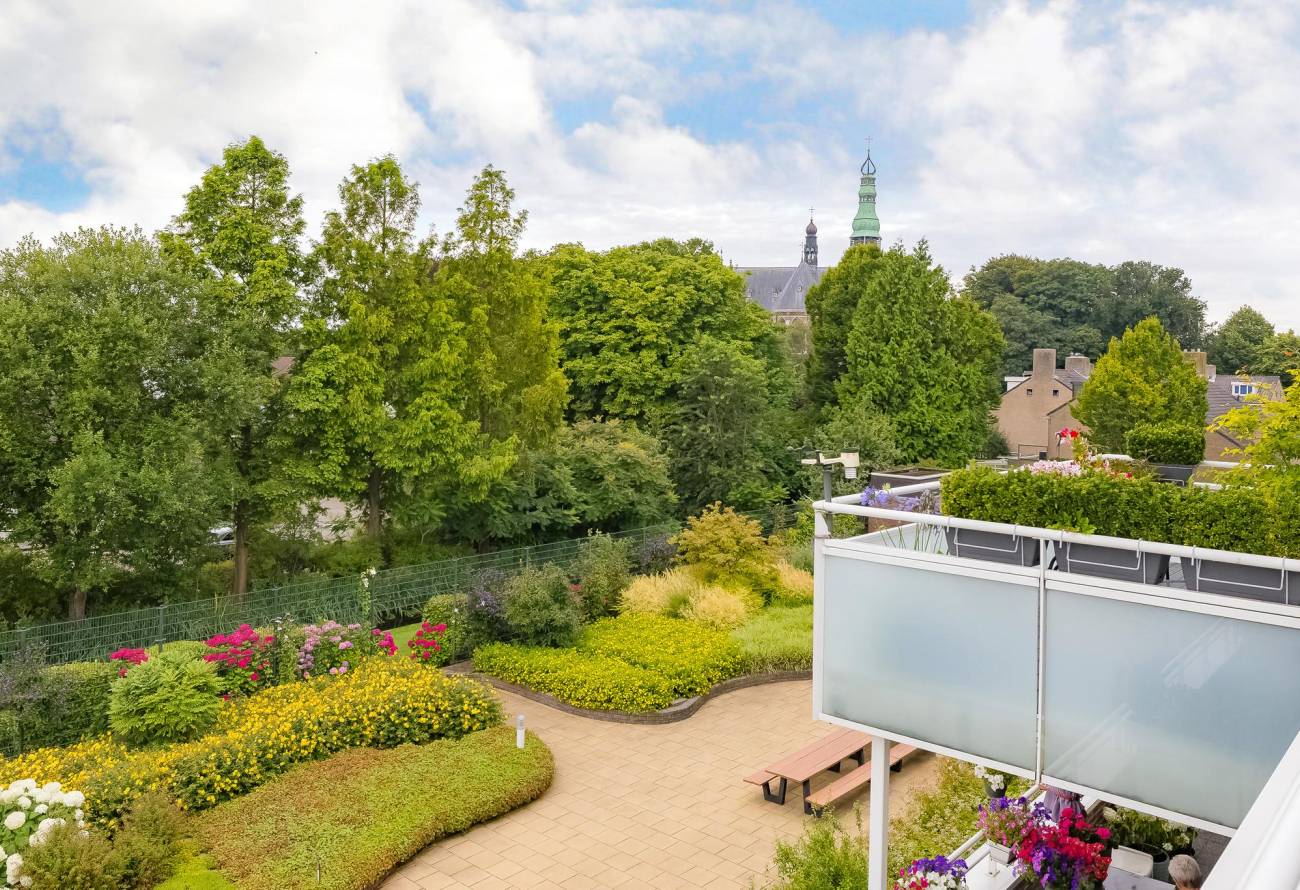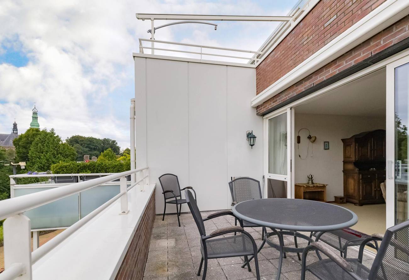 Omdat het appartement in het centrum ligt, kunt u de winkels en andere voorzieningen zoals openbaar vervoer (bus), huisarts en gemeentehuis lopend bereiken. Het fantastische terras van 15m² ligt op het Zuidwesten en biedt uitzicht over de gezamenlijke privé tuin aan de achterzijde van het gebouw. Vanuit het appartement is er heerlijk vrij uitzicht en zicht op de Sint Agathakerk.