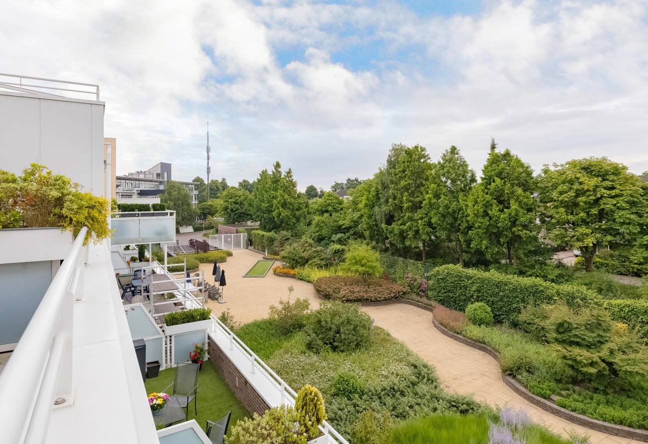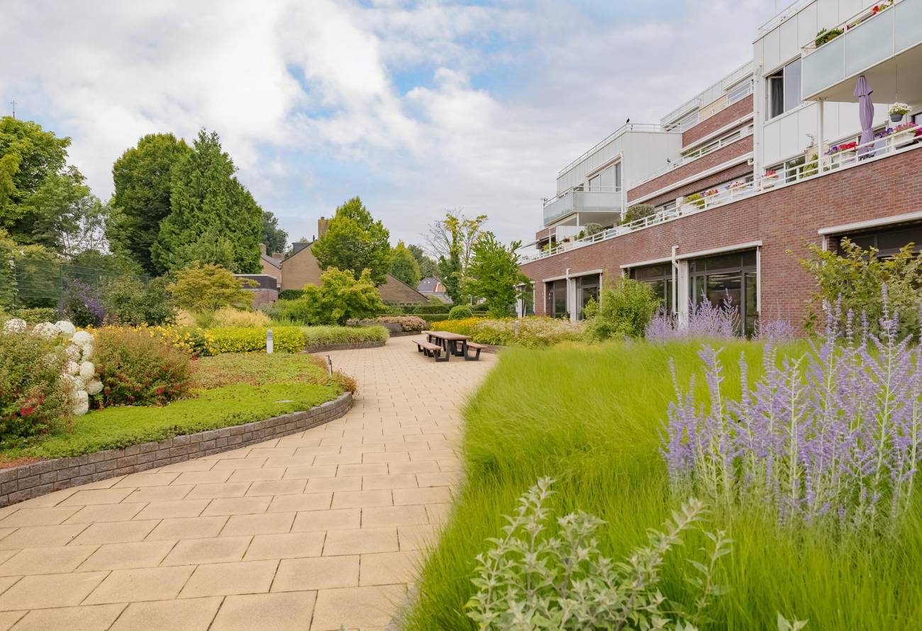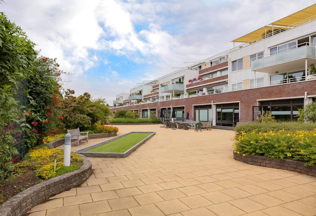 Het appartement heeft zelf de beschikking over een groot terras/balkon. Achter het gebouw ligt een gezamenlijke tuin in een parkachtige sfeer aangelegd met o.a. een jeu-de-boules baan en diverse terrassen waar bewoners elkaar kunnen ontmoeten.