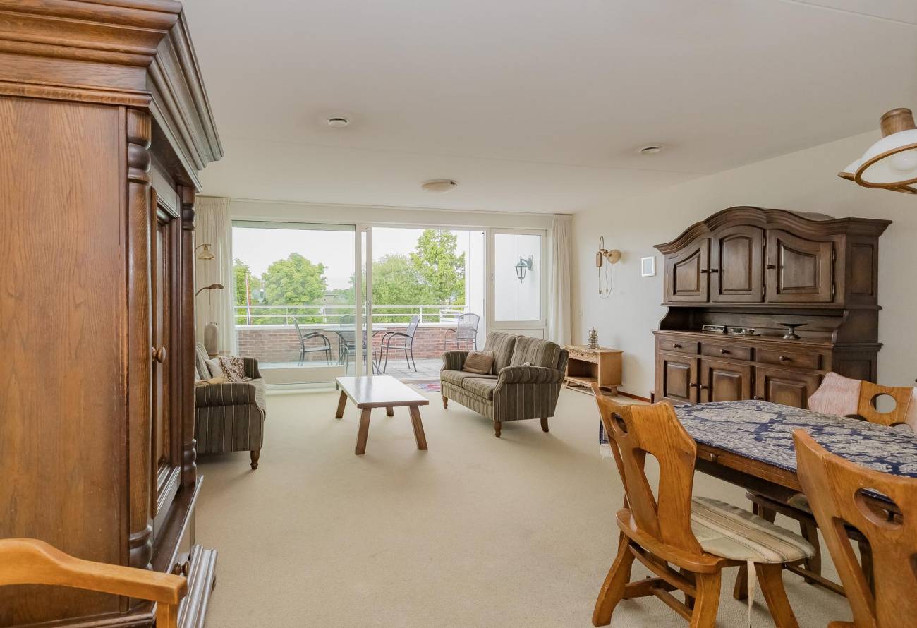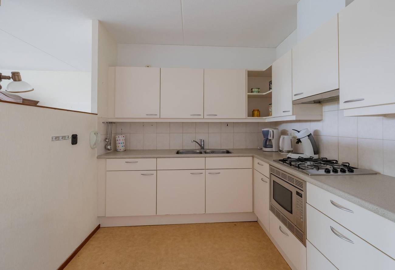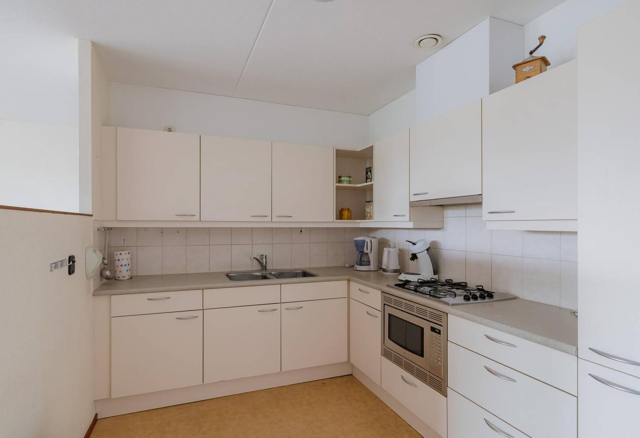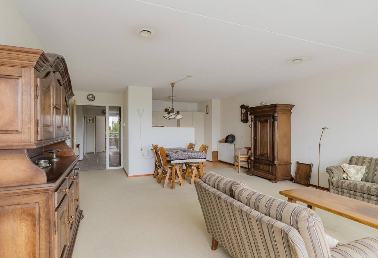 Indeling appartement: Ruime hal met crème tegelvloer, video-intercom, technische ruimte, toiletruimte en garderobe. Zeer lichte en ruime woonkamer met schuifpui naar groot terras/balkon op het zuidwesten, open keuken met nette offwhite keukeninrichting in L-opstelling, diverse inbouwapparatuur o.a. gaskookplaat, combi-oven, koelkast en afzuigkap.