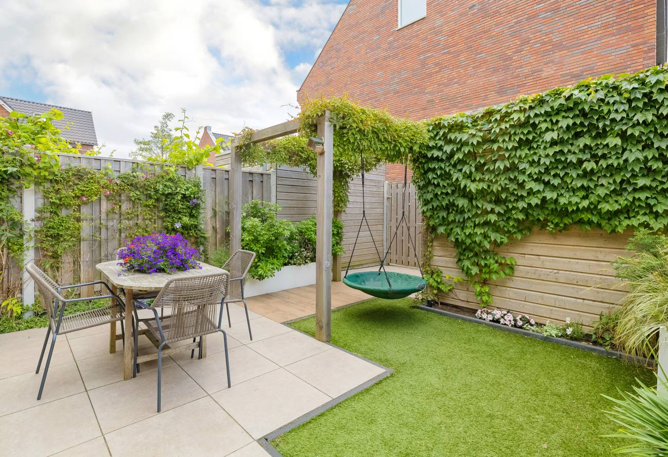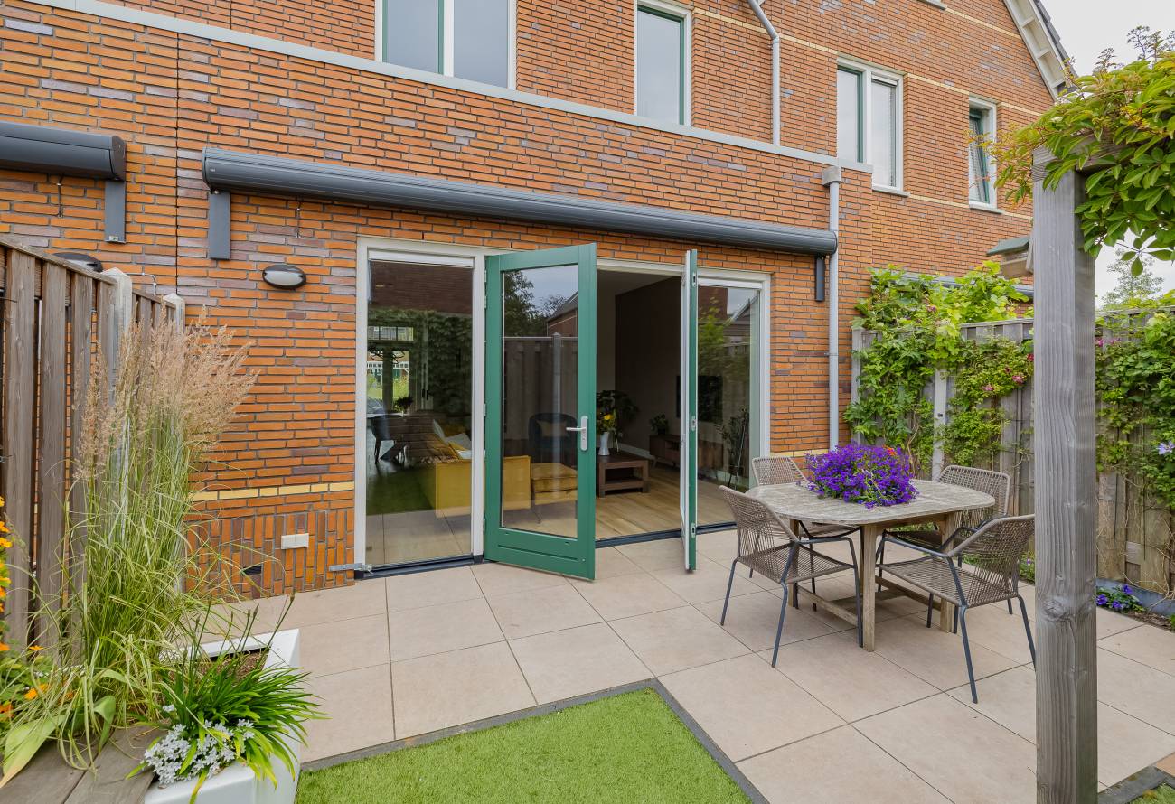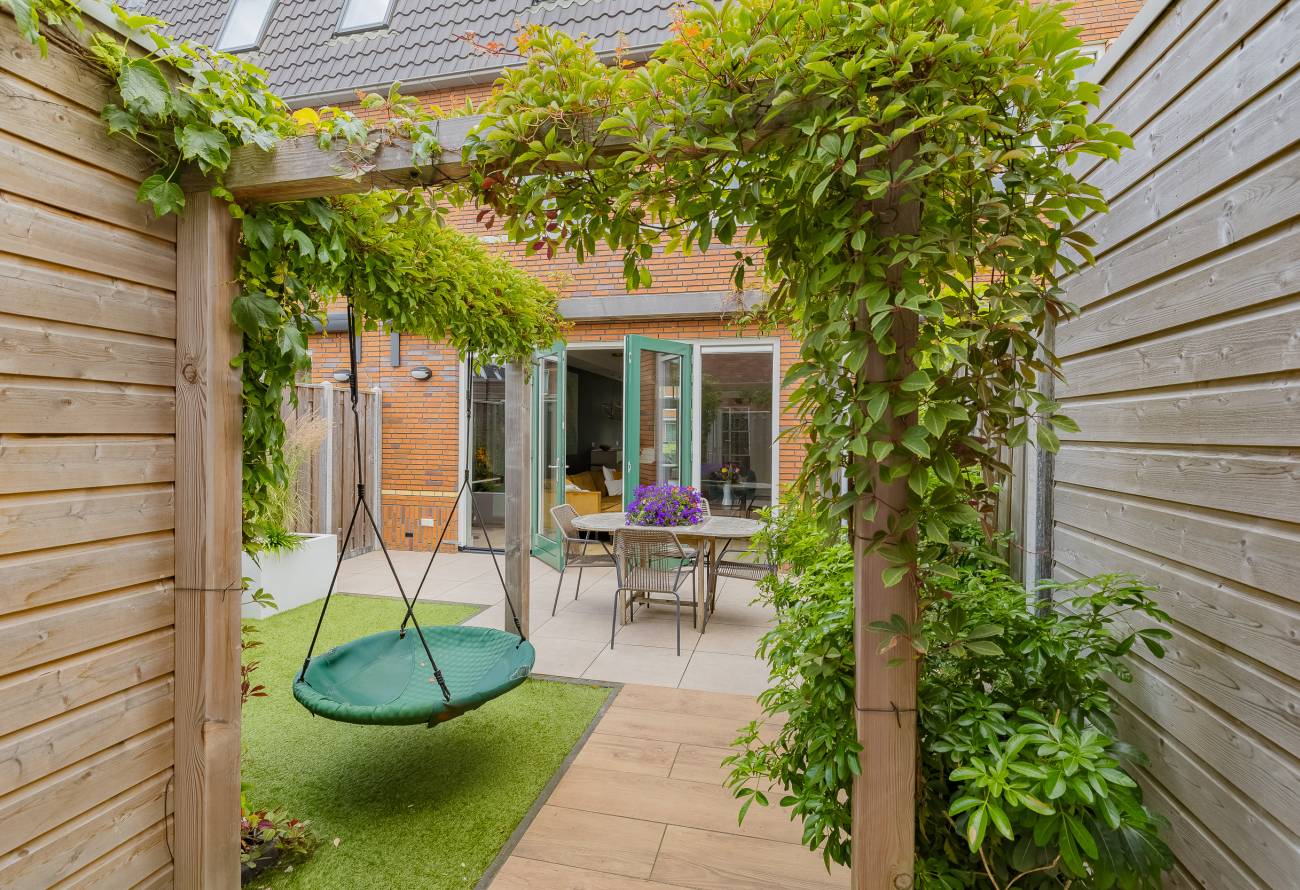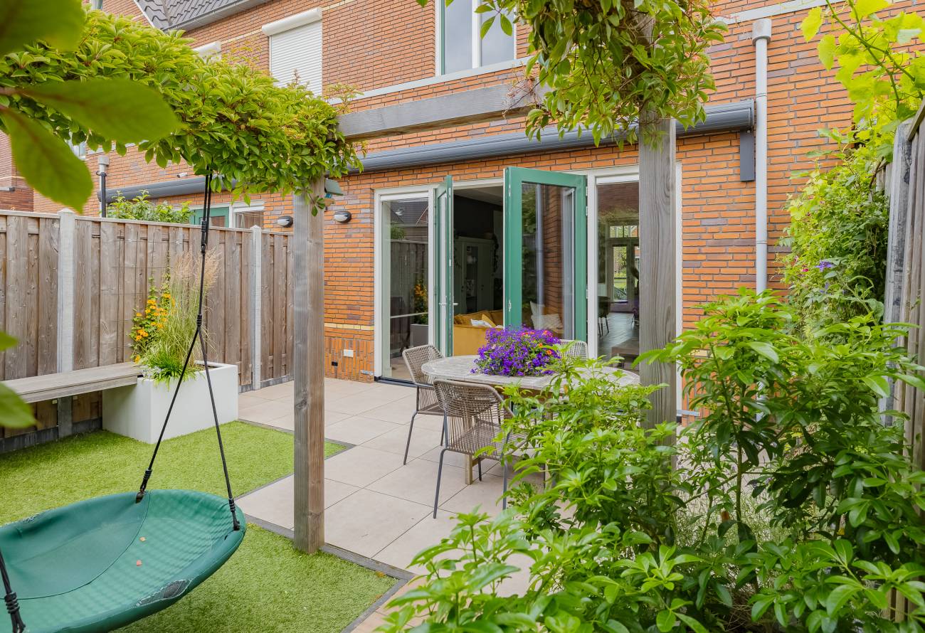 Aan de voorzijde vind je een charmante veranda en voortuin, gelegen aan een rustige wadi en volledig autovrij: een veilige, groene en speelse omgeving waar kinderen vrij kunnen spelen en buren elkaar ontmoeten. De zonnige achtertuin op het zuiden is bereikbaar via de openslaande deuren en biedt volop privacy – een fijne plek voor zowel ontspanning als spelende kinderen. Een praktische berging en achterom maken het compleet. Via de achterom kom je snel bij je eigen parkeerplaats.