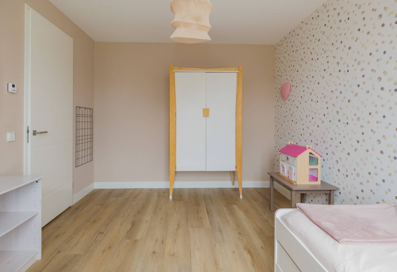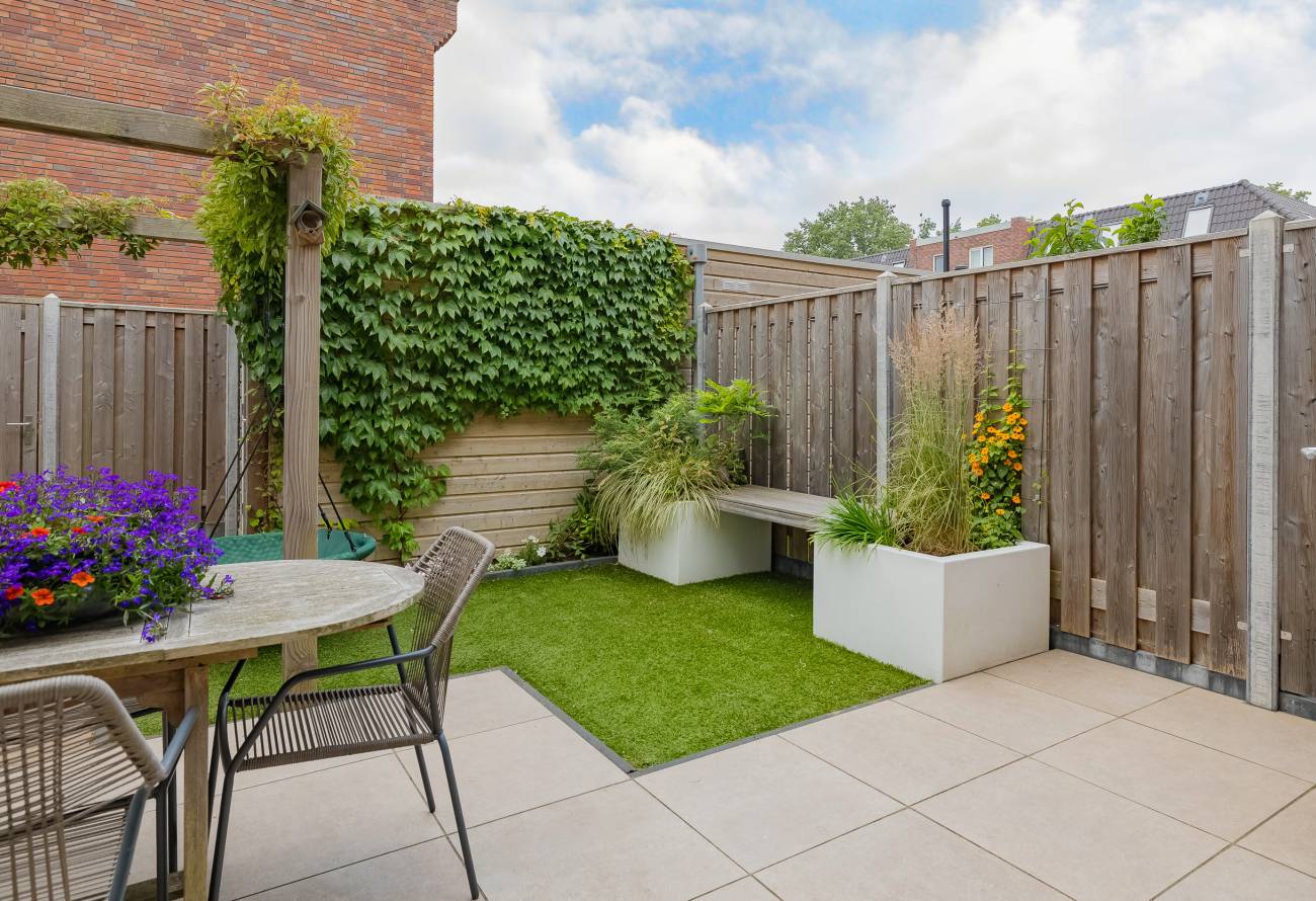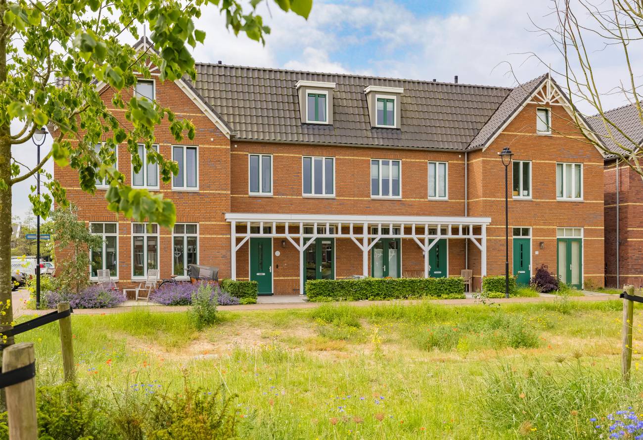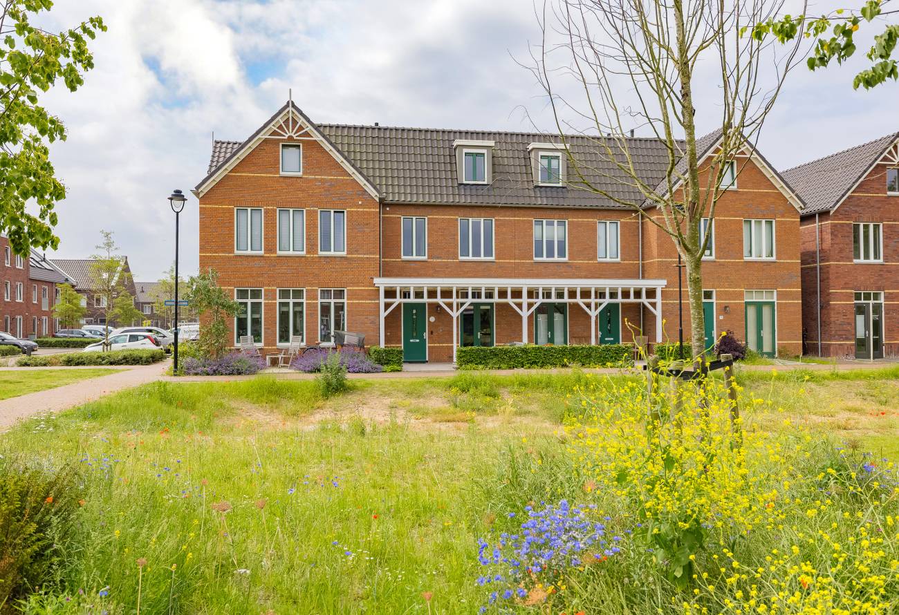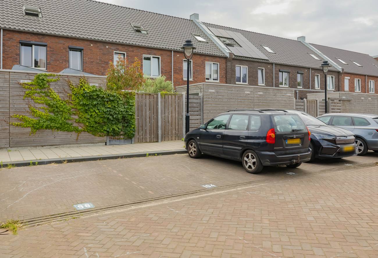 Aan de voorzijde vind je een charmante veranda en voortuin, gelegen aan een rustige wadi en volledig autovrij: een veilige, groene en speelse omgeving waar kinderen vrij kunnen spelen en buren elkaar ontmoeten. De zonnige achtertuin op het zuiden is bereikbaar via de openslaande deuren en biedt volop privacy – een fijne plek voor zowel ontspanning als spelende kinderen. Een praktische berging en achterom maken het compleet. Via de achterom kom je snel bij je eigen parkeerplaats.