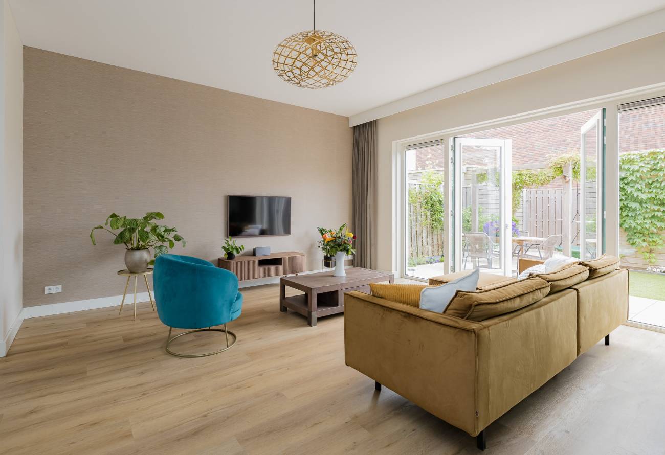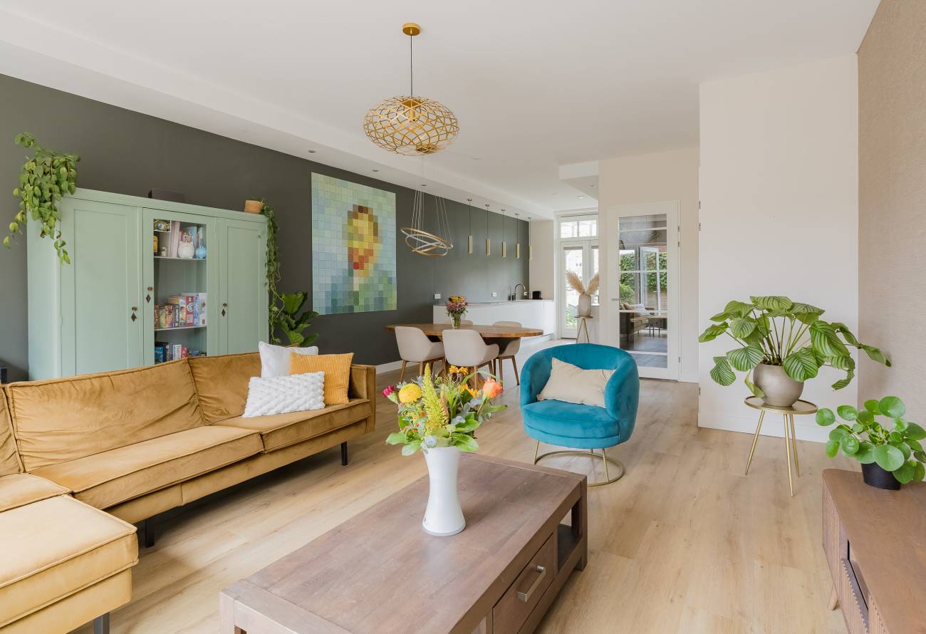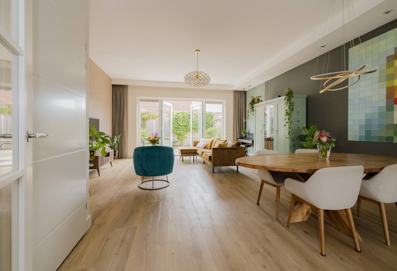 Via de charmante veranda aan de voorzijde van de woning, stap je binnen in de hal welke direct toegang geeft tot de woonkamer. De woonkamer is heerlijk ruim dankzij het ruim drie meter hoge plafond. Grote ramen aan de voor- en achterkant zorgen voor een natuurlijke lichtinval, en via de openslaande deuren loop je zo de zonnige tuin op het Zuiden in – een perfecte plek voor lange zomeravonden, ontspannen lunches en spelende kinderen.