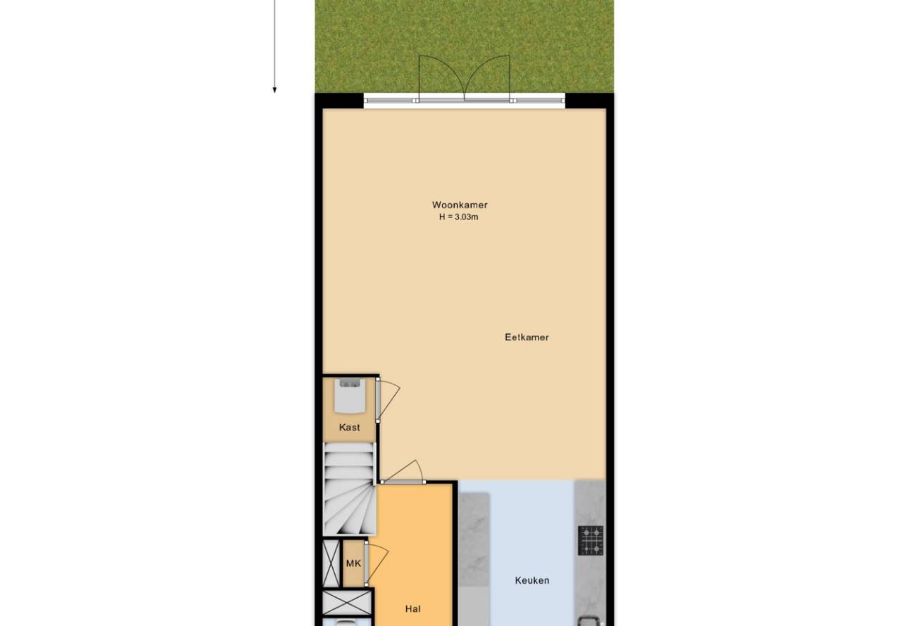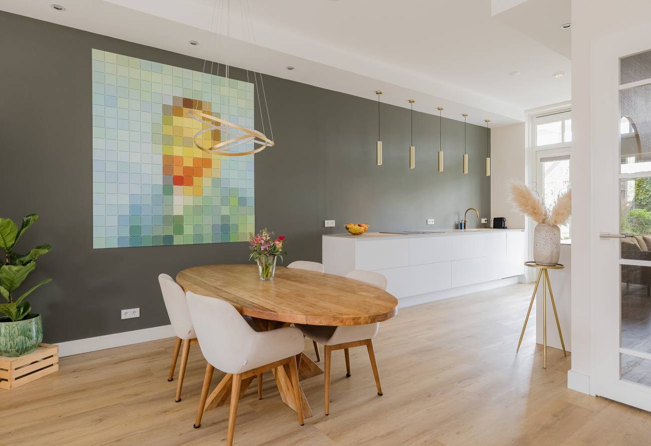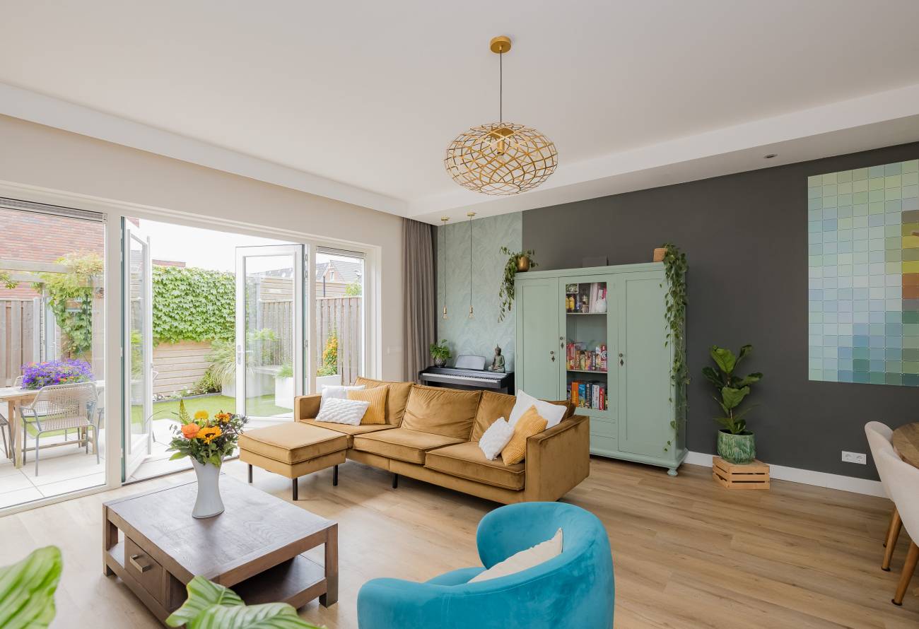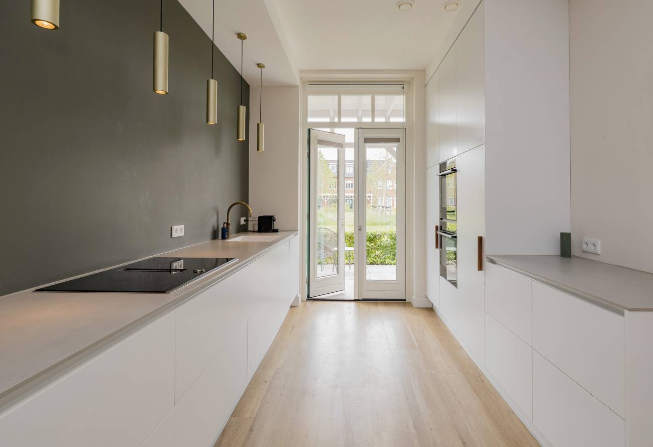 Via de charmante veranda aan de voorzijde van de woning, stap je binnen in de hal welke direct toegang geeft tot de woonkamer. De woonkamer is heerlijk ruim dankzij het ruim drie meter hoge plafond. Grote ramen aan de voor- en achterkant zorgen voor een natuurlijke lichtinval, en via de openslaande deuren loop je zo de zonnige tuin op het Zuiden in – een perfecte plek voor lange zomeravonden, ontspannen lunches en spelende kinderen.