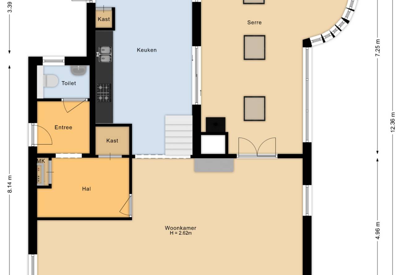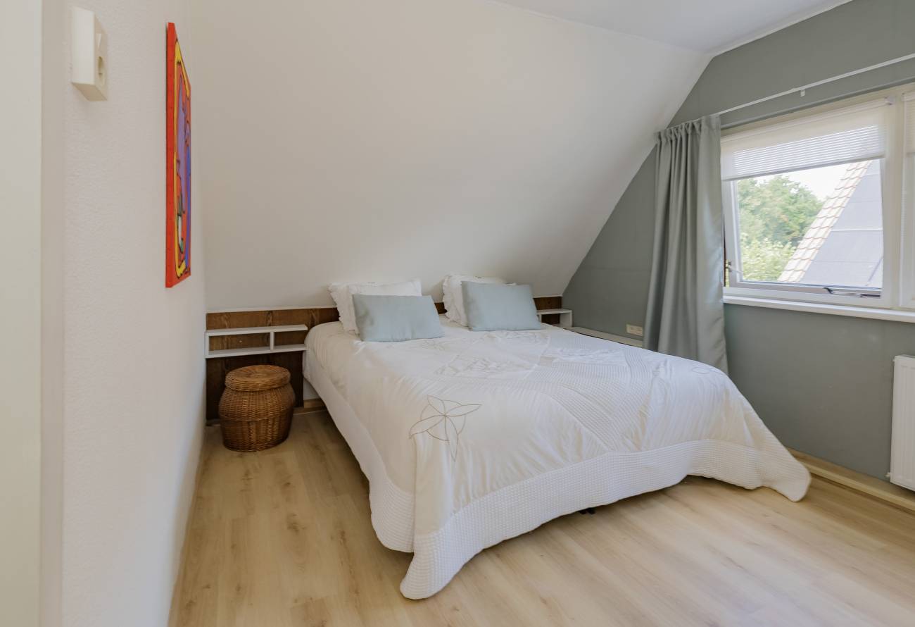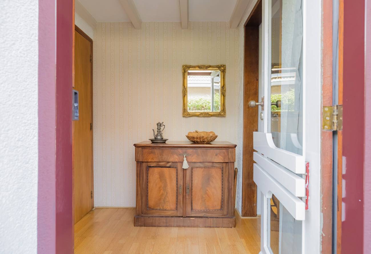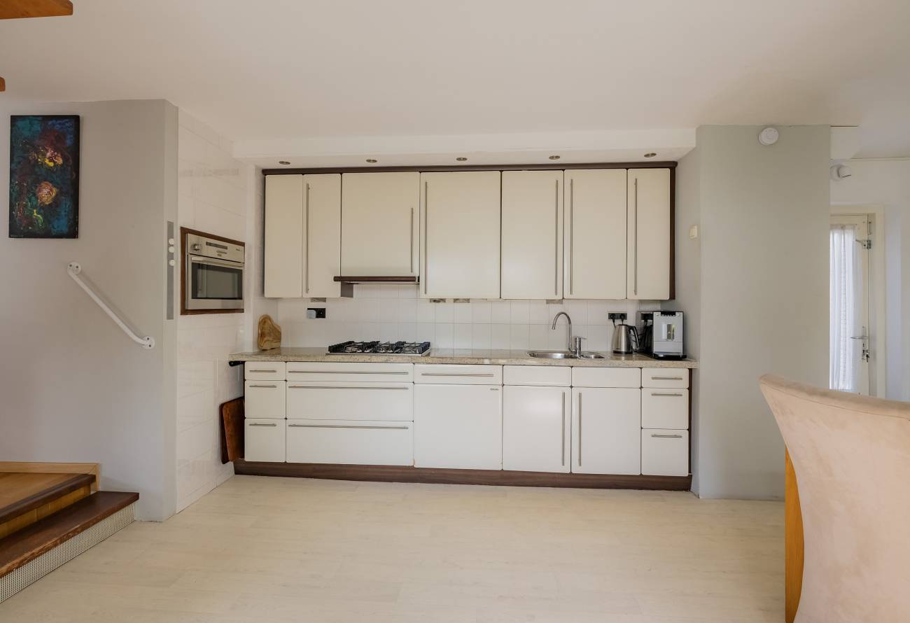 Bij binnenkomst via de hal vind je het toilet, de meterkast en een garderobehoek. Vanuit hier betreed je de royale woonkamer, die dankzij de houten vloer en sfeervolle gashaard een warme uitstraling heeft. De halfopen woonkeuken is royaal opgezet en voorzien van veel bergruimte, een 5-pits gaskookplaat, aansluiting voor wasmachine en droger en een losstaande koelkast die achterblijft.