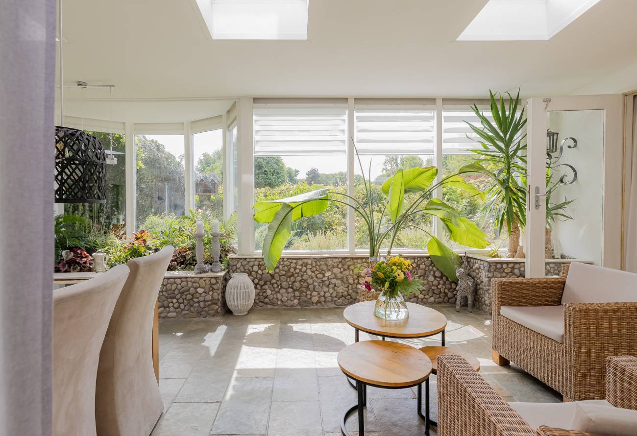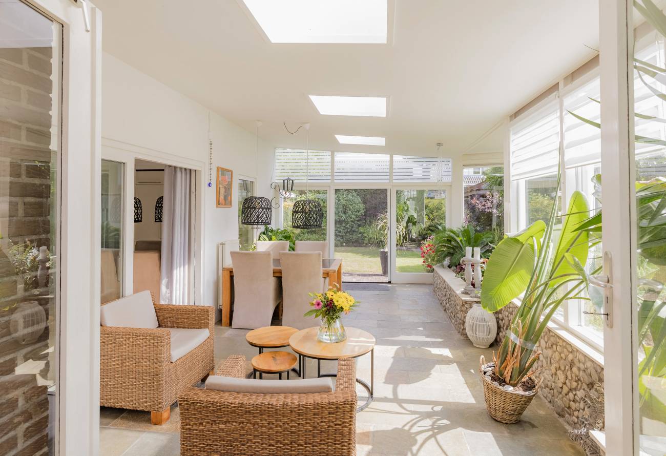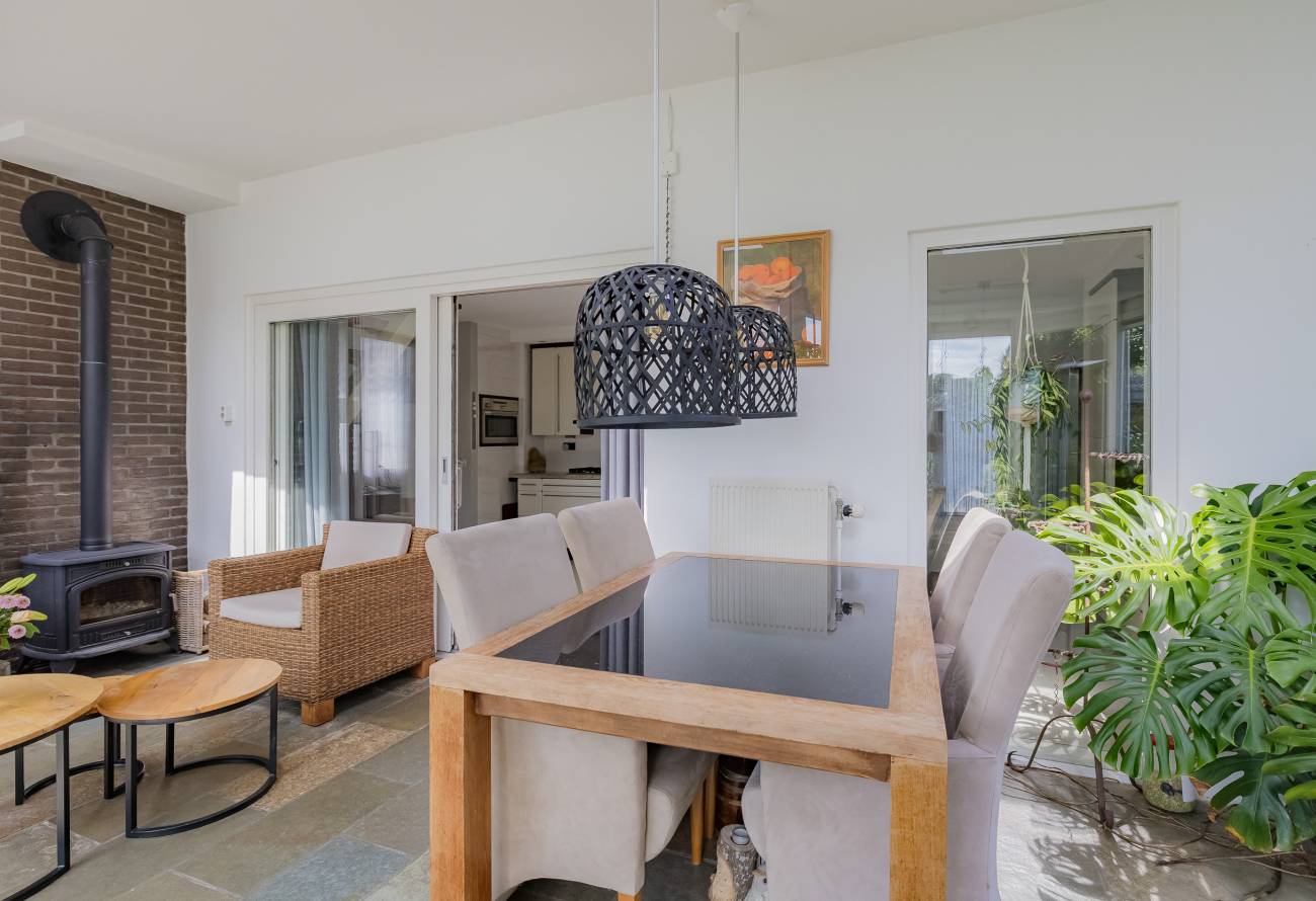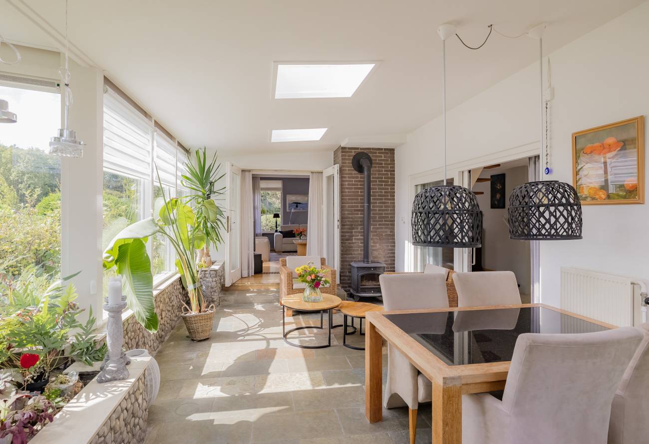 Een absolute eyecatcher is de aangebouwde serre/tuinkamer: een lichte ruimte met drie dakkoepels, vele ramen en openslaande deuren naar de tuin. Hier zijn binnen en buiten prachtig verbonden. De aanwezige houtkachel maakt dit bovendien een plek waar je het hele jaar door in knusse sfeer kunt genieten – van zonnige ochtenden tot winterse avonden.