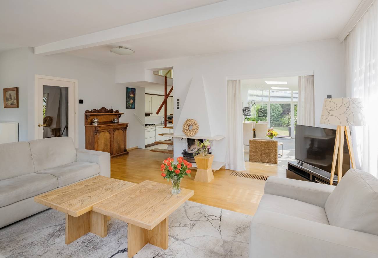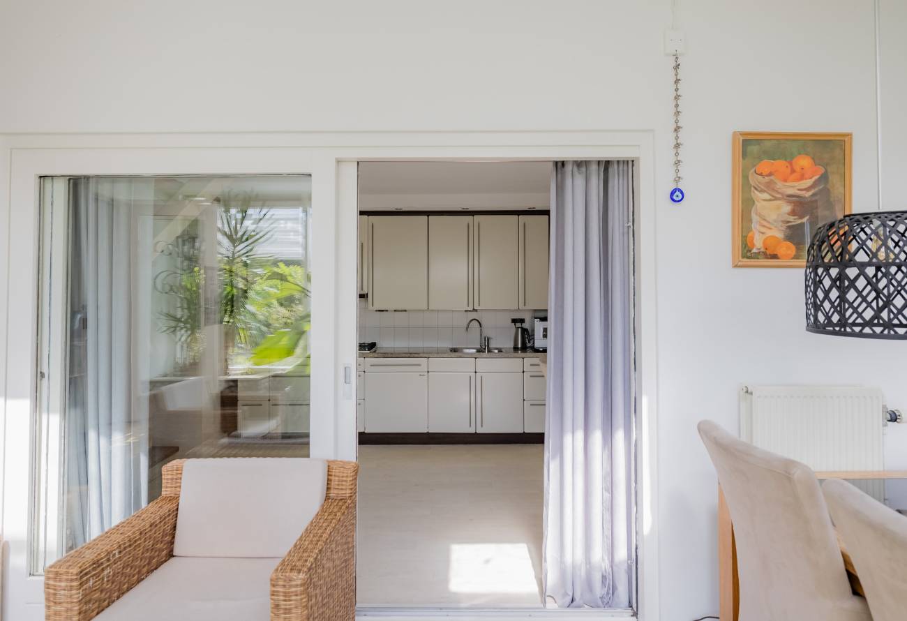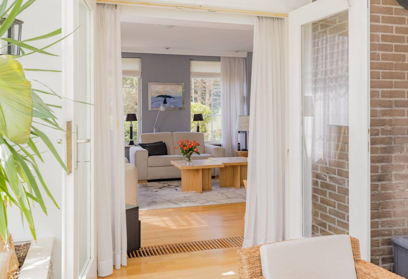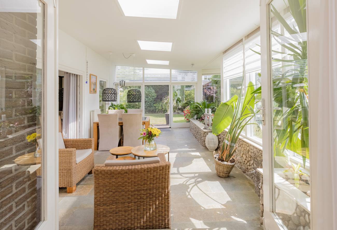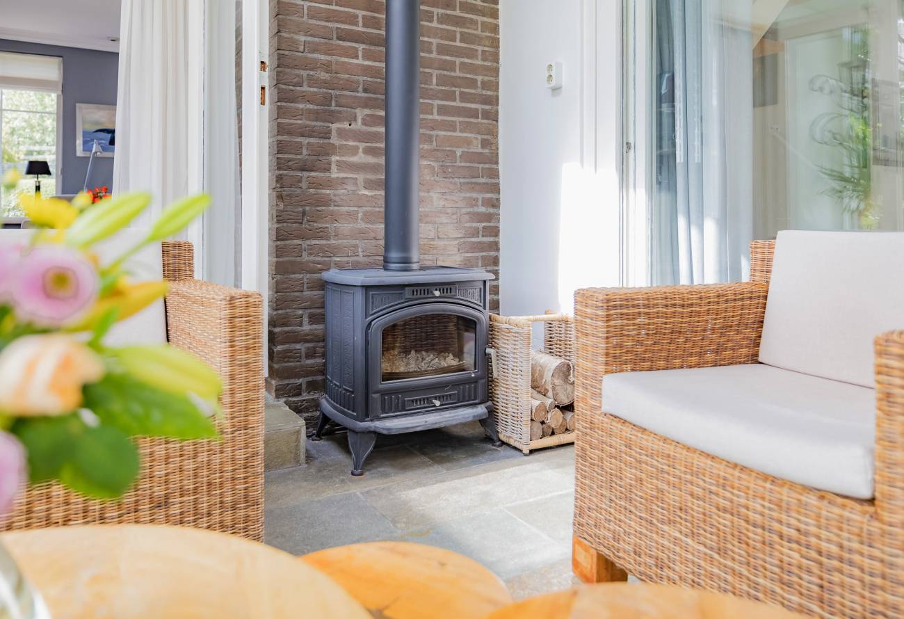 Een absolute eyecatcher is de aangebouwde serre/tuinkamer: een lichte ruimte met drie dakkoepels, vele ramen en openslaande deuren naar de tuin. Hier zijn binnen en buiten prachtig verbonden. De aanwezige houtkachel maakt dit bovendien een plek waar je het hele jaar door in knusse sfeer kunt genieten – van zonnige ochtenden tot winterse avonden.