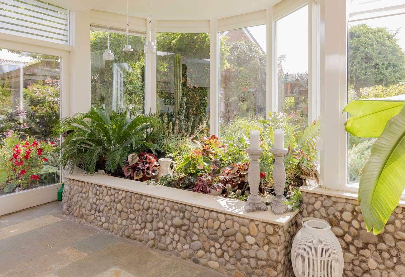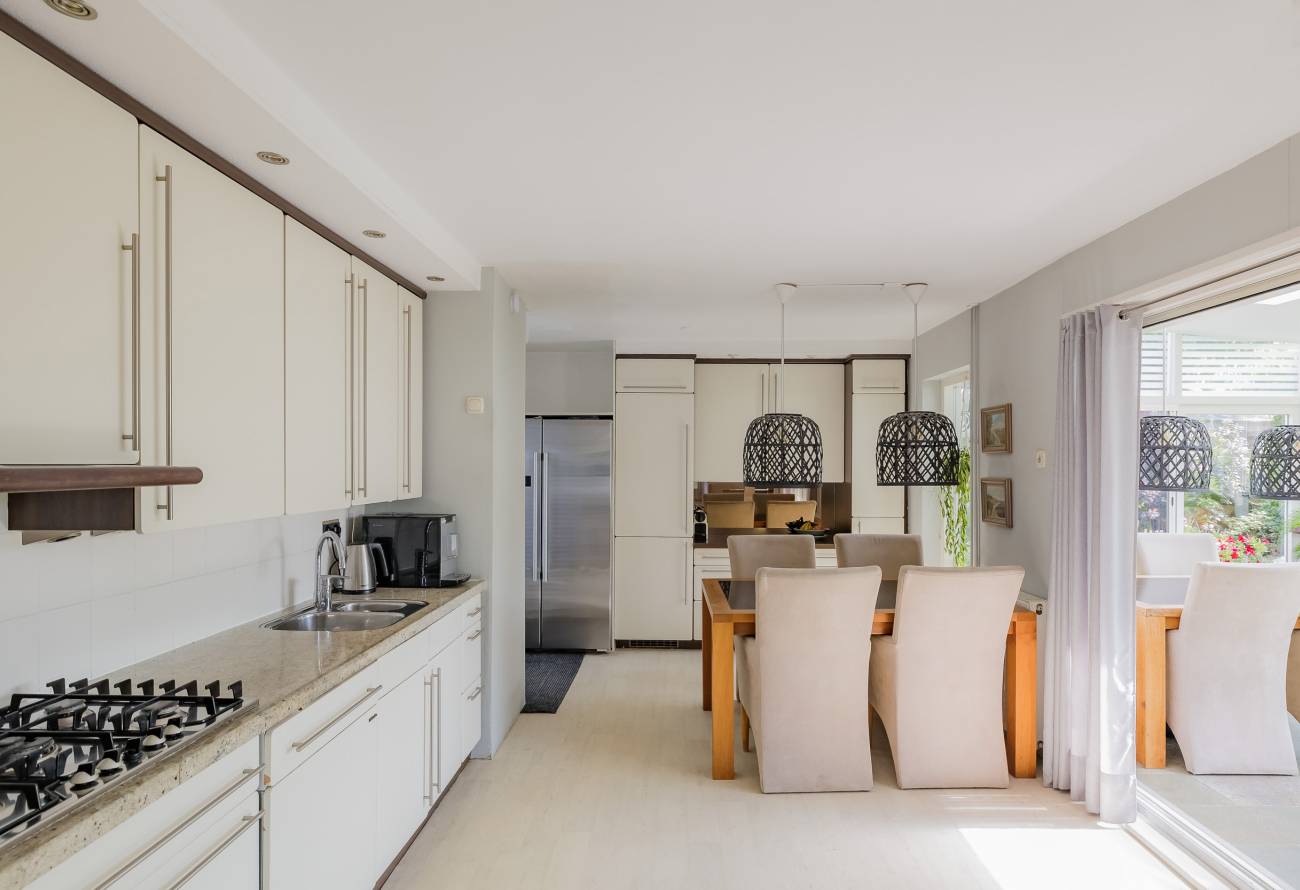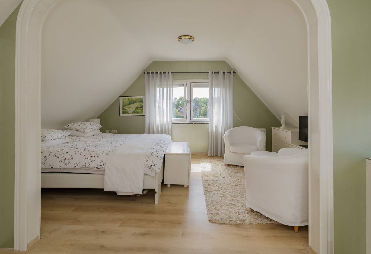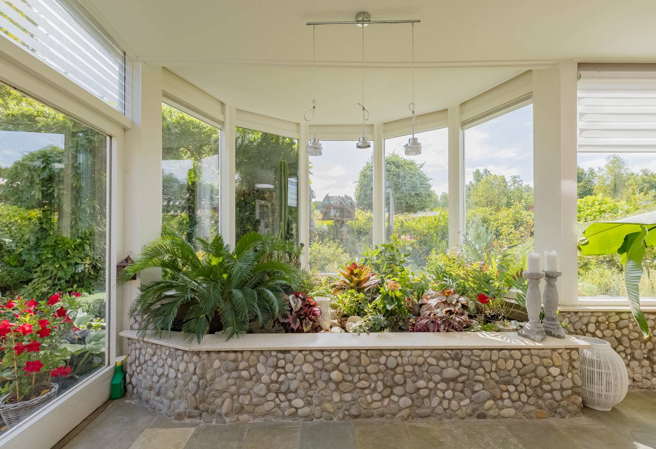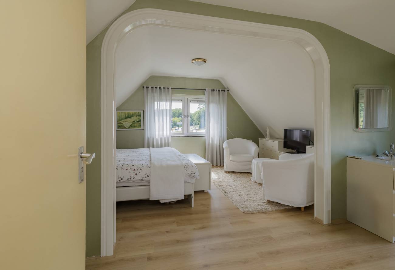 Een absolute eyecatcher is de aangebouwde serre/tuinkamer: een lichte ruimte met drie dakkoepels, vele ramen en openslaande deuren naar de tuin. Hier zijn binnen en buiten prachtig verbonden. De aanwezige houtkachel maakt dit bovendien een plek waar je het hele jaar door in knusse sfeer kunt genieten – van zonnige ochtenden tot winterse avonden.