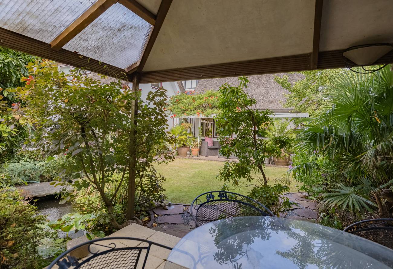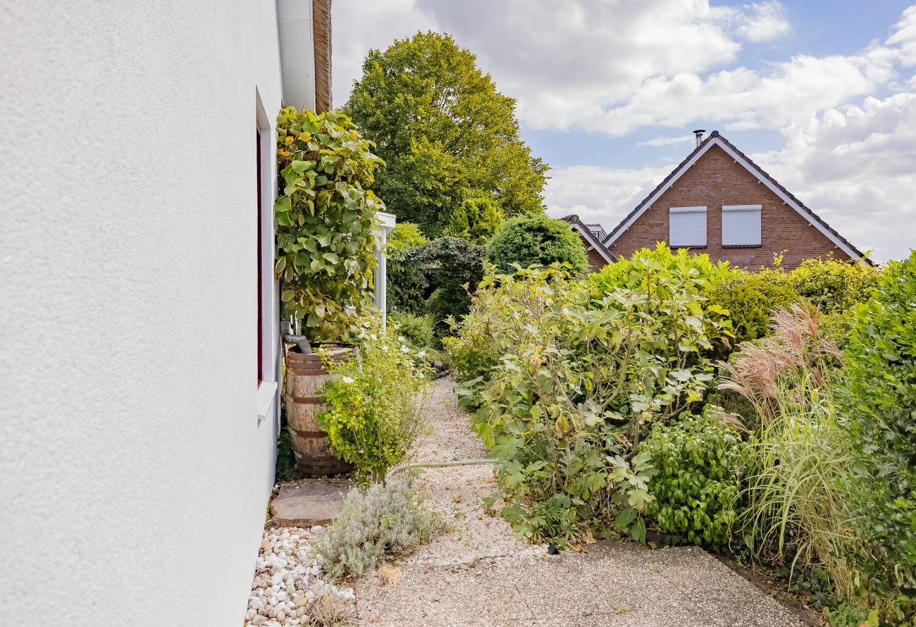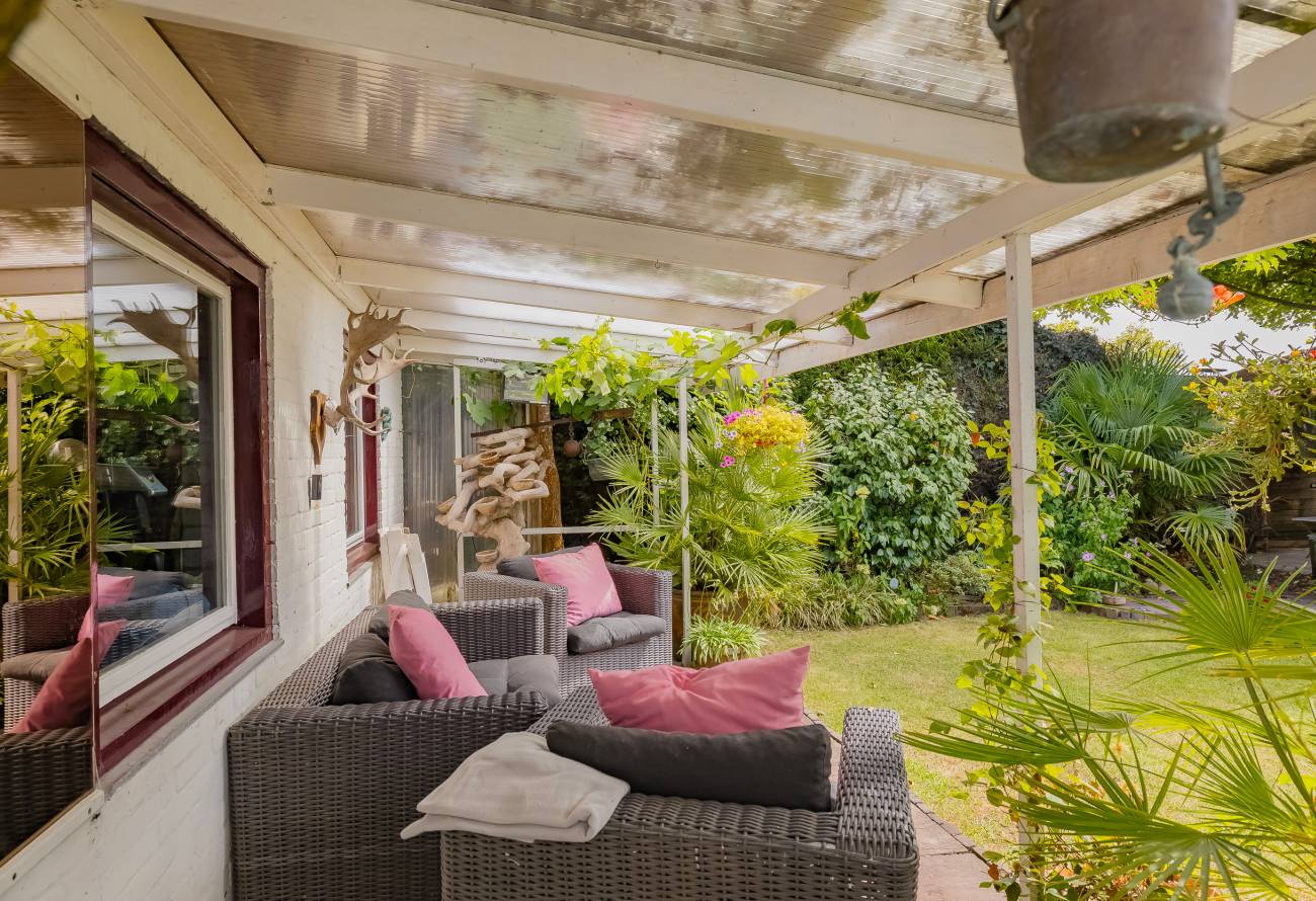 De tuin rondom de woning is fraai aangelegd en biedt verschillende terrassen om optimaal van zon en privacy te genieten. Verder beschikt de tuin over een vijver met vissen, een veranda aan de garage en een prieel achterin – perfect voor lange zomeravonden. De ruime vrijstaande garage is uitgevoerd in dezelfde stijl als de woning, met spouwmuur, elektra, dubbele deuren en een losse loopdeur. Via een ladder is de vliering bereikbaar, ideaal als extra bergruimte.