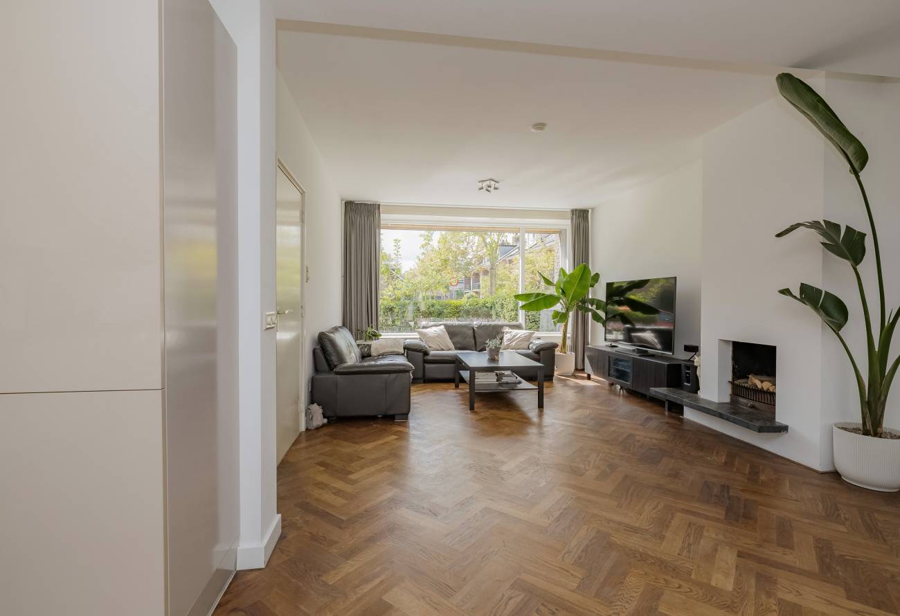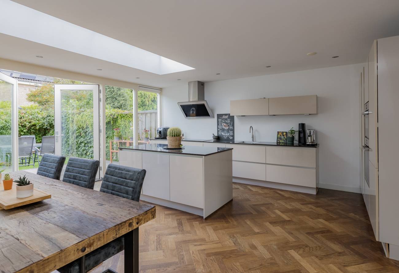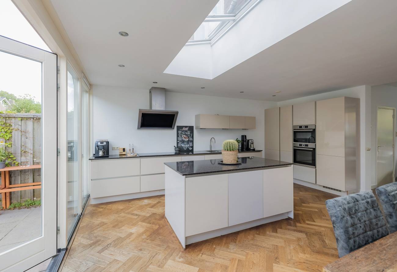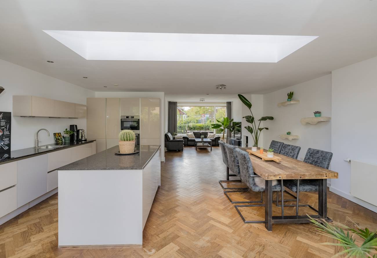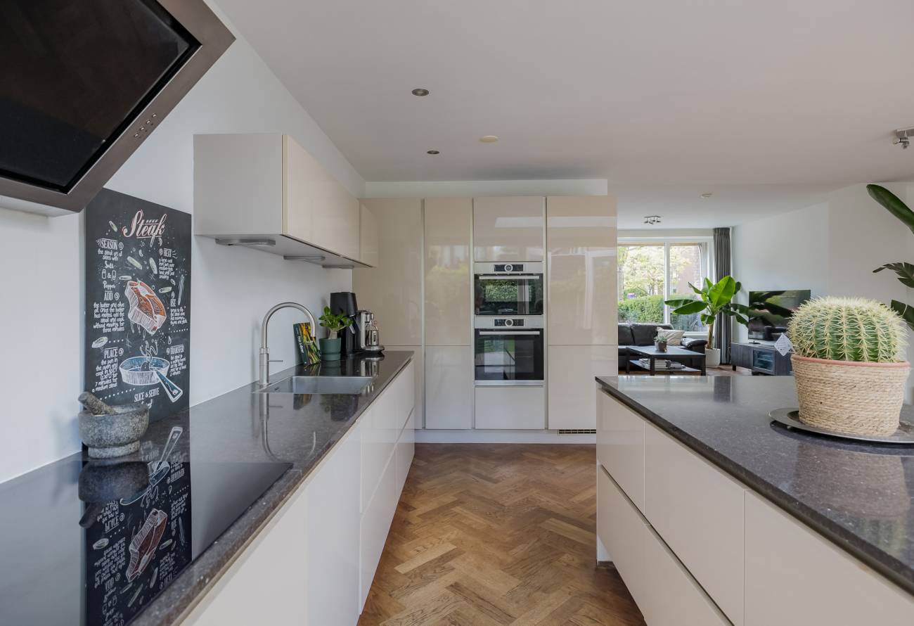 Binnenkomst in een ruime hal met meterkast, handige provisiekast en een modern toilet met fonteintje. De woonkamer is licht en ruim, met vrij uitzicht, een sfeervolle open haard en openslaande deuren naar de tuin, op de vloer ligt een fraaie houtenvloer in visgraat. De muren zijn voorzien van strak stucwerk. De keuken heeft een moderne uitstraling in lichte tinten en is voorzien van luxe inbouwapparatuur (2021-2023)  – ideaal voor kookliefhebbers.