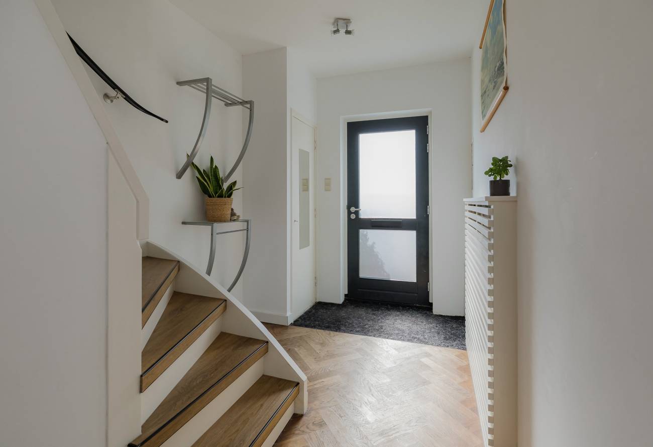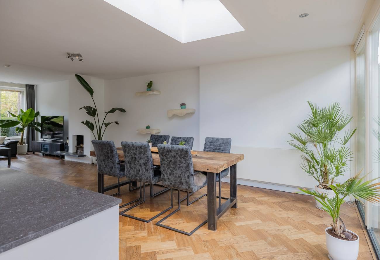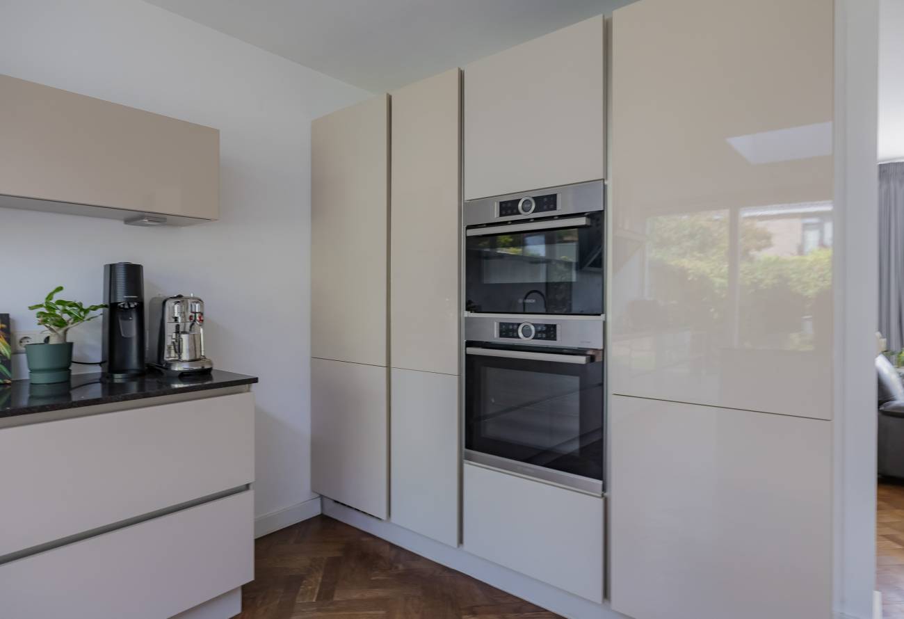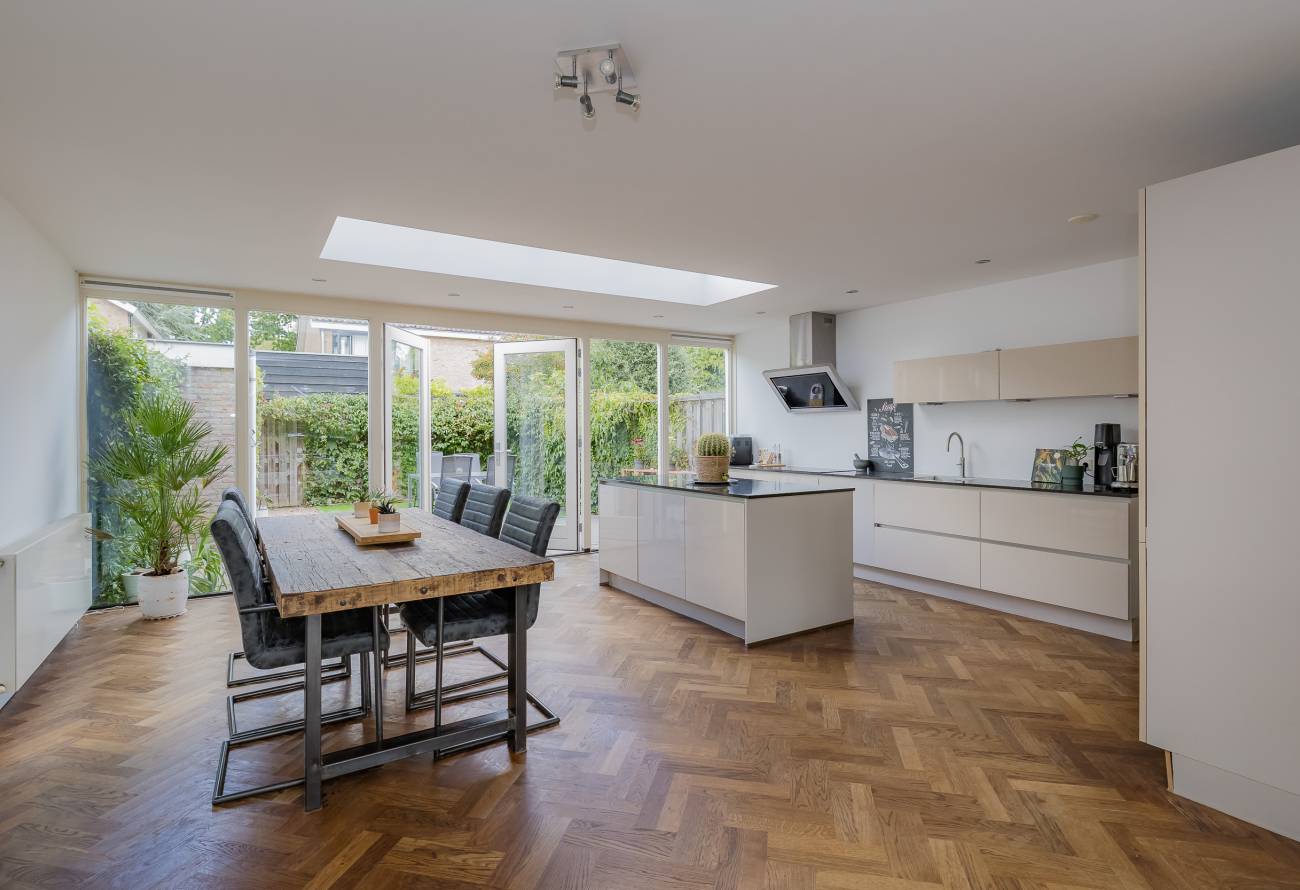 Binnenkomst in een ruime hal met meterkast, handige provisiekast en een modern toilet met fonteintje. De woonkamer is licht en ruim, met vrij uitzicht, een sfeervolle open haard en openslaande deuren naar de tuin, op de vloer ligt een fraaie houtenvloer in visgraat. De muren zijn voorzien van strak stucwerk. De keuken heeft een moderne uitstraling in lichte tinten en is voorzien van luxe inbouwapparatuur (2021-2023)  – ideaal voor kookliefhebbers.