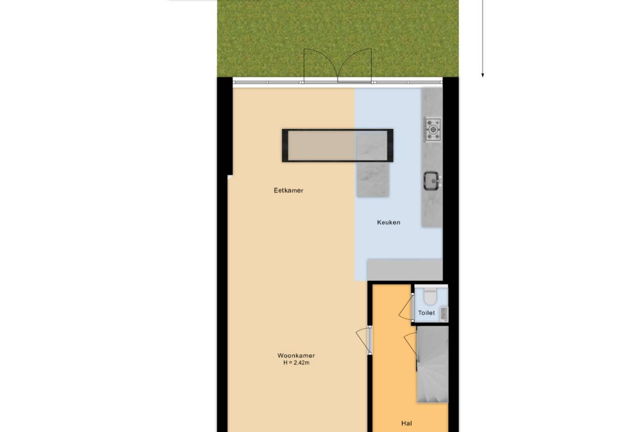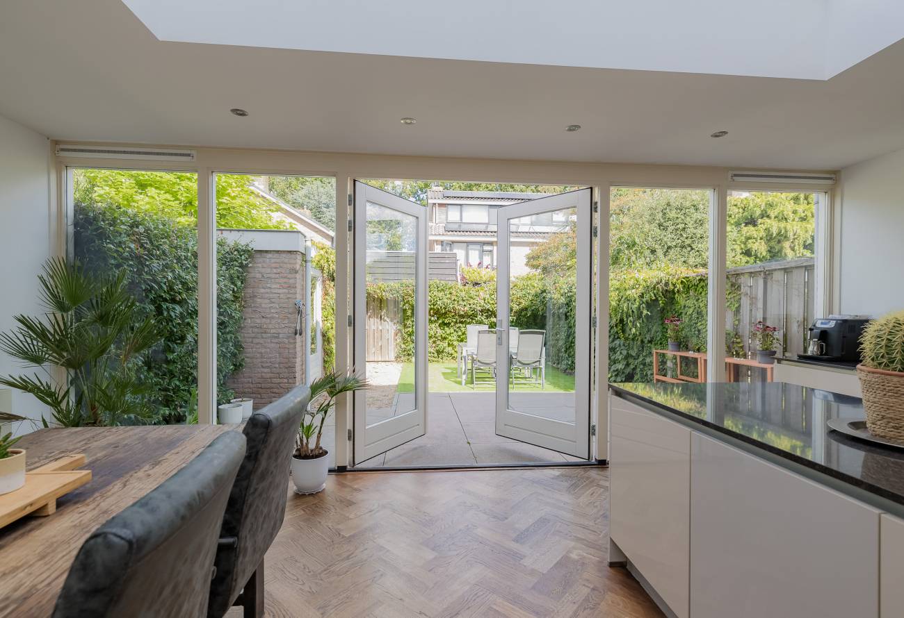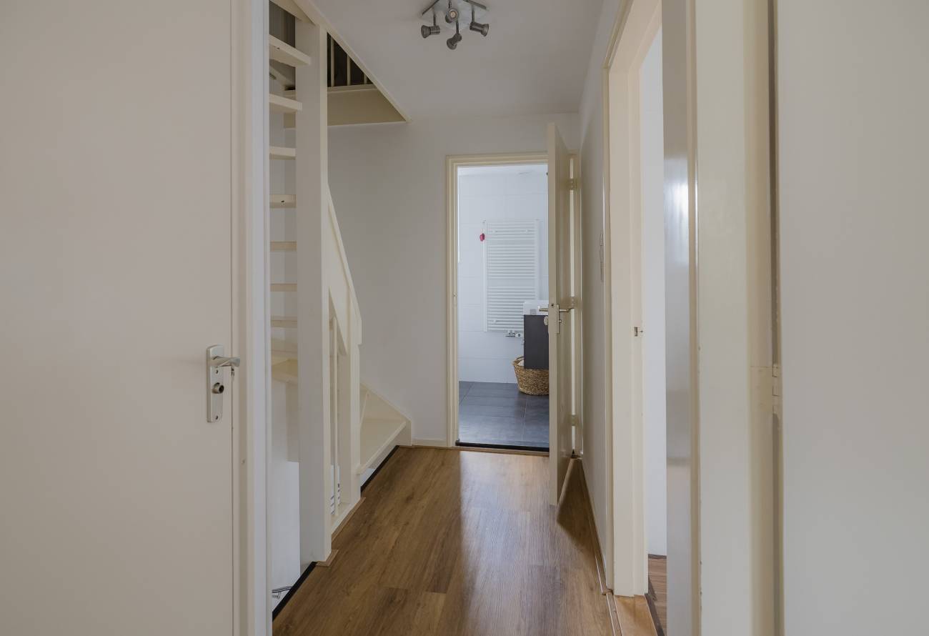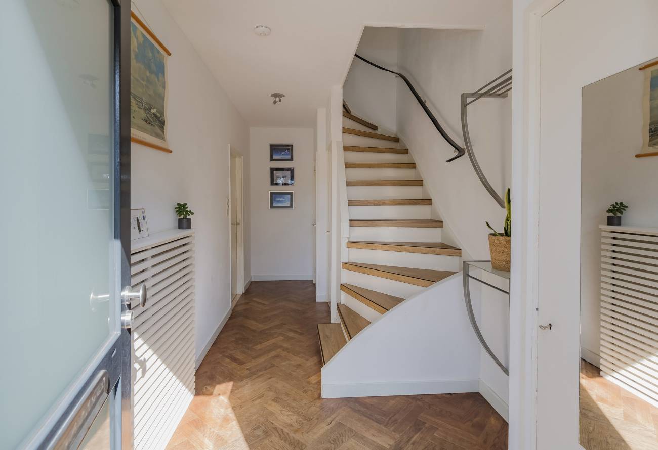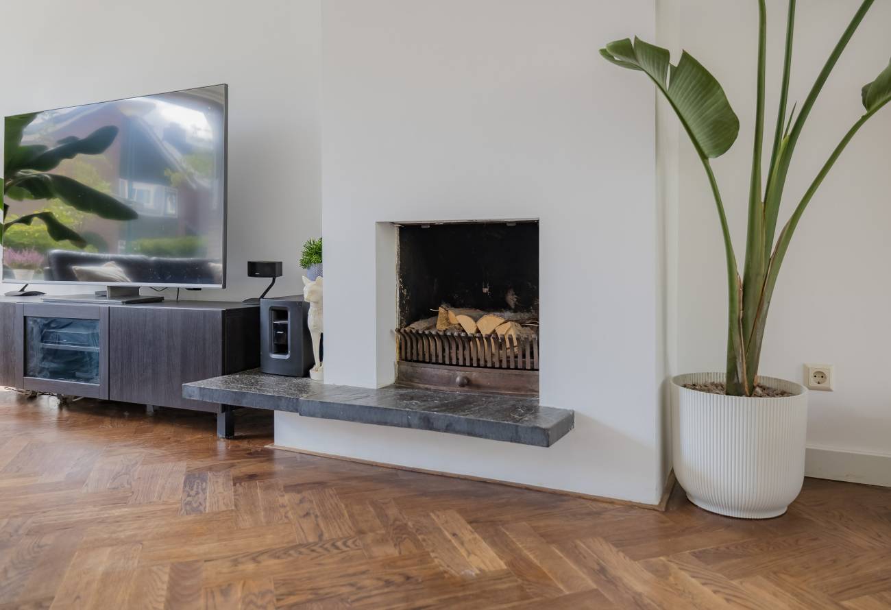 Binnenkomst in een ruime hal met meterkast, handige provisiekast en een modern toilet met fonteintje. De woonkamer is licht en ruim, met vrij uitzicht, een sfeervolle open haard en openslaande deuren naar de tuin, op de vloer ligt een fraaie houtenvloer in visgraat. De muren zijn voorzien van strak stucwerk. De keuken heeft een moderne uitstraling in lichte tinten en is voorzien van luxe inbouwapparatuur (2021-2023)  – ideaal voor kookliefhebbers.