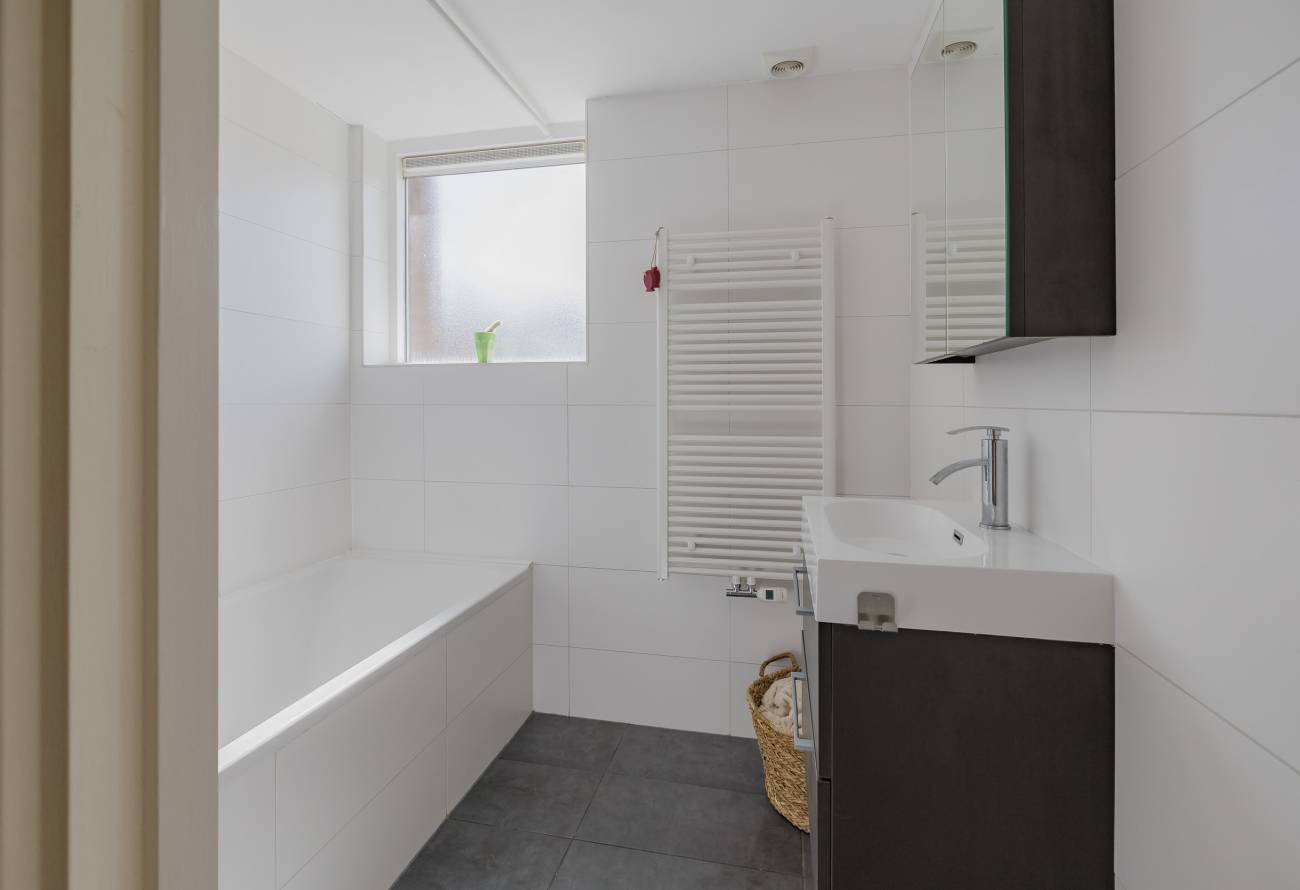De moderne badkamer beschikt over een fijn ligbad met douchegelegenheid, wastafel, handdoekradiator en een raam voor daglicht en ventilatie.