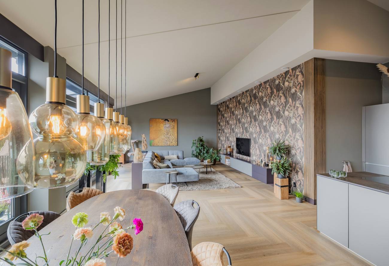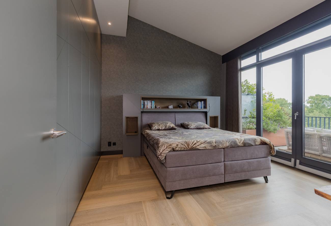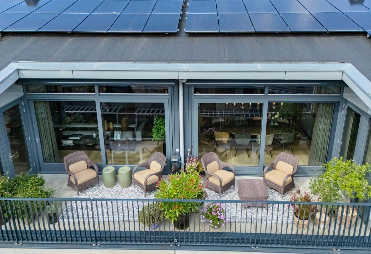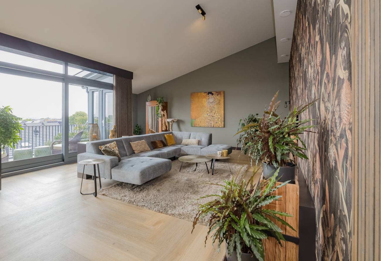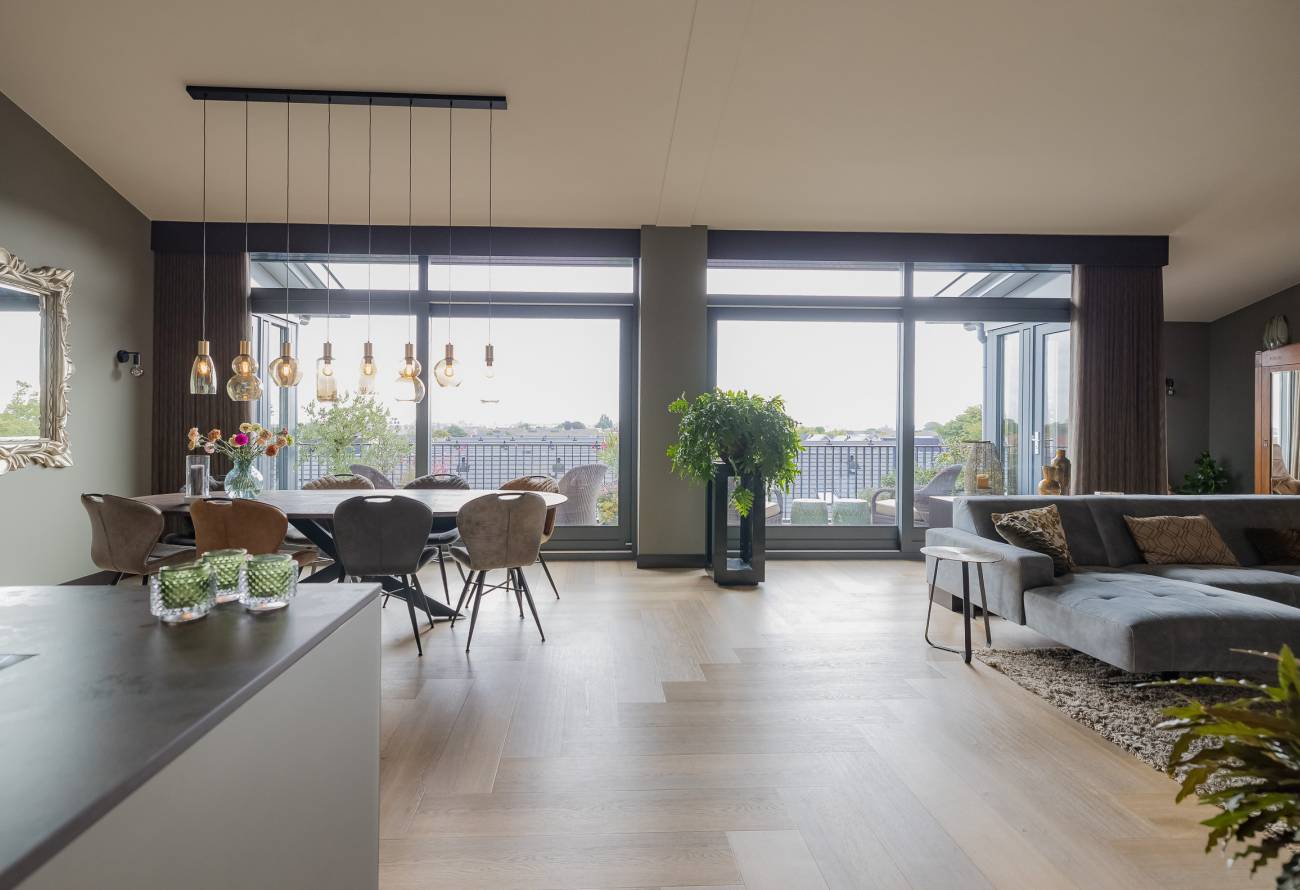 Je woont op de bovenste etage, waar de hoge plafonds en grote schuifpuien voor een heerlijk ruimtelijk gevoel zorgen. In het gehele appartement is gebruikt gemaakt van fraaie natuur, hout en grijstinten die perfect op elkaar zijn afgestemd.