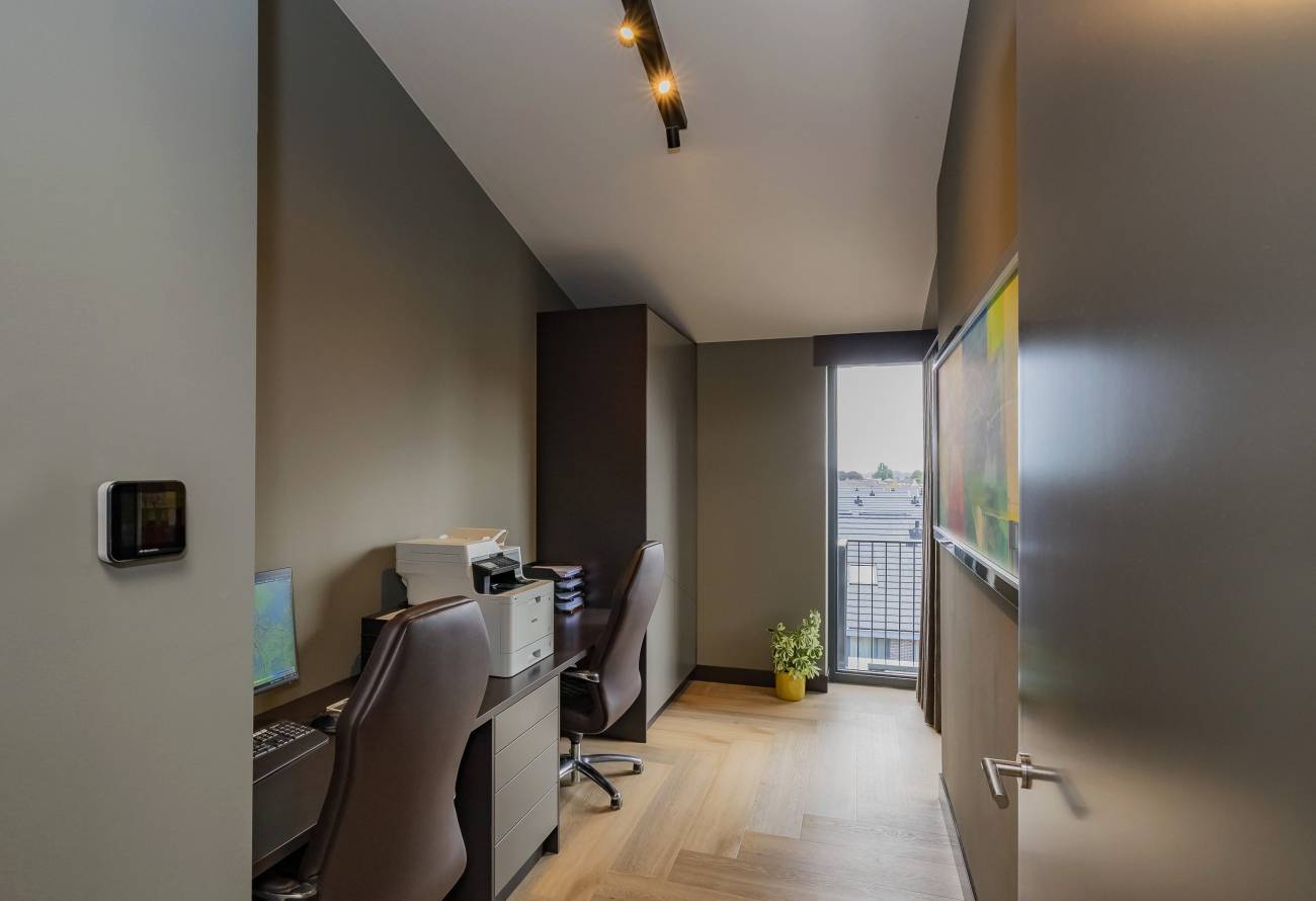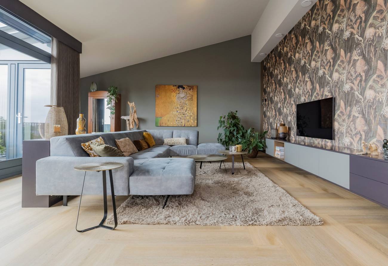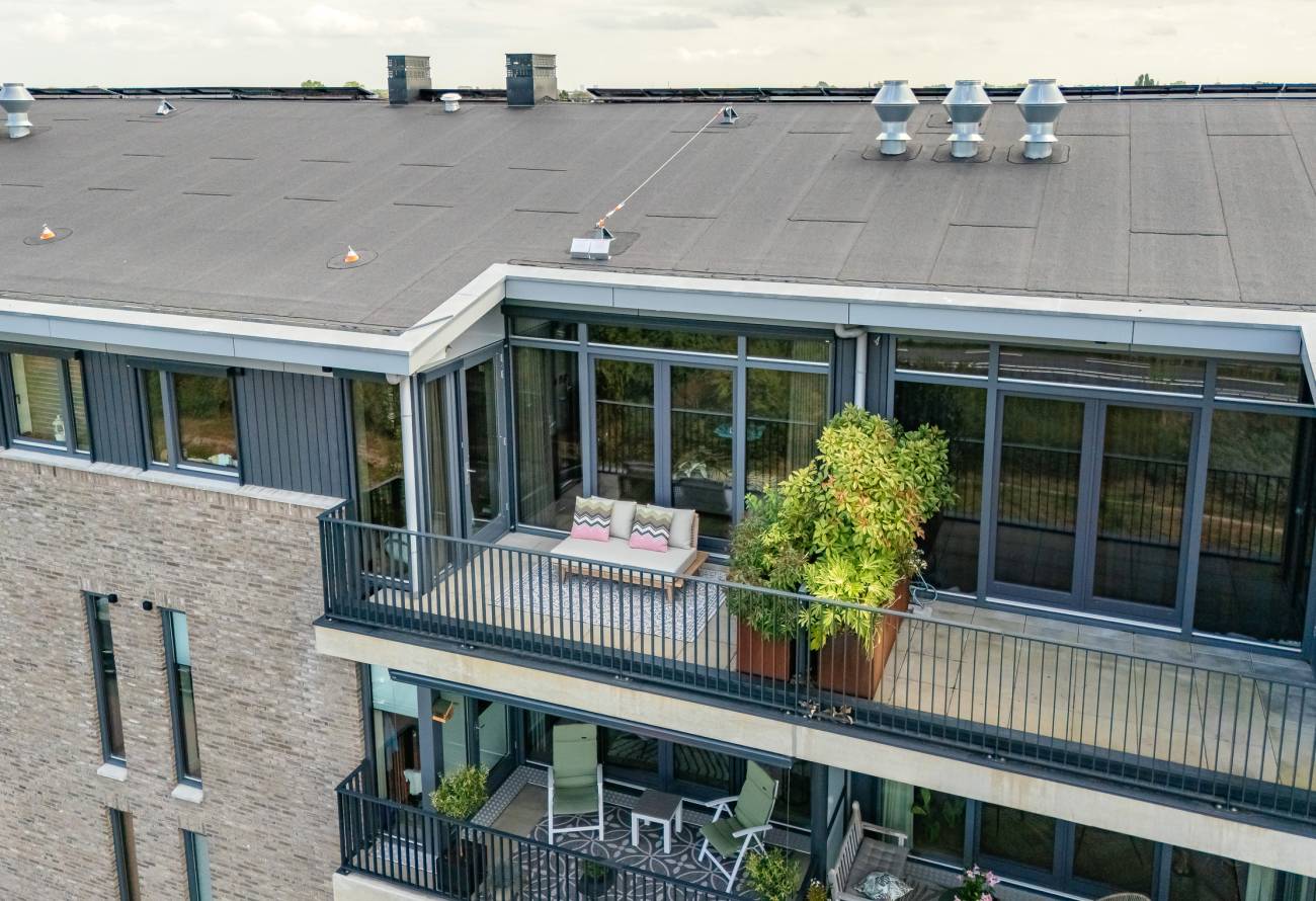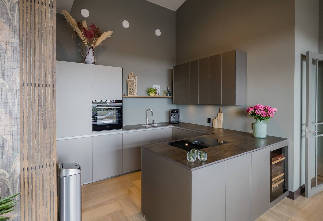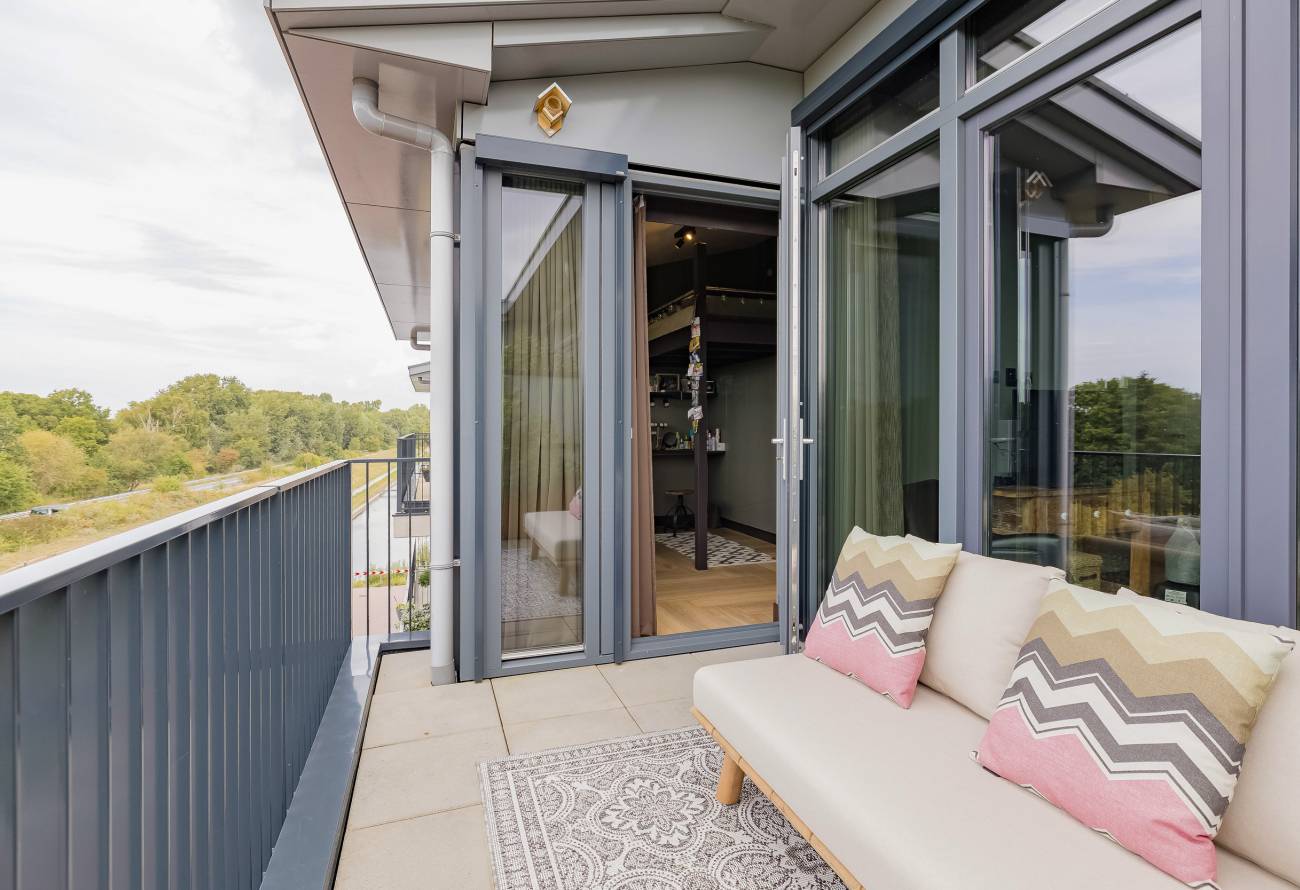 Je woont op de bovenste etage, waar de hoge plafonds en grote schuifpuien voor een heerlijk ruimtelijk gevoel zorgen. In het gehele appartement is gebruikt gemaakt van fraaie natuur, hout en grijstinten die perfect op elkaar zijn afgestemd.