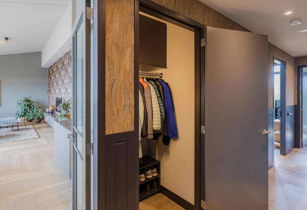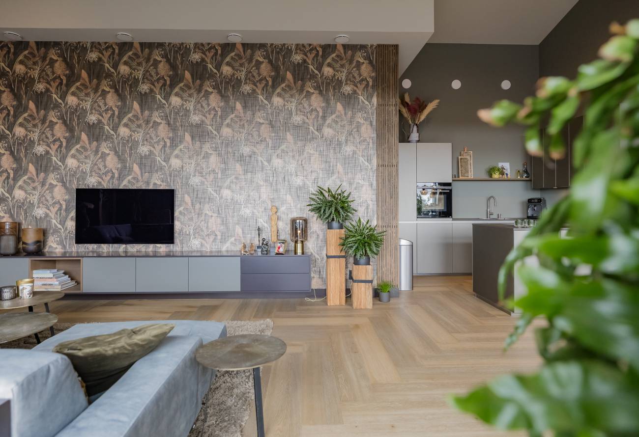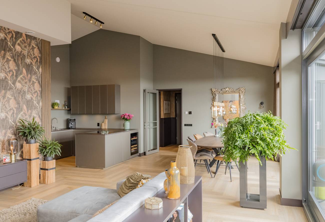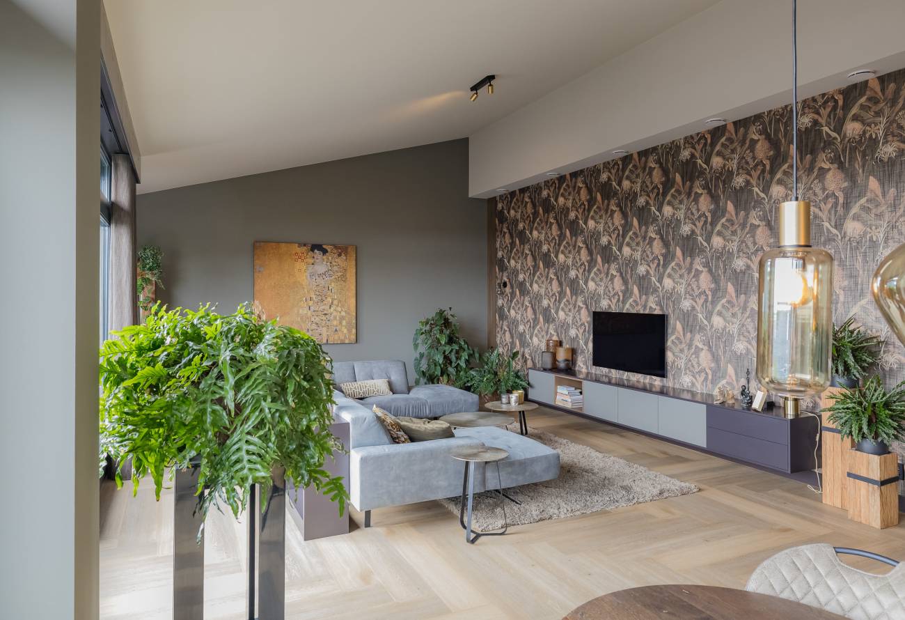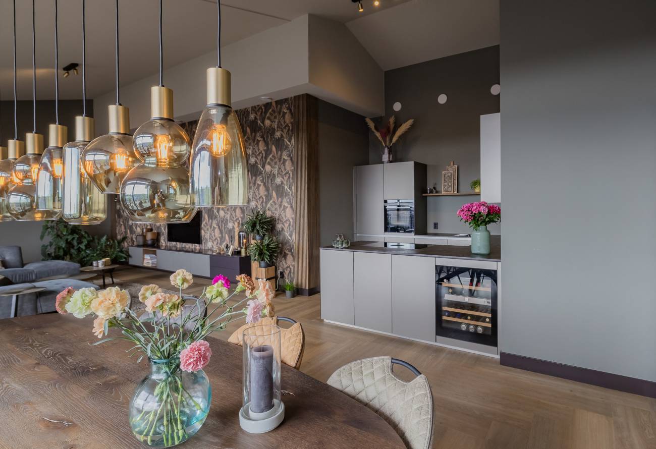 Je woont op de bovenste etage, waar de hoge plafonds en grote schuifpuien voor een heerlijk ruimtelijk gevoel zorgen. In het gehele appartement is gebruikt gemaakt van fraaie natuur, hout en grijstinten die perfect op elkaar zijn afgestemd.