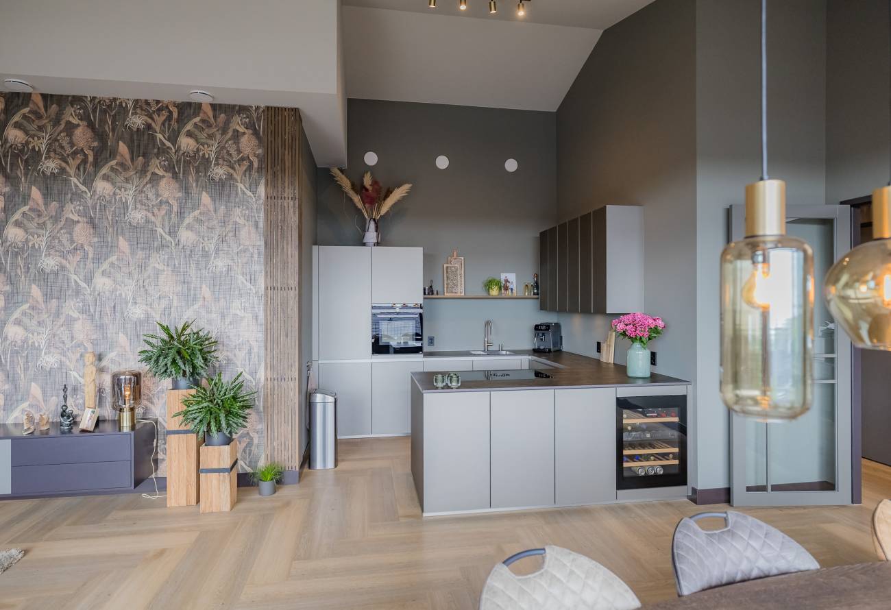 De open keuken is strak en modern, compleet met luxe inbouwapparatuur zoals een Quooker, klimaatkoelkast en combinatie magnetronoven.