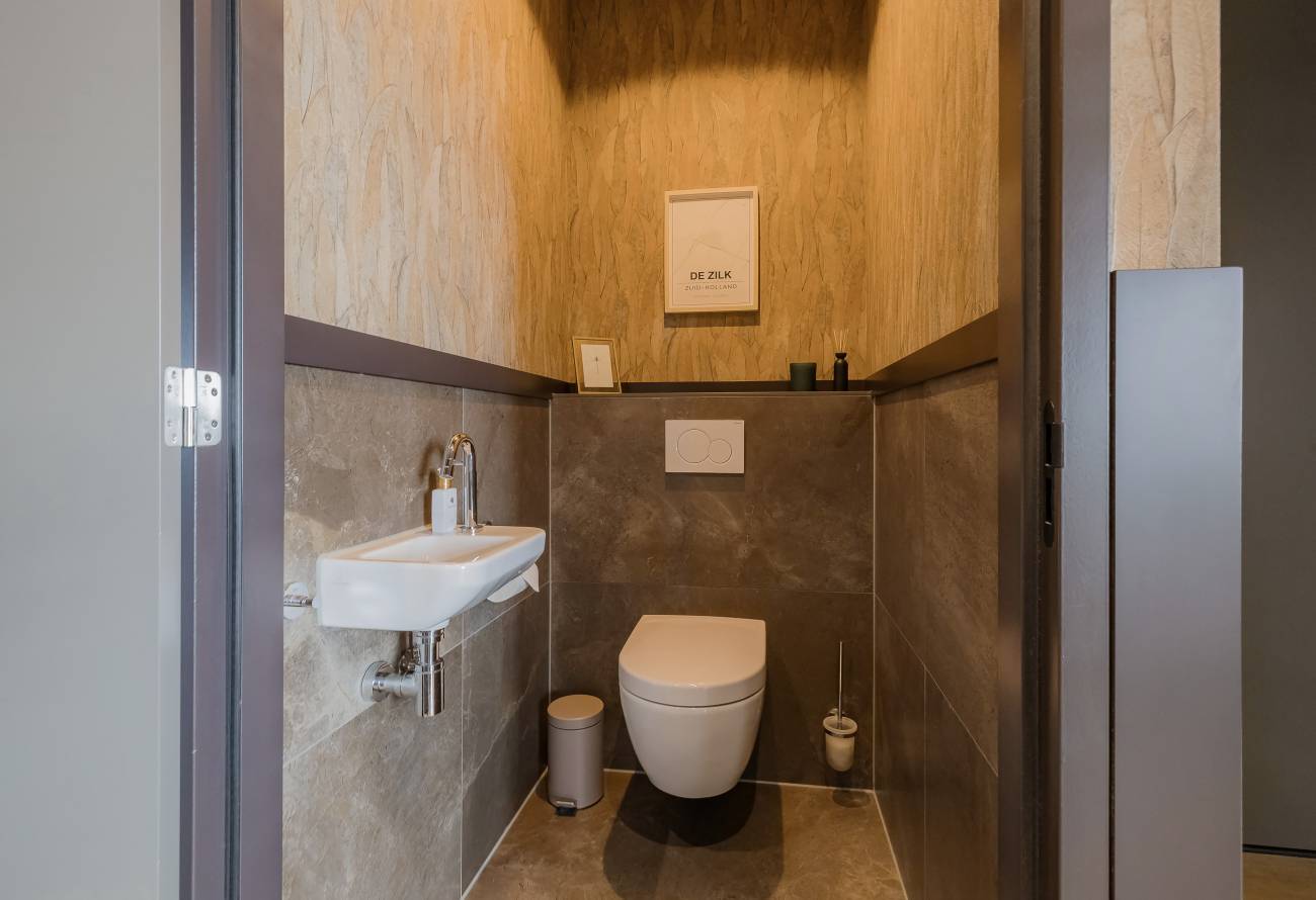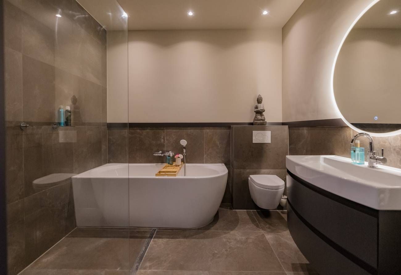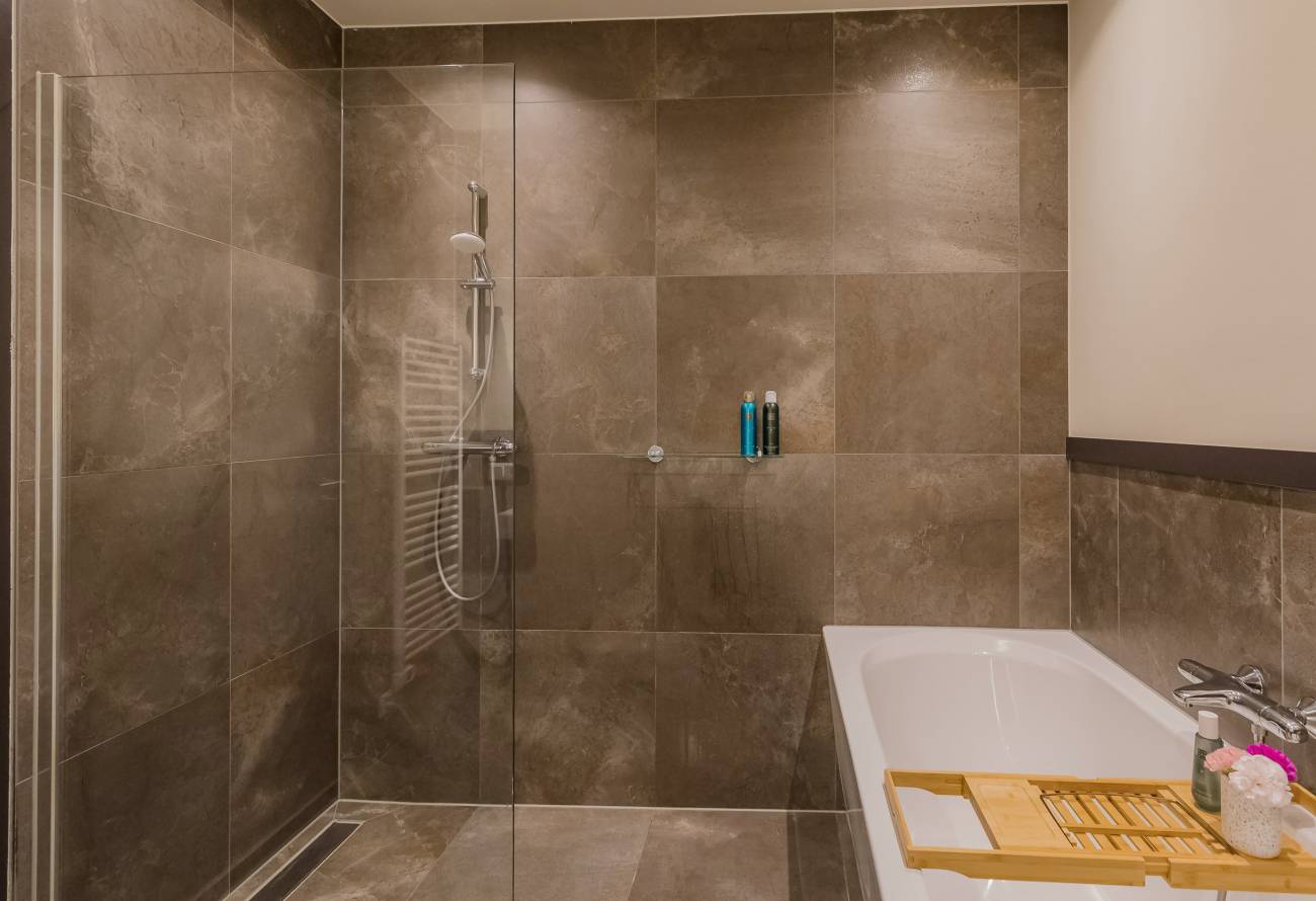 De badkamer is uitgevoerd in warme natuurtinten en voorzien van een ligbad, inloopdouche, toilet en een stijlvol wastafelmeubel.