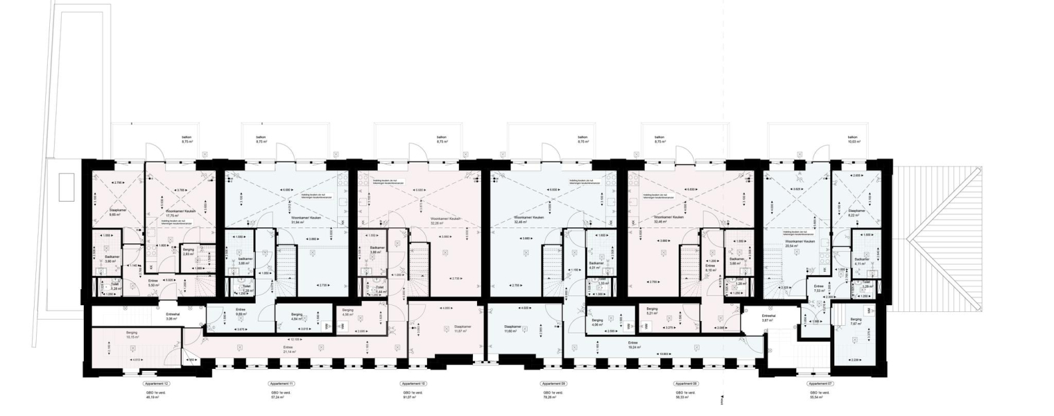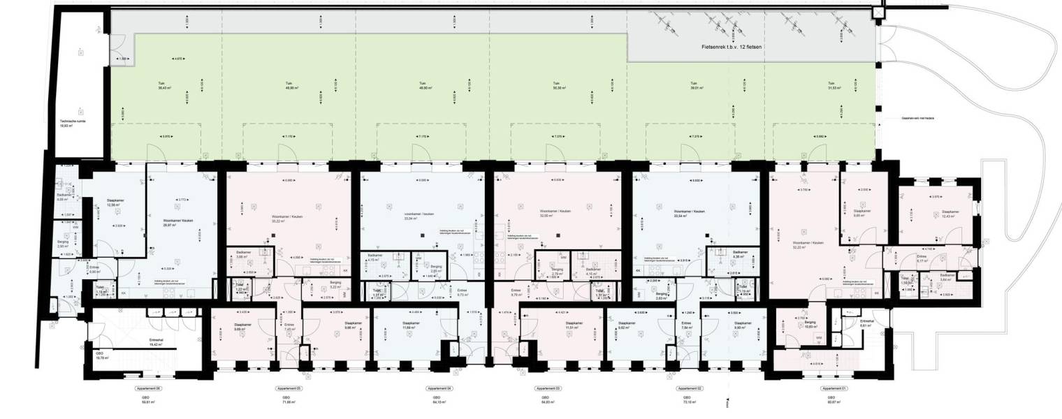 • De grootte van de begane grond appartementen varieert van ca. 60 m2 tot ca. 80 m2 en beschikken over 2 of 3 kamers.